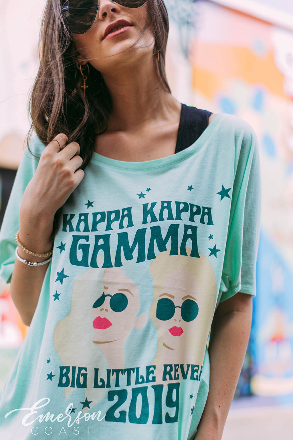 Tri Delta at Arkansas captured the magic of the Amalfi Coast for Bid Day with custom slouchy tees — white for members, cloud blue for new girls. Styled with flowy skirts and neck scarves, the whole vibe was straight out of a summer postcard.