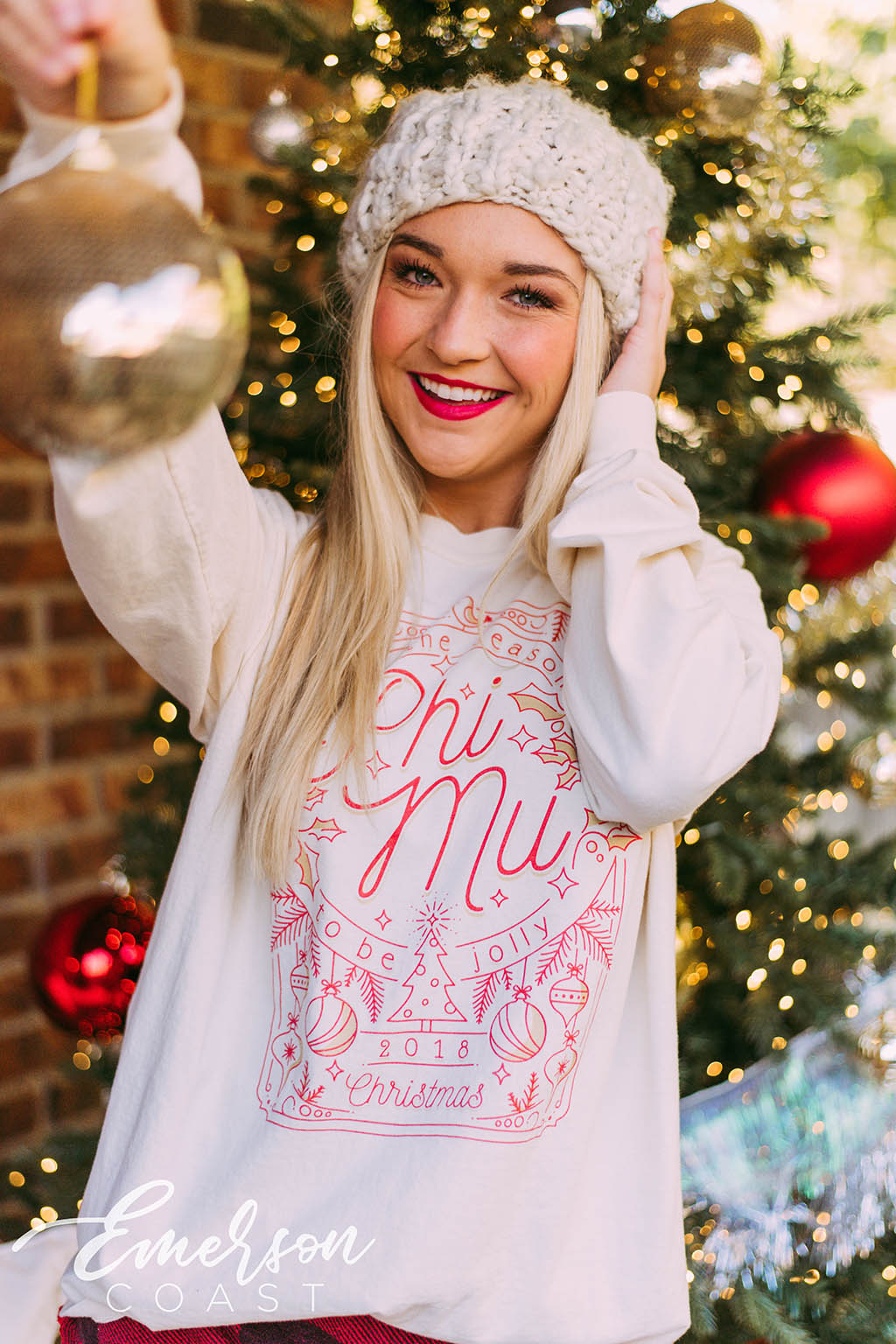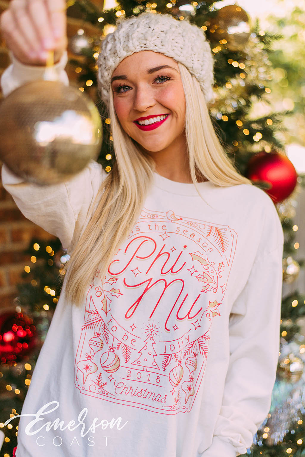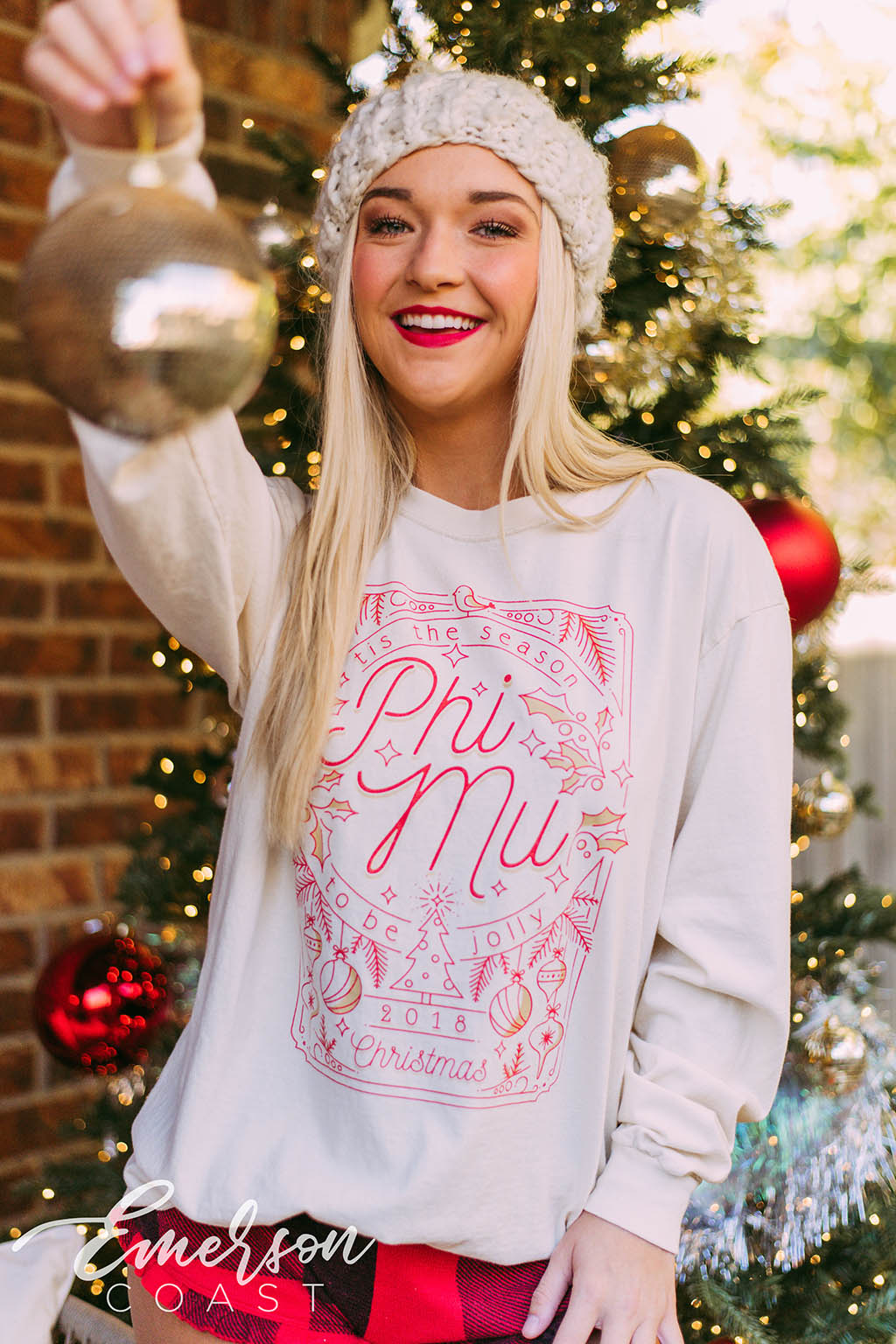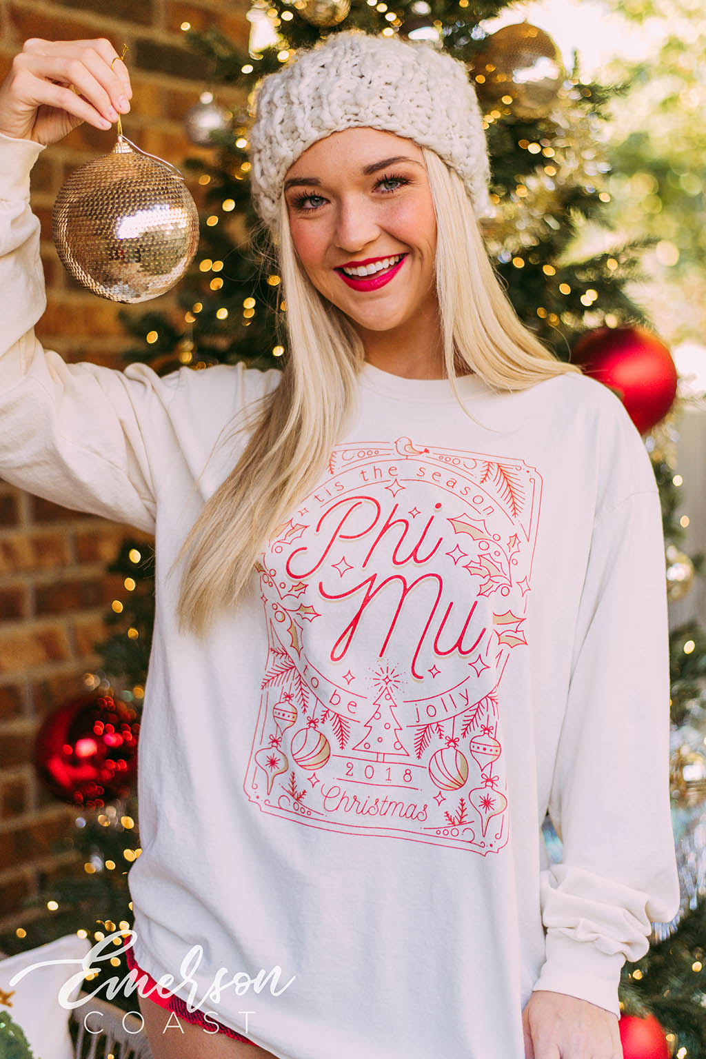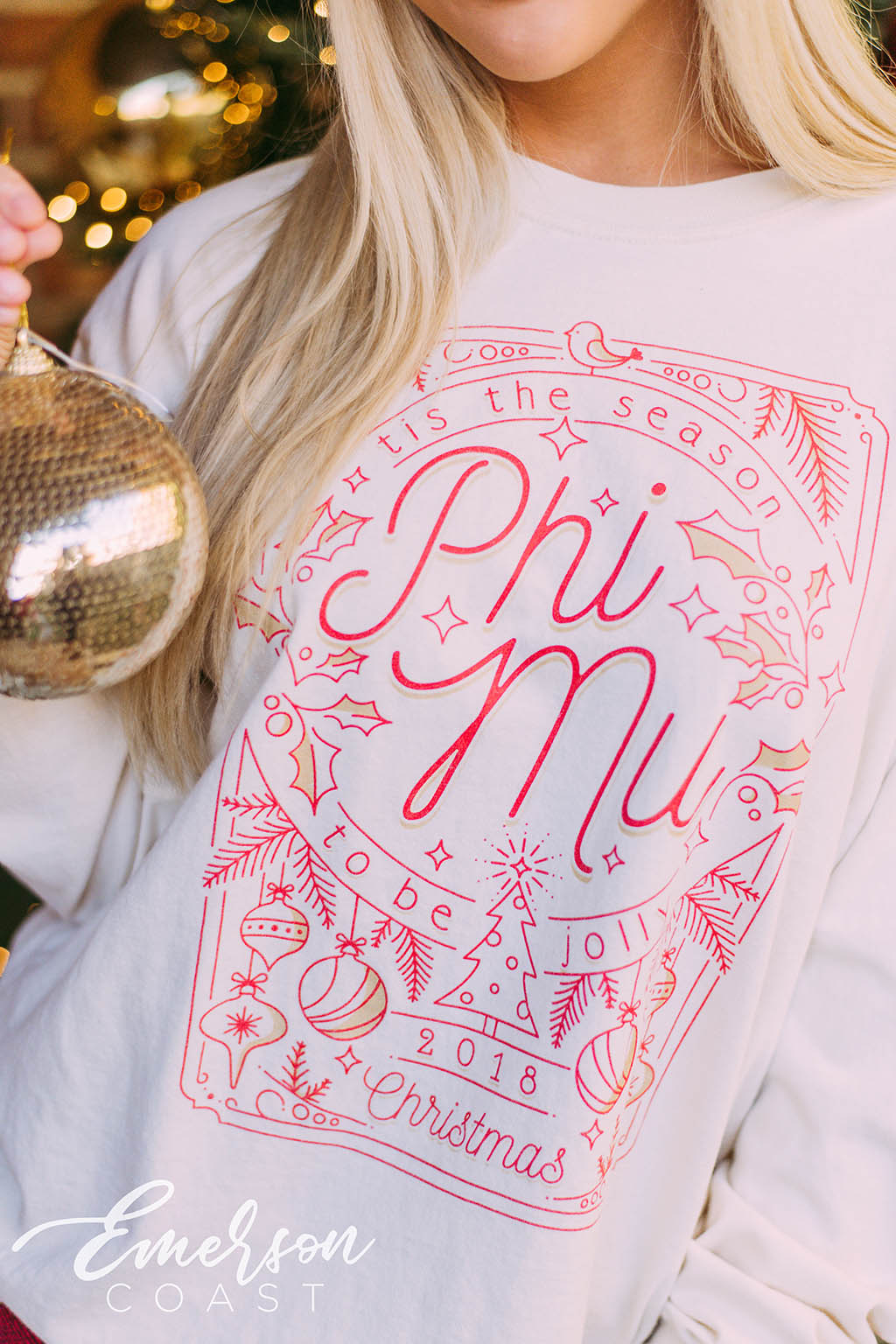 Be merry and bright with the Phi Mu Christmas Long Sleeve Tshirt!