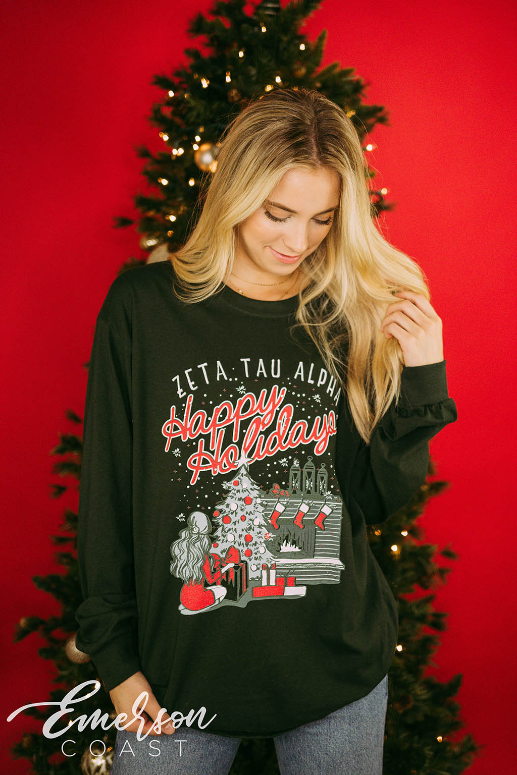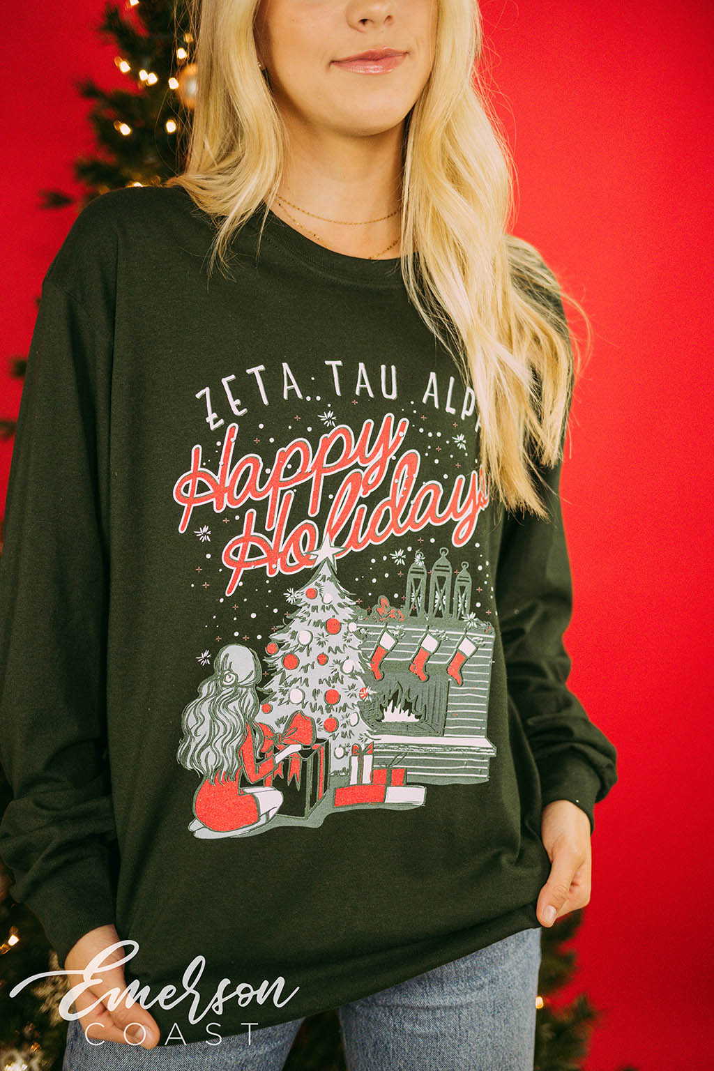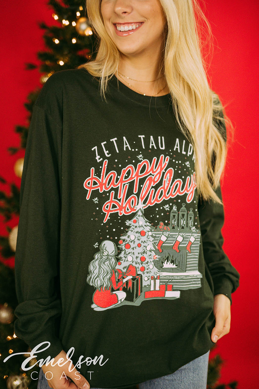 Get in the holiday spirit with the Zeta Tau Alpha Happy Holidays Long Sleeve Tee!