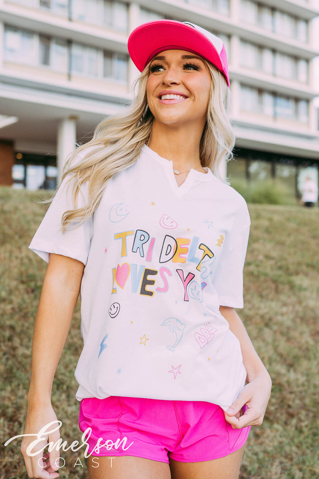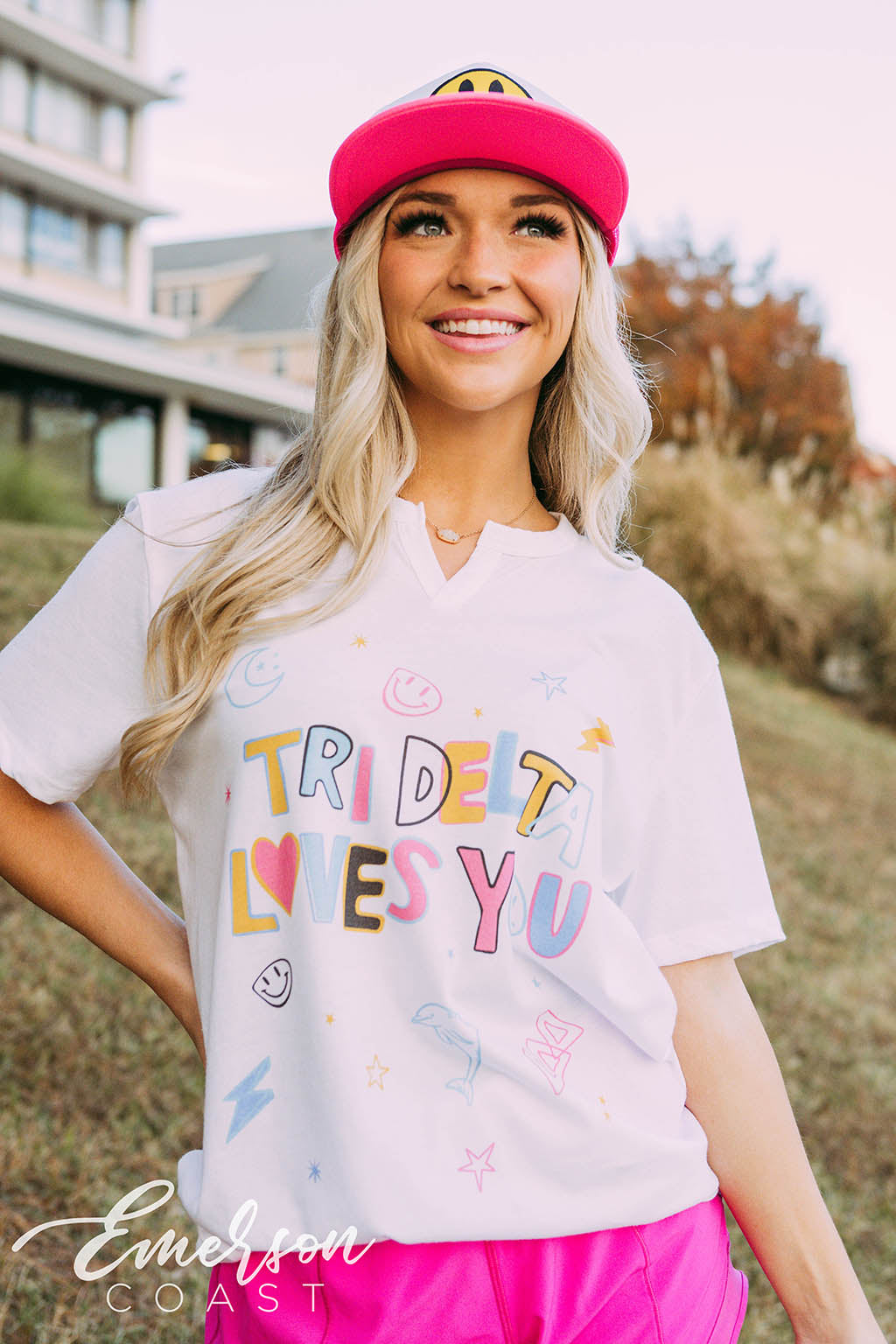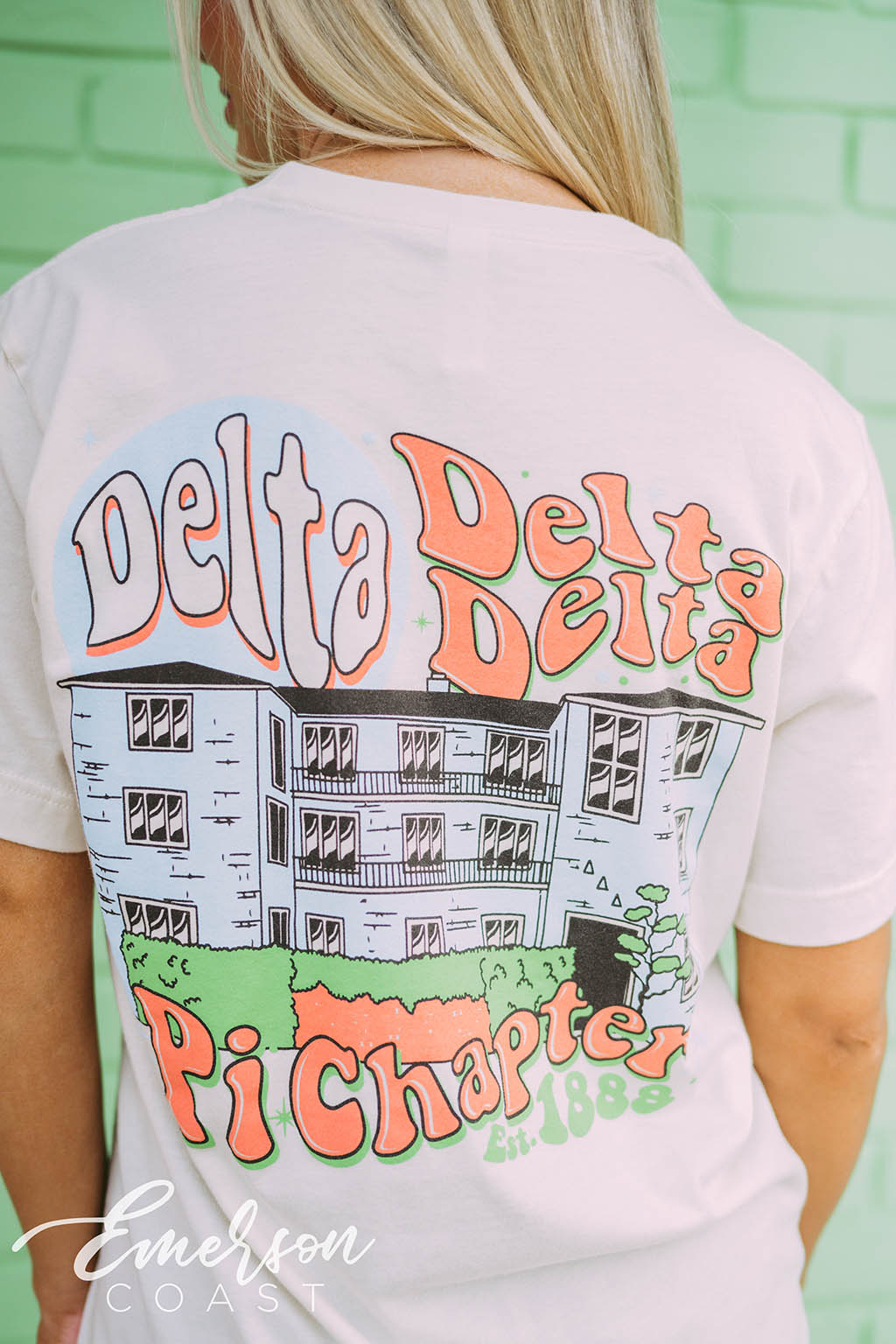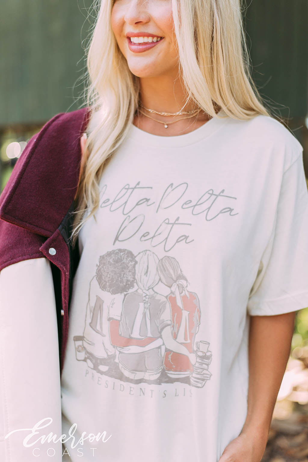 Tri Delta at Arkansas captured the magic of the Amalfi Coast for Bid Day with custom slouchy tees — white for members, cloud blue for new girls. Styled with flowy skirts and neck scarves, the whole vibe was straight out of a summer postcard.
