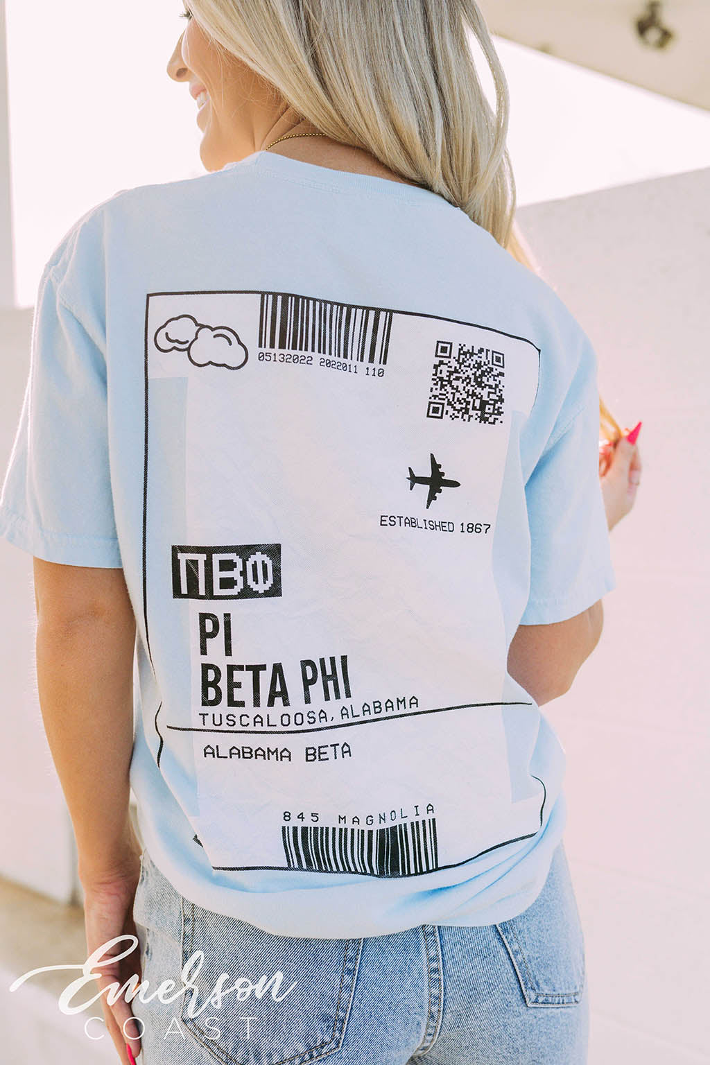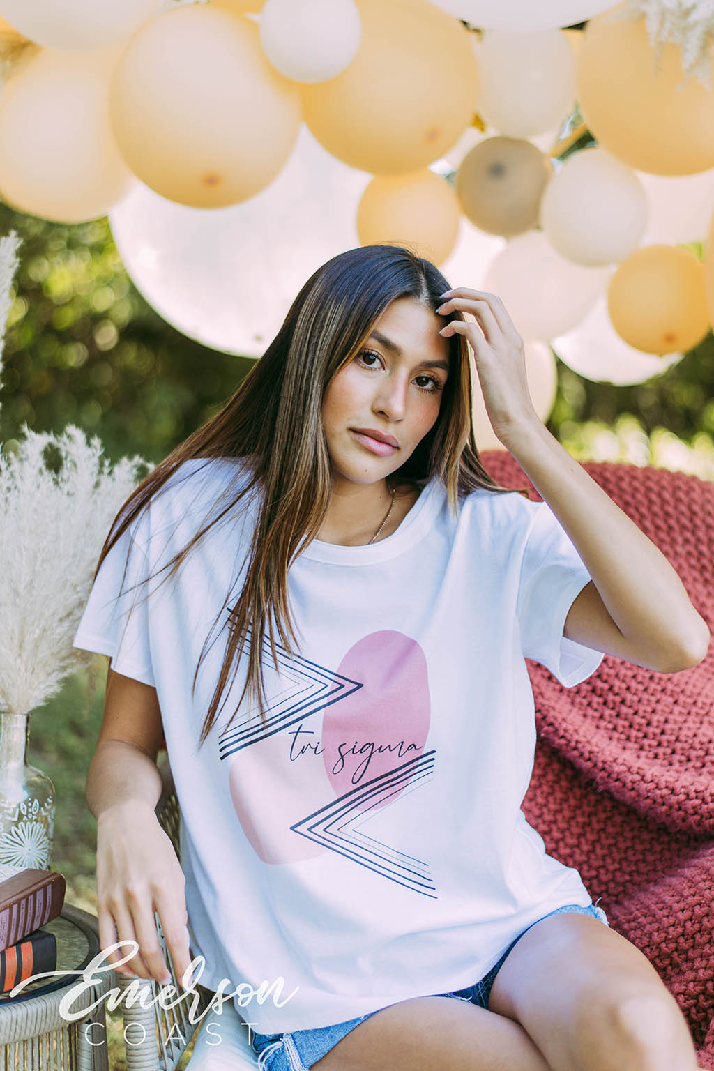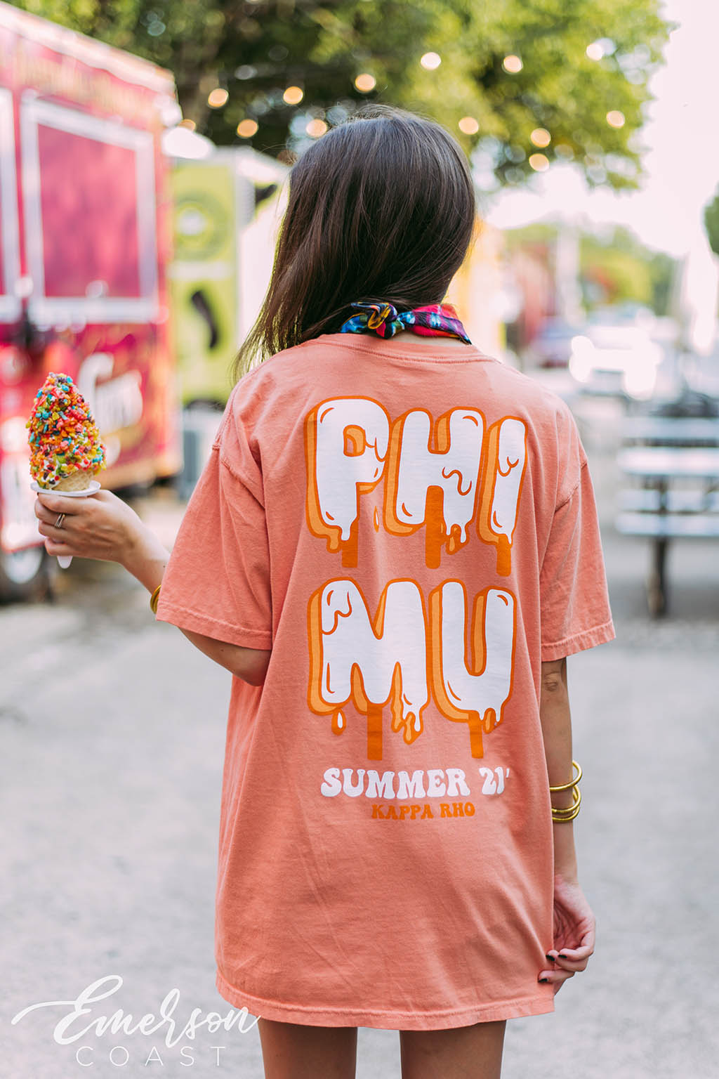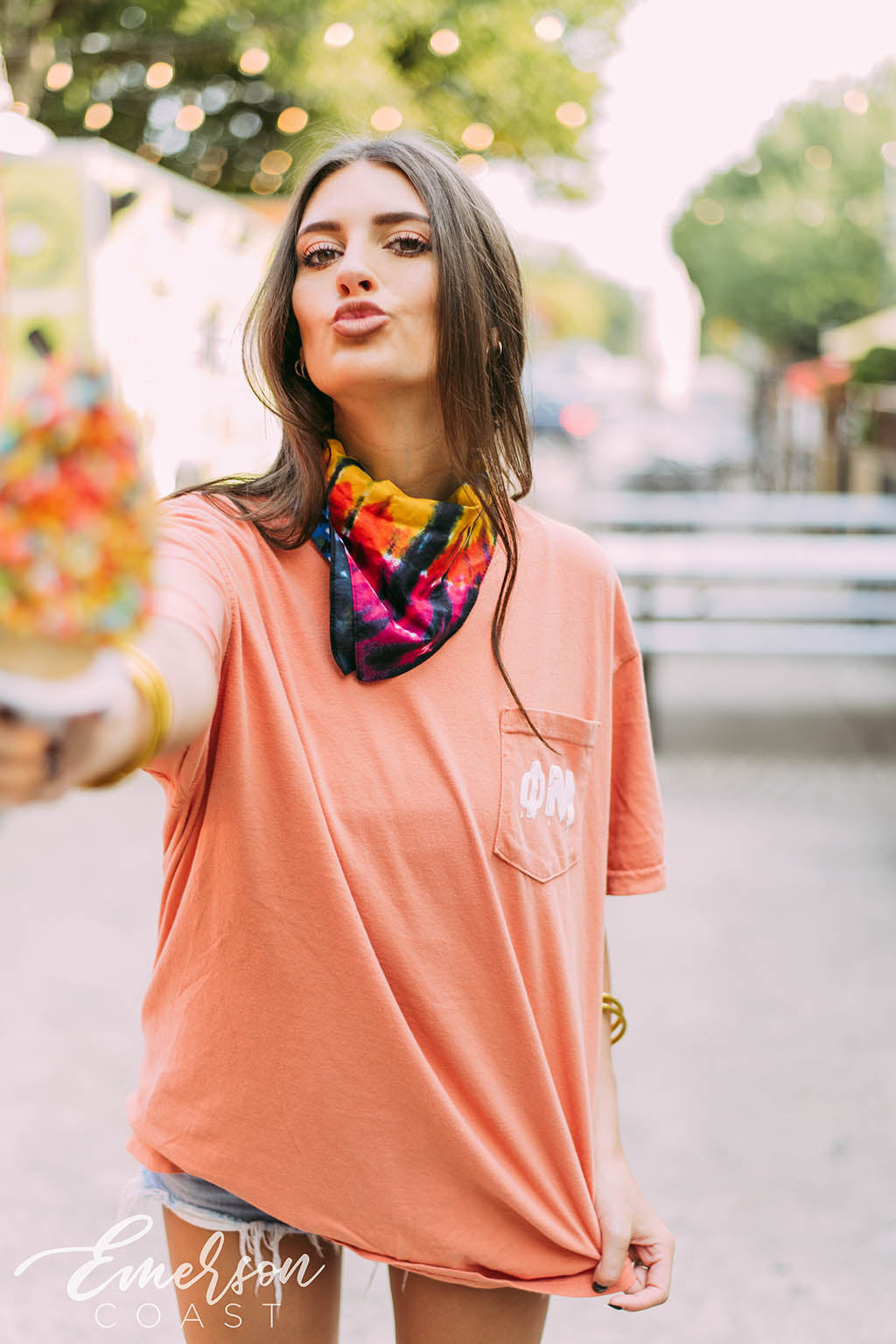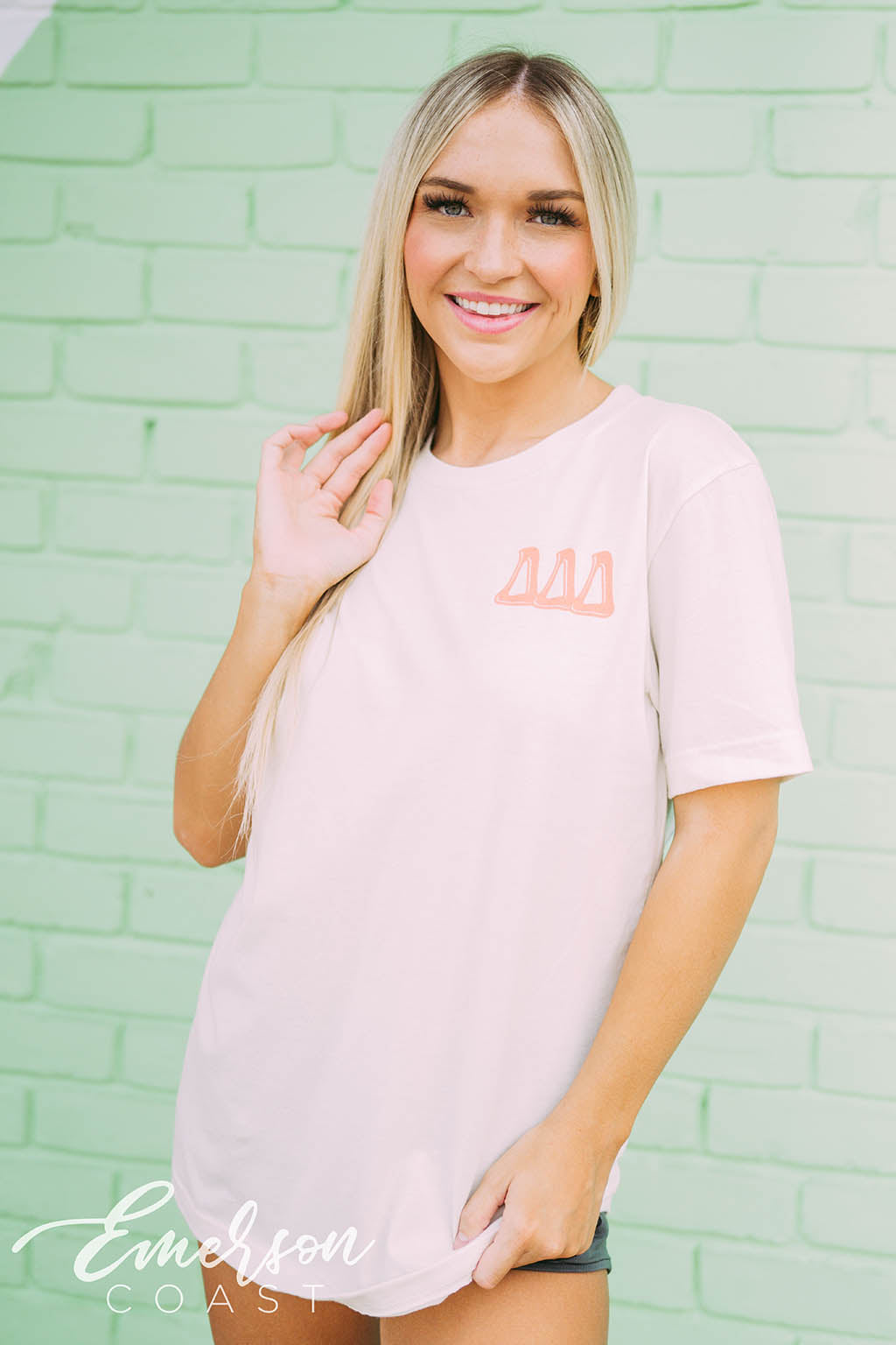 Tri Delta at Arkansas captured the magic of the Amalfi Coast for Bid Day with custom slouchy tees — white for members, cloud blue for new girls. Styled with flowy skirts and neck scarves, the whole vibe was straight out of a summer postcard.
