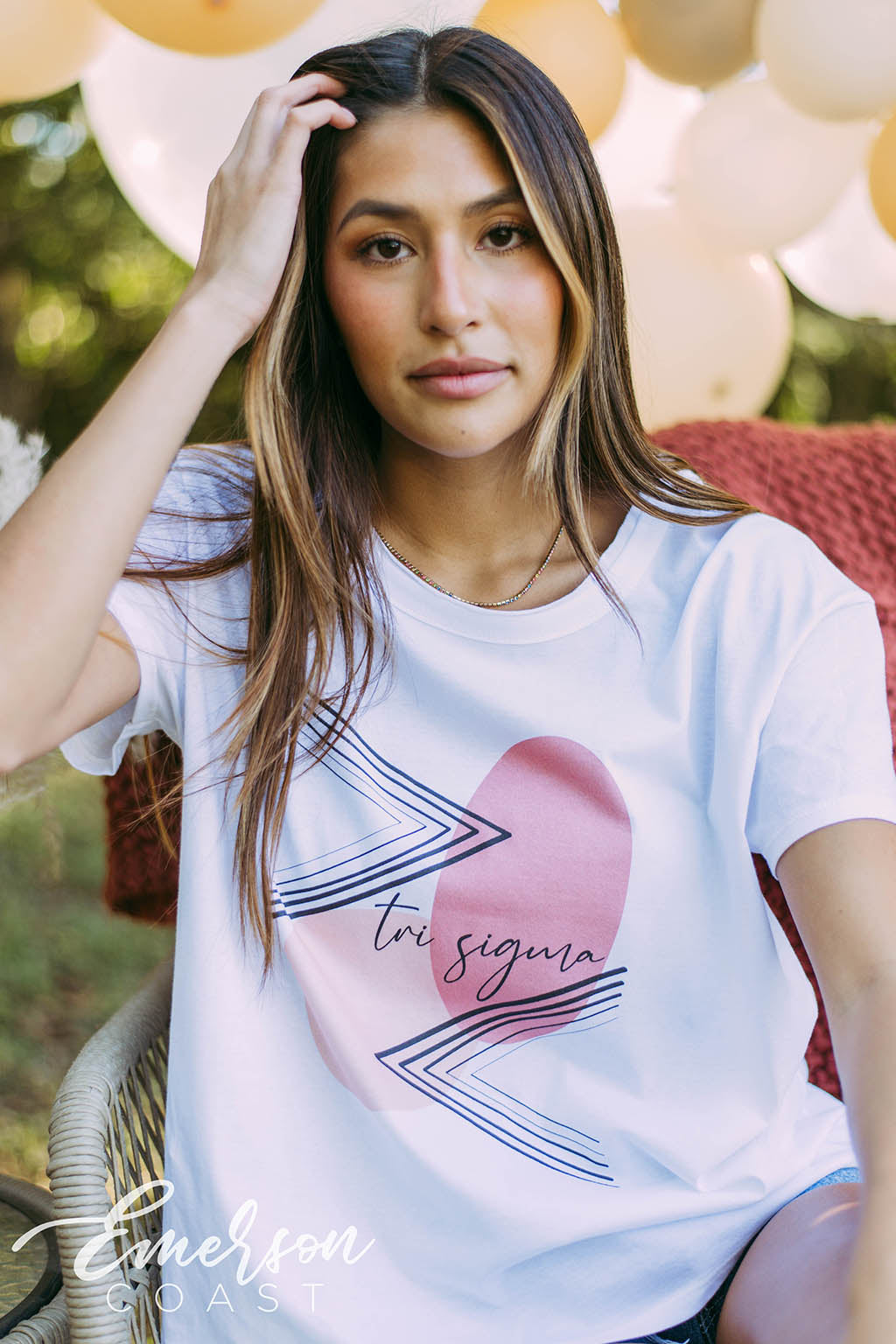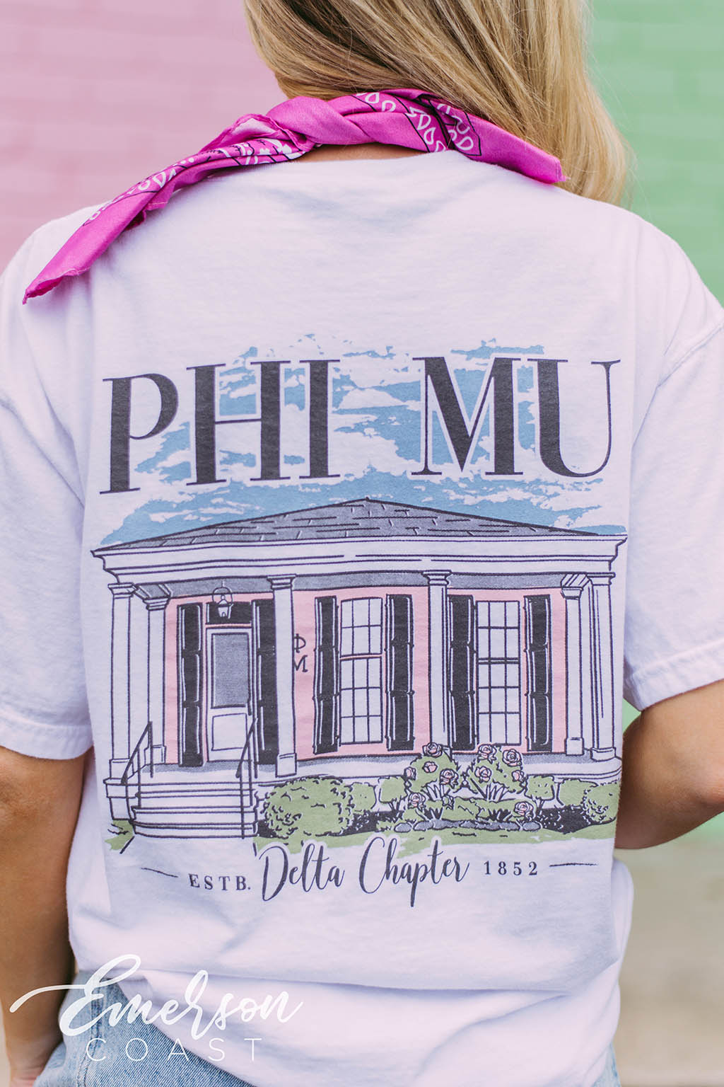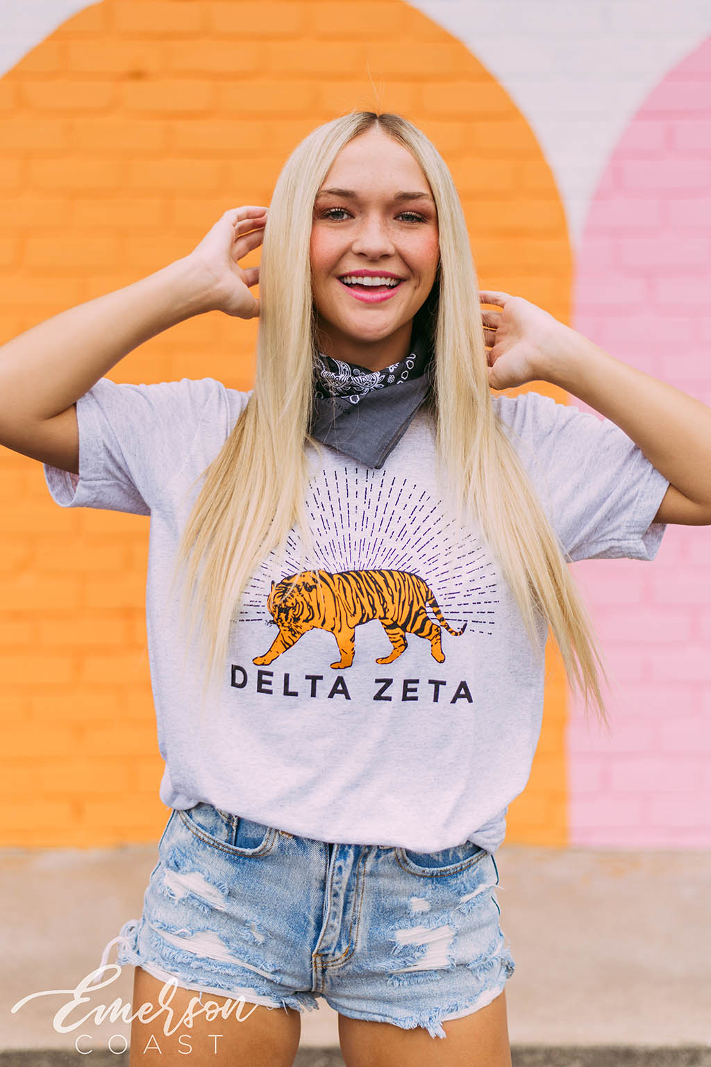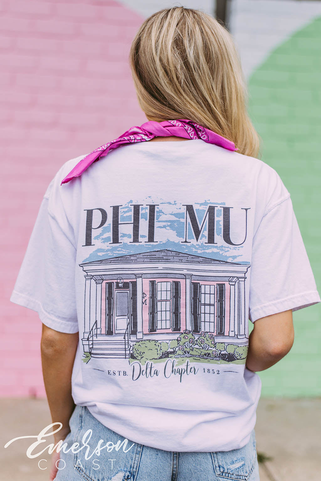 Tri Delta at Arkansas captured the magic of the Amalfi Coast for Bid Day with custom slouchy tees — white for members, cloud blue for new girls. Styled with flowy skirts and neck scarves, the whole vibe was straight out of a summer postcard.