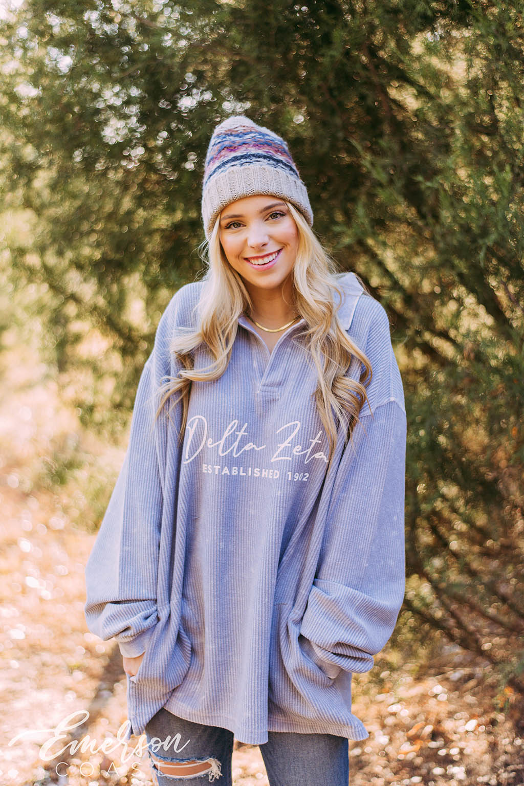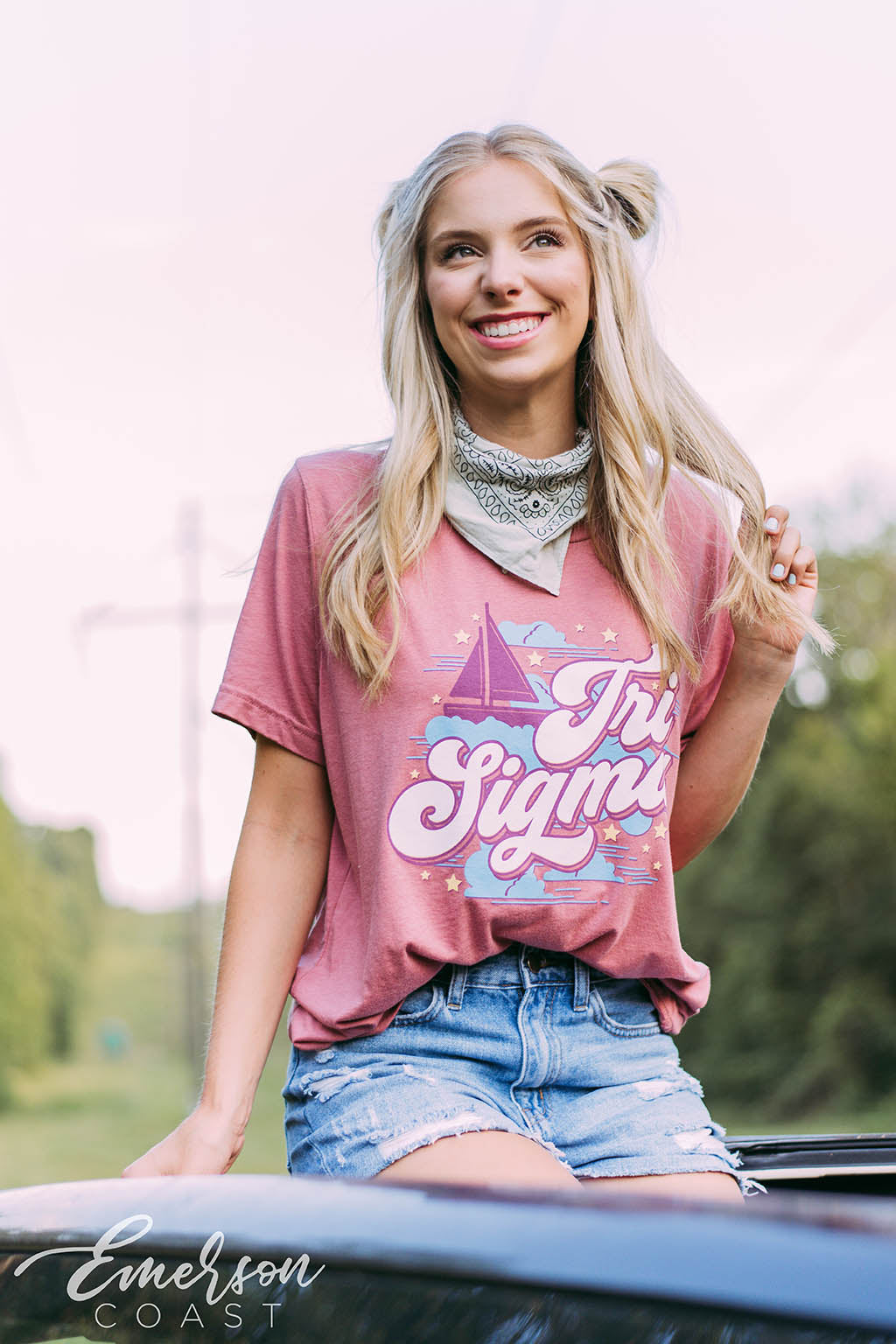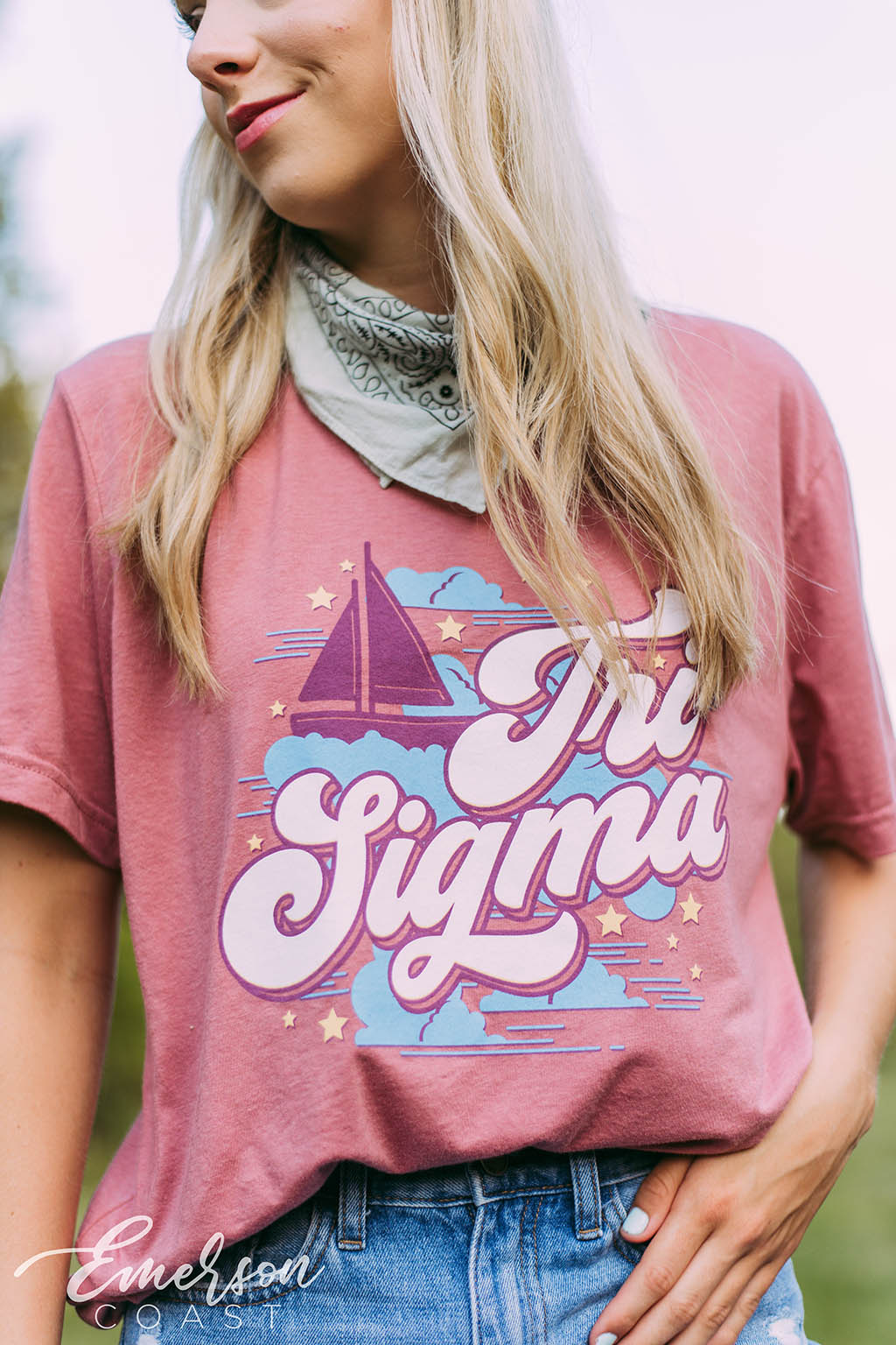 Tri Delta at Arkansas captured the magic of the Amalfi Coast for Bid Day with custom slouchy tees — white for members, cloud blue for new girls. Styled with flowy skirts and neck scarves, the whole vibe was straight out of a summer postcard.
