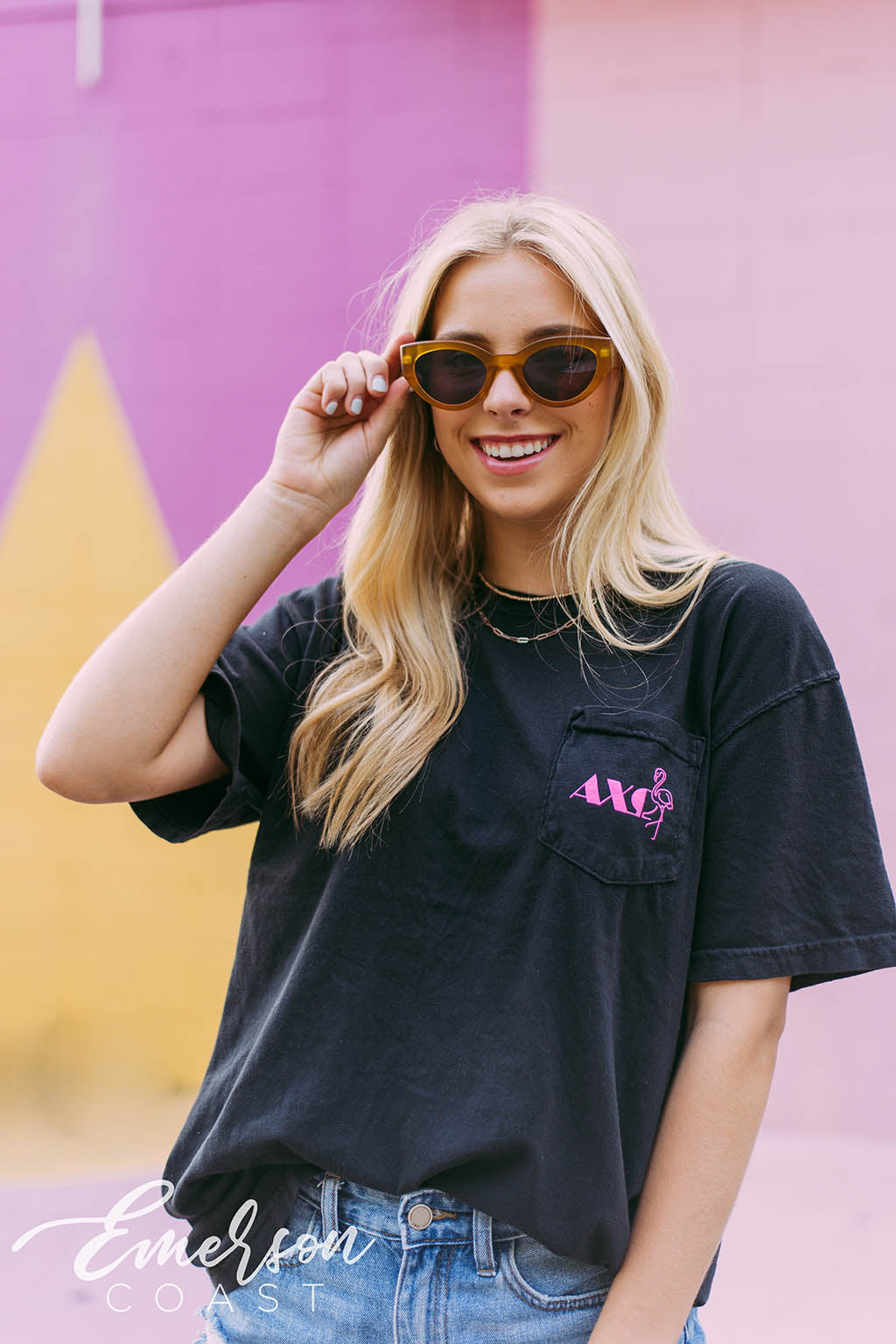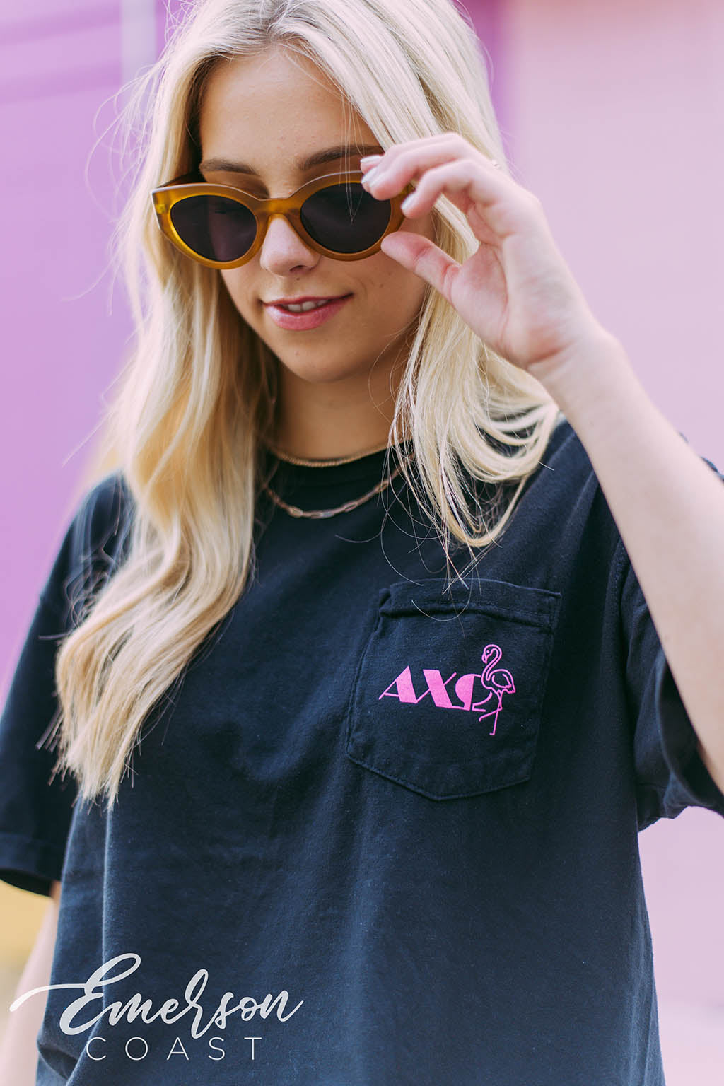 In the same Broadway font, Alpha Chi Omega's Greek letters and a flamingo shine on the front pocket.
