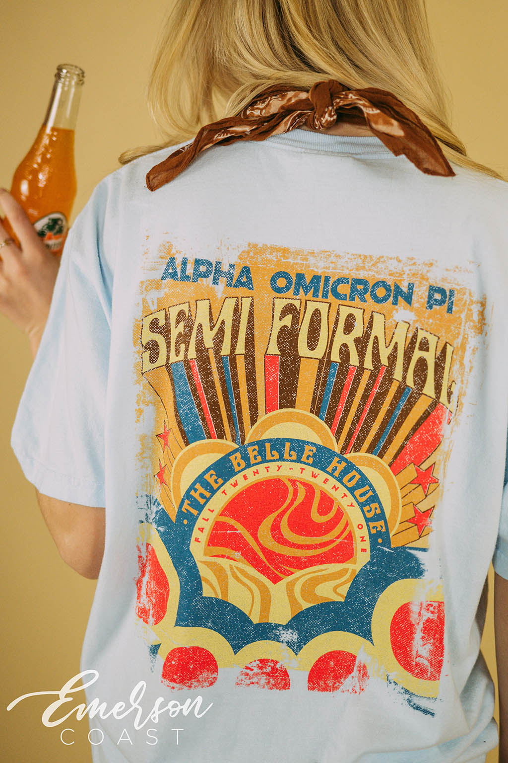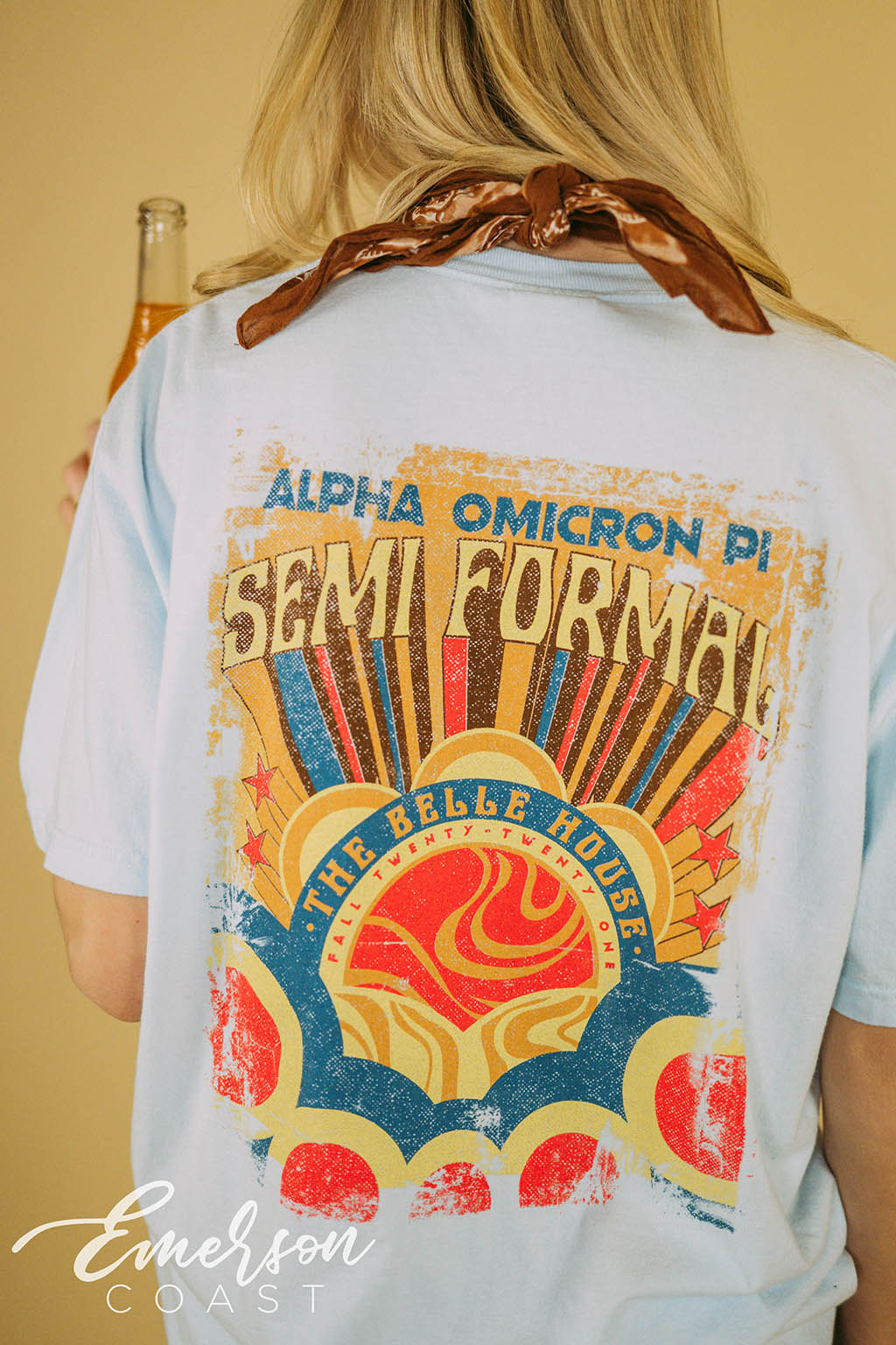 Stay groovy with the Alpha Omicron Pi Retro Sunset Semi Formal Shirt!