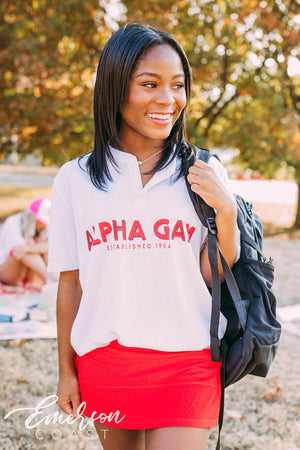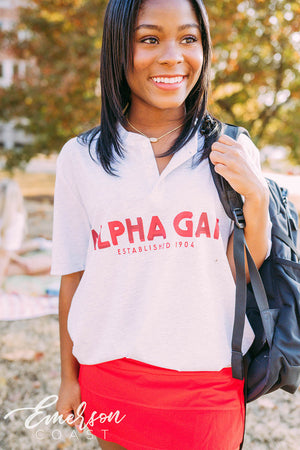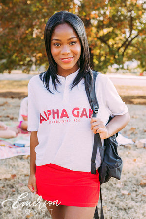 Give your fellow Alpha Gamma sisters something to get excited about with the Alpha Gamma Delta PR Classic Henley Tee! This white cotton henley tee features Alpha Gamma Deltadetailed in a bold red block font with monochromatic shadows! Add a touch of Greek pride to your wardrobe with this cozy classic. And make sure to check out the established date at the bottom of the design - it's sure to get a nostalgic smile from your fellow sisters! Warm enough for cooler days, but still lightweight enough for those hot summer events, you won't regret adding the Henley Tee to your wardrobe.