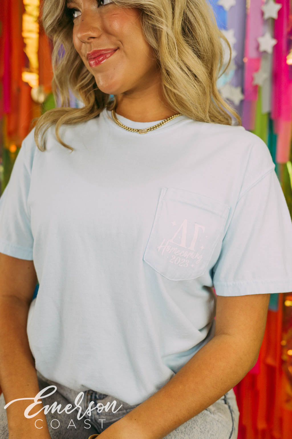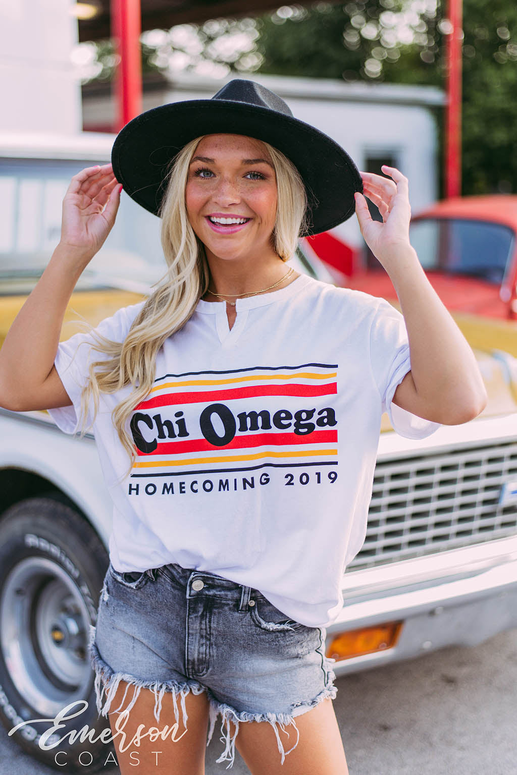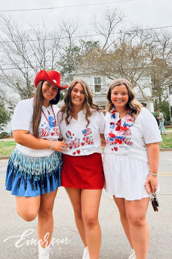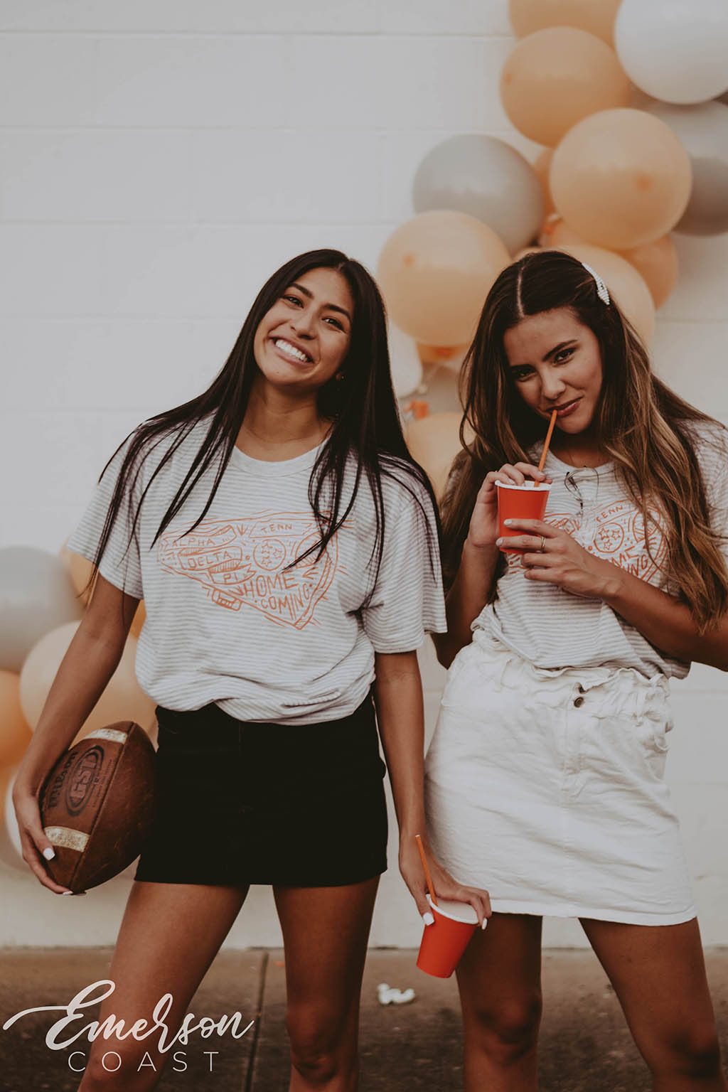 Tri Delta at Arkansas captured the magic of the Amalfi Coast for Bid Day with custom slouchy tees — white for members, cloud blue for new girls. Styled with flowy skirts and neck scarves, the whole vibe was straight out of a summer postcard.