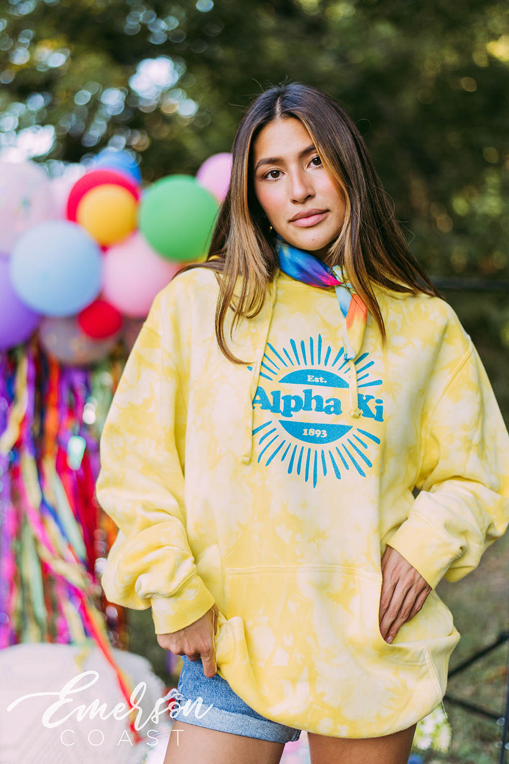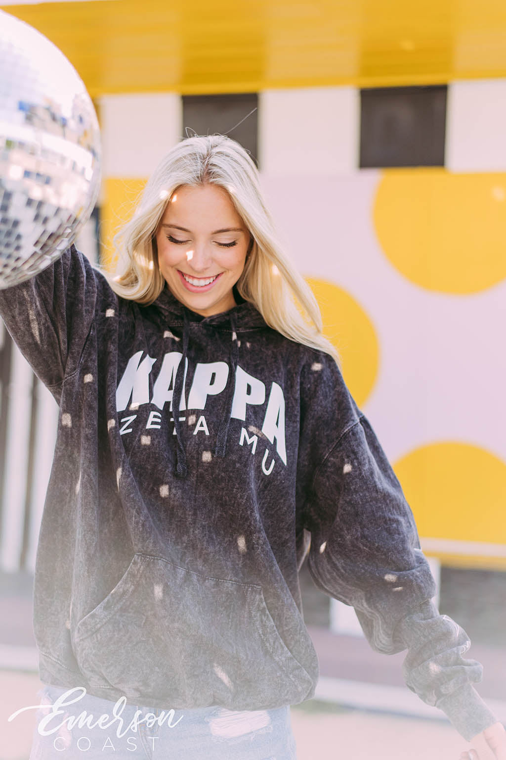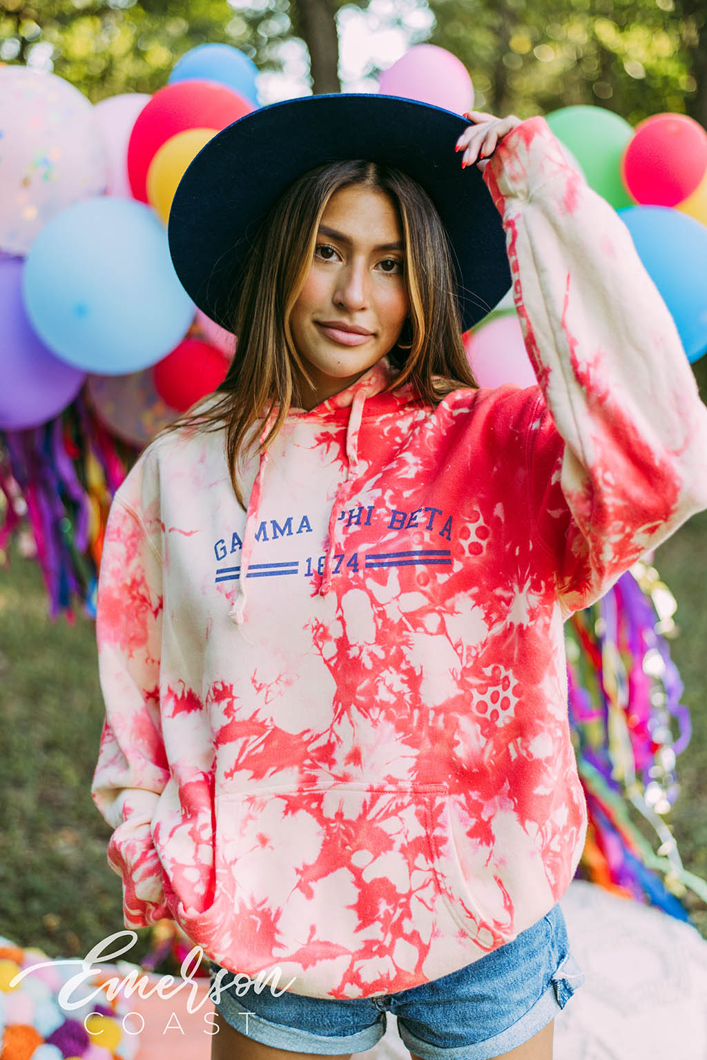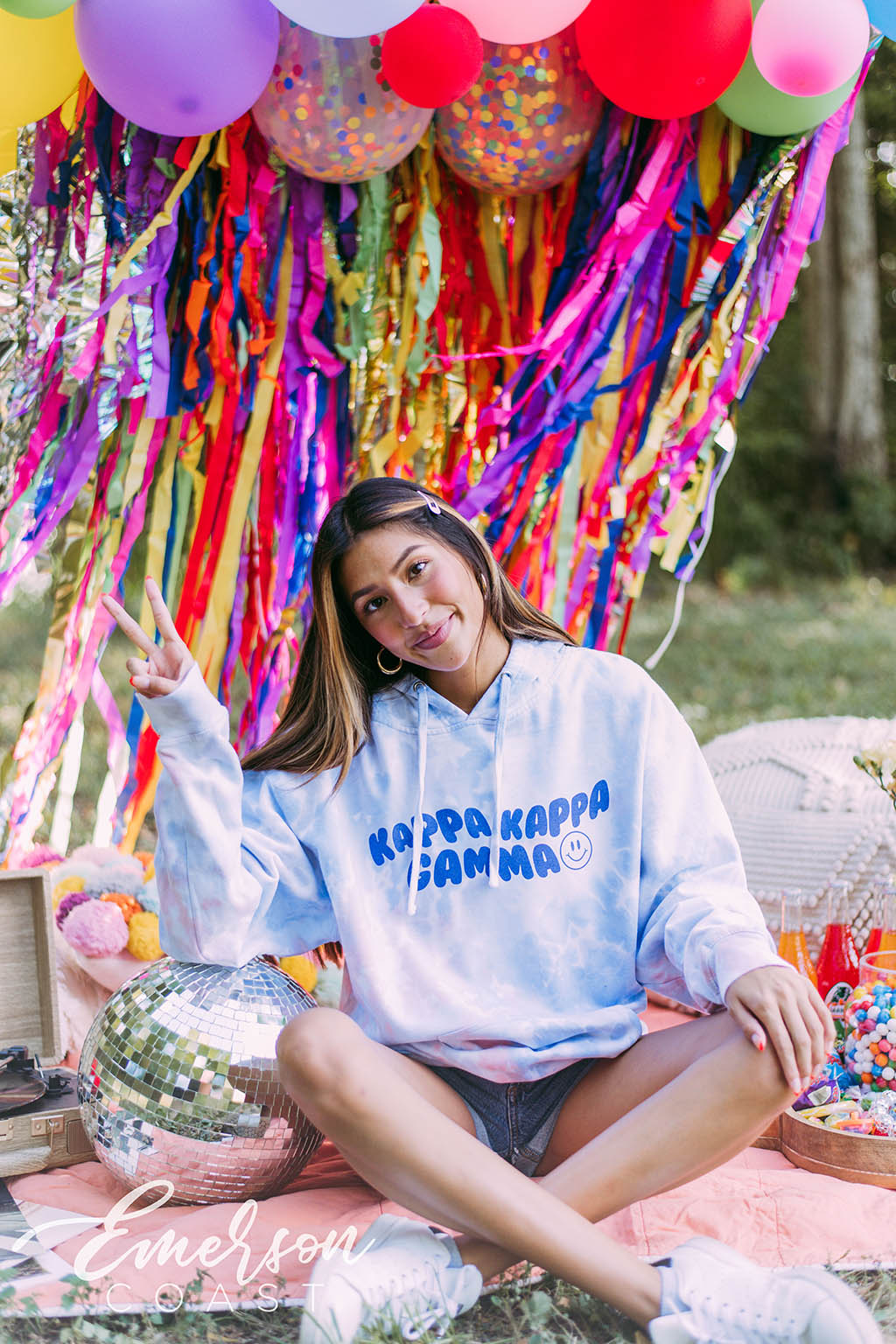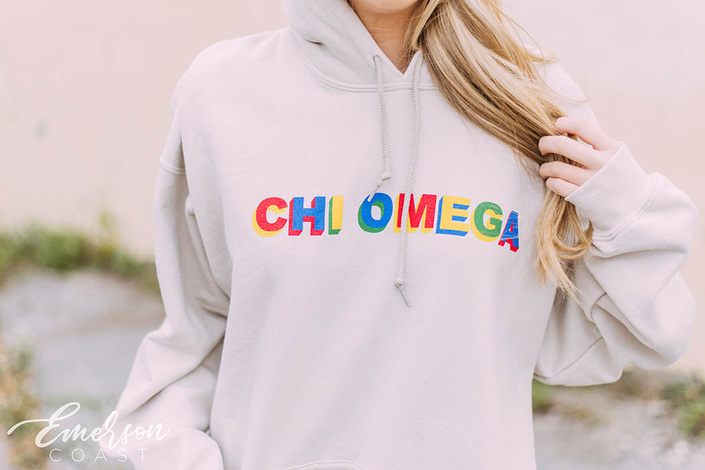 Gamma Phi at Oklahoma State floated into Bid Day with the dreamiest hot air balloon theme and the cutest pink colorblock ringer tees! Featuring soft pastel Greek letters, these tops added a fun pop of retro charm to an already magical day.