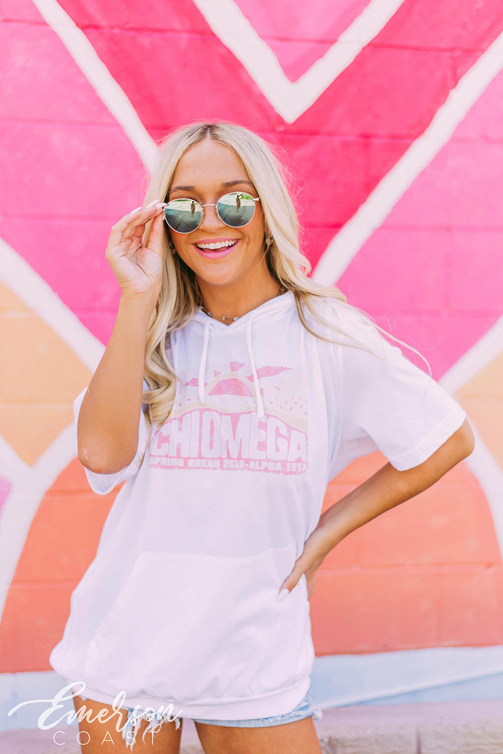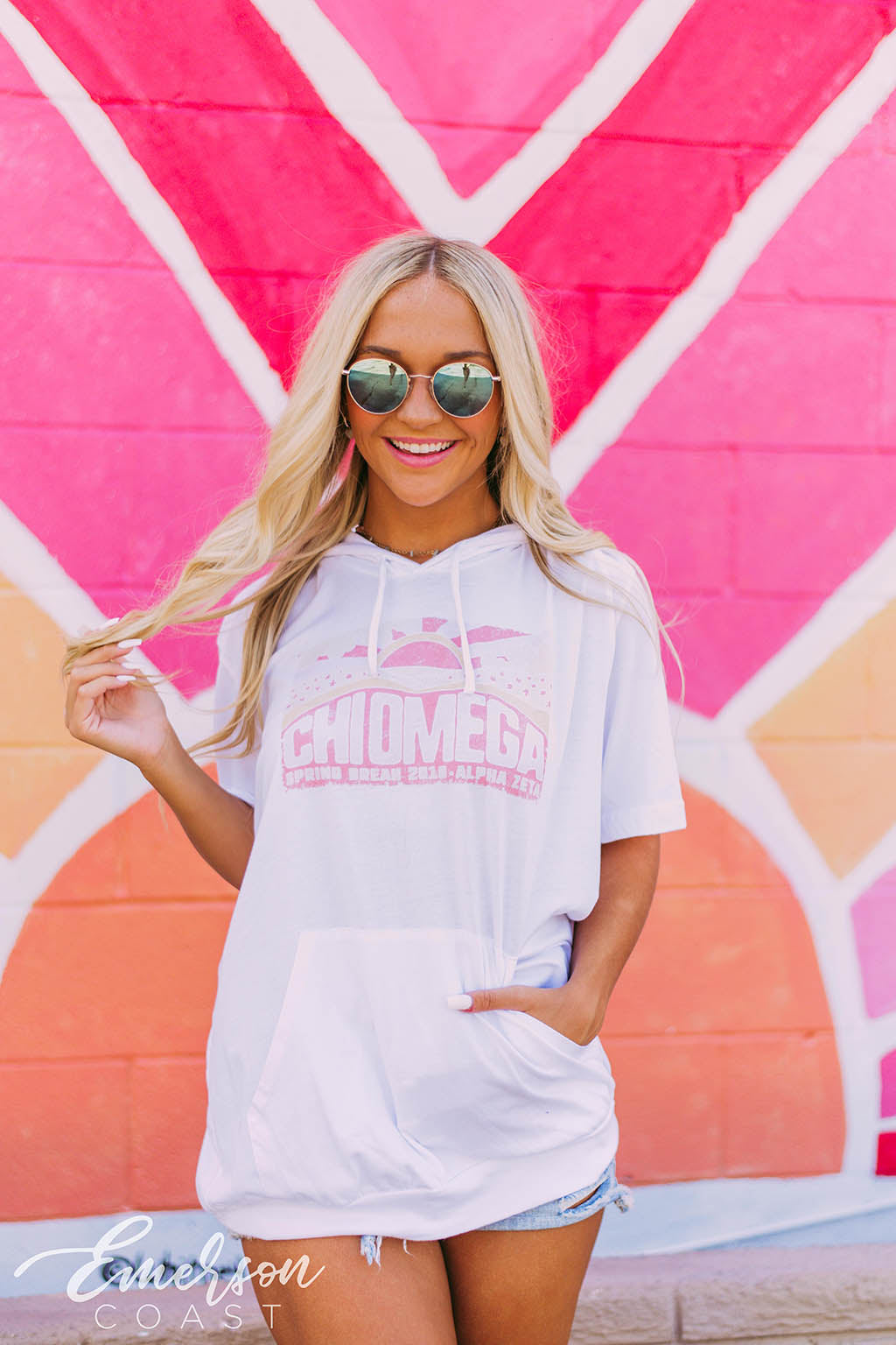 Tri Delta at Arkansas captured the magic of the Amalfi Coast for Bid Day with custom slouchy tees — white for members, cloud blue for new girls. Styled with flowy skirts and neck scarves, the whole vibe was straight out of a summer postcard.