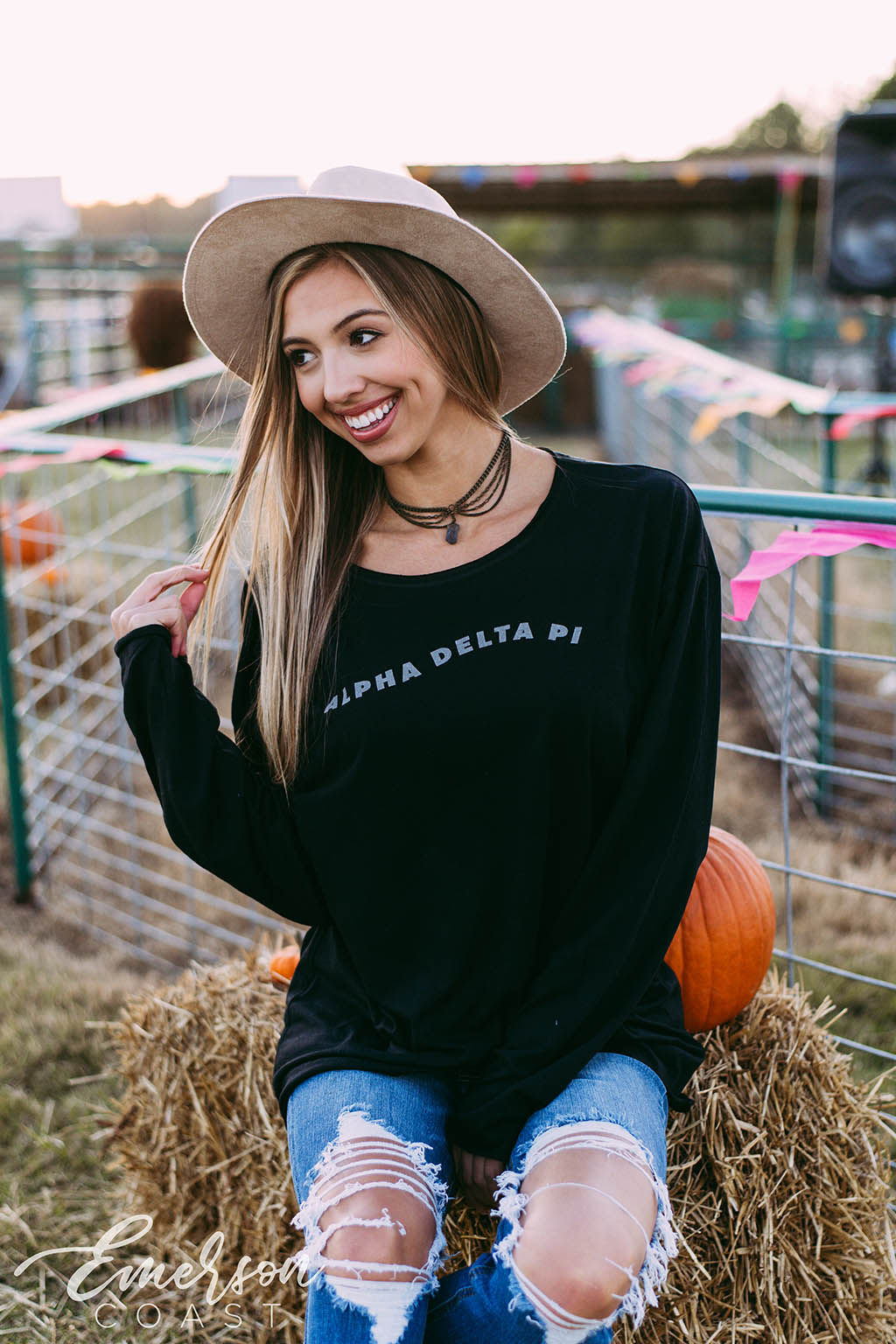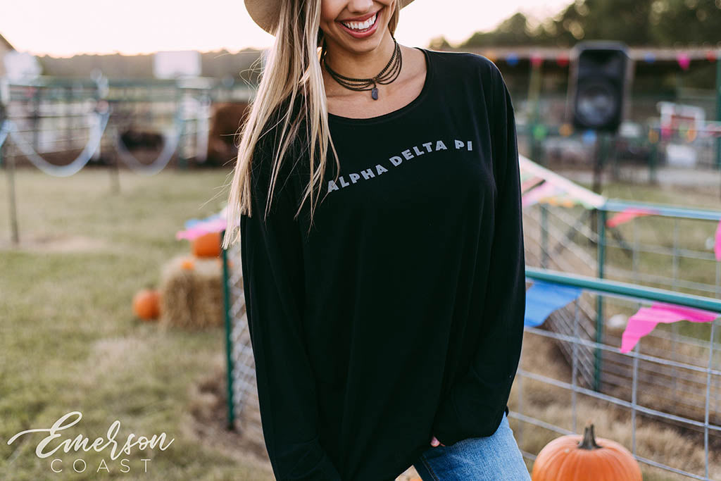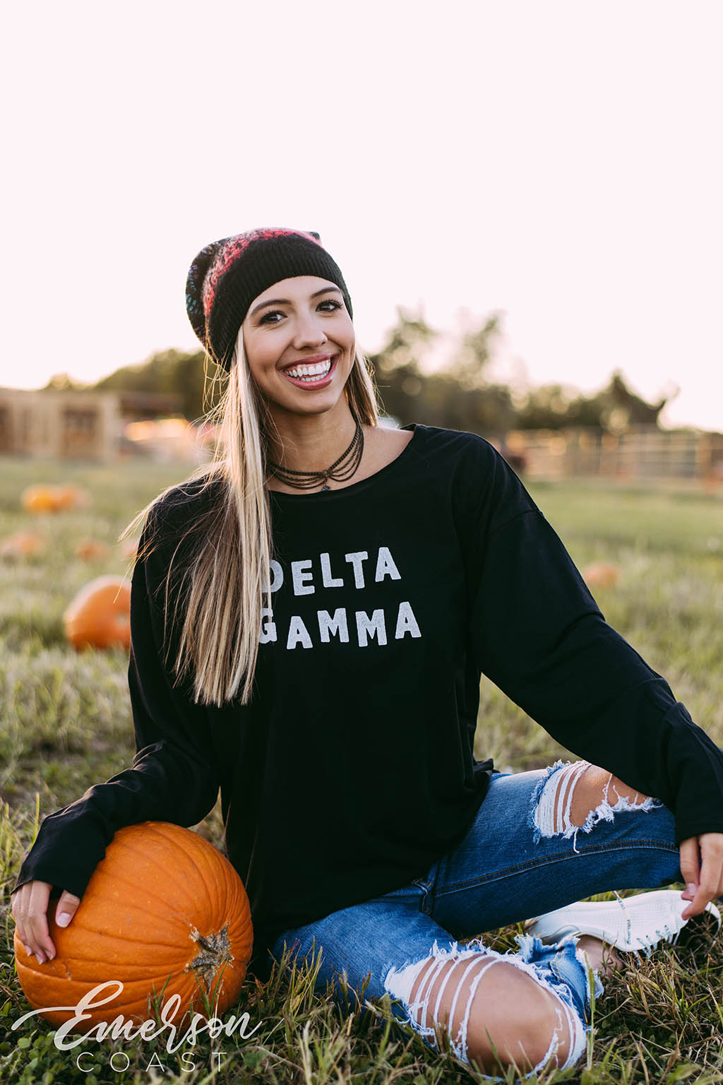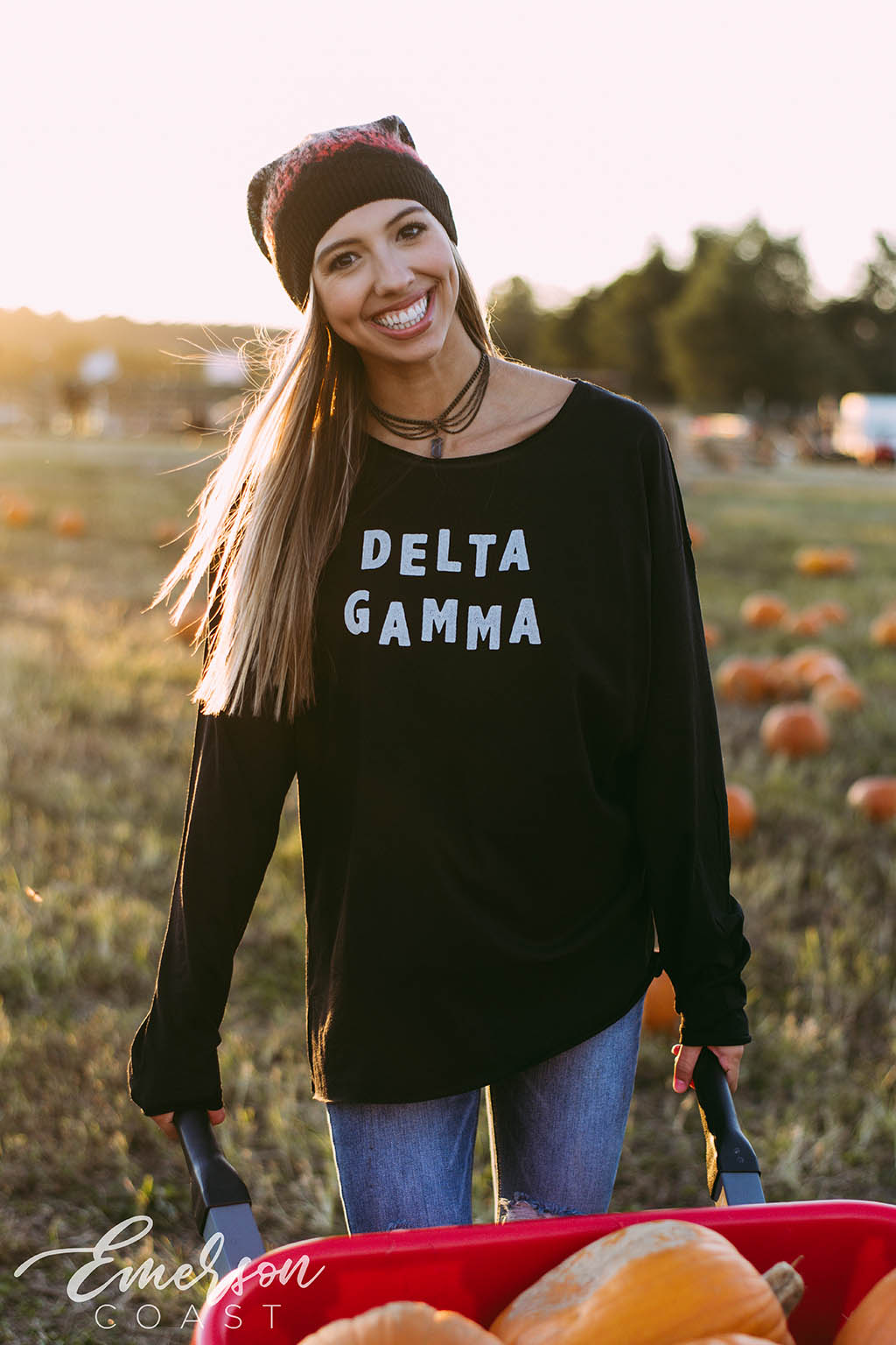 Tri Delta at Arkansas captured the magic of the Amalfi Coast for Bid Day with custom slouchy tees — white for members, cloud blue for new girls. Styled with flowy skirts and neck scarves, the whole vibe was straight out of a summer postcard.