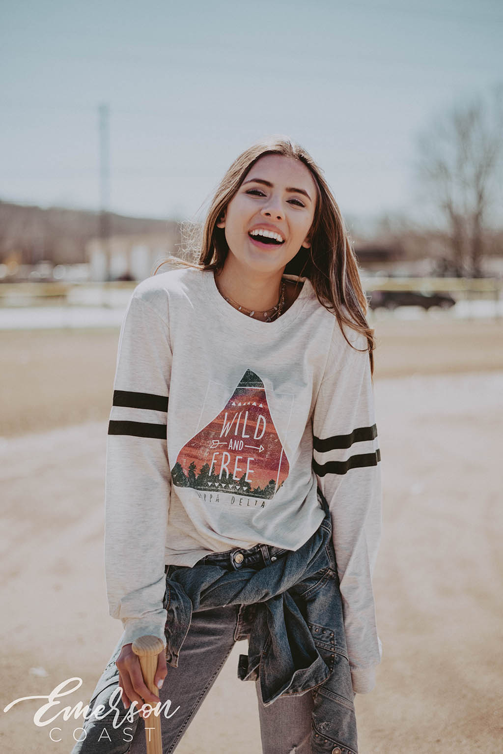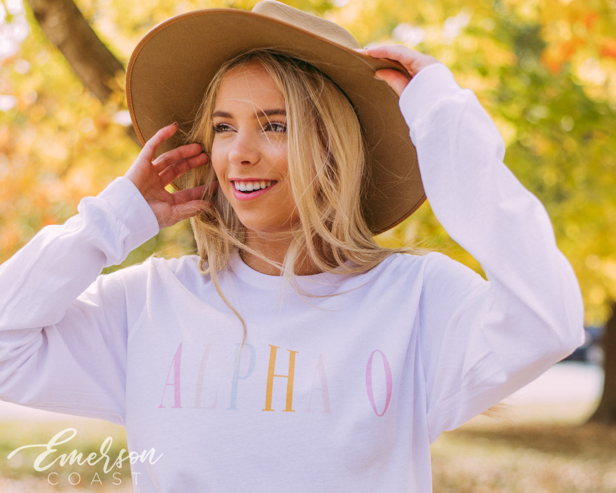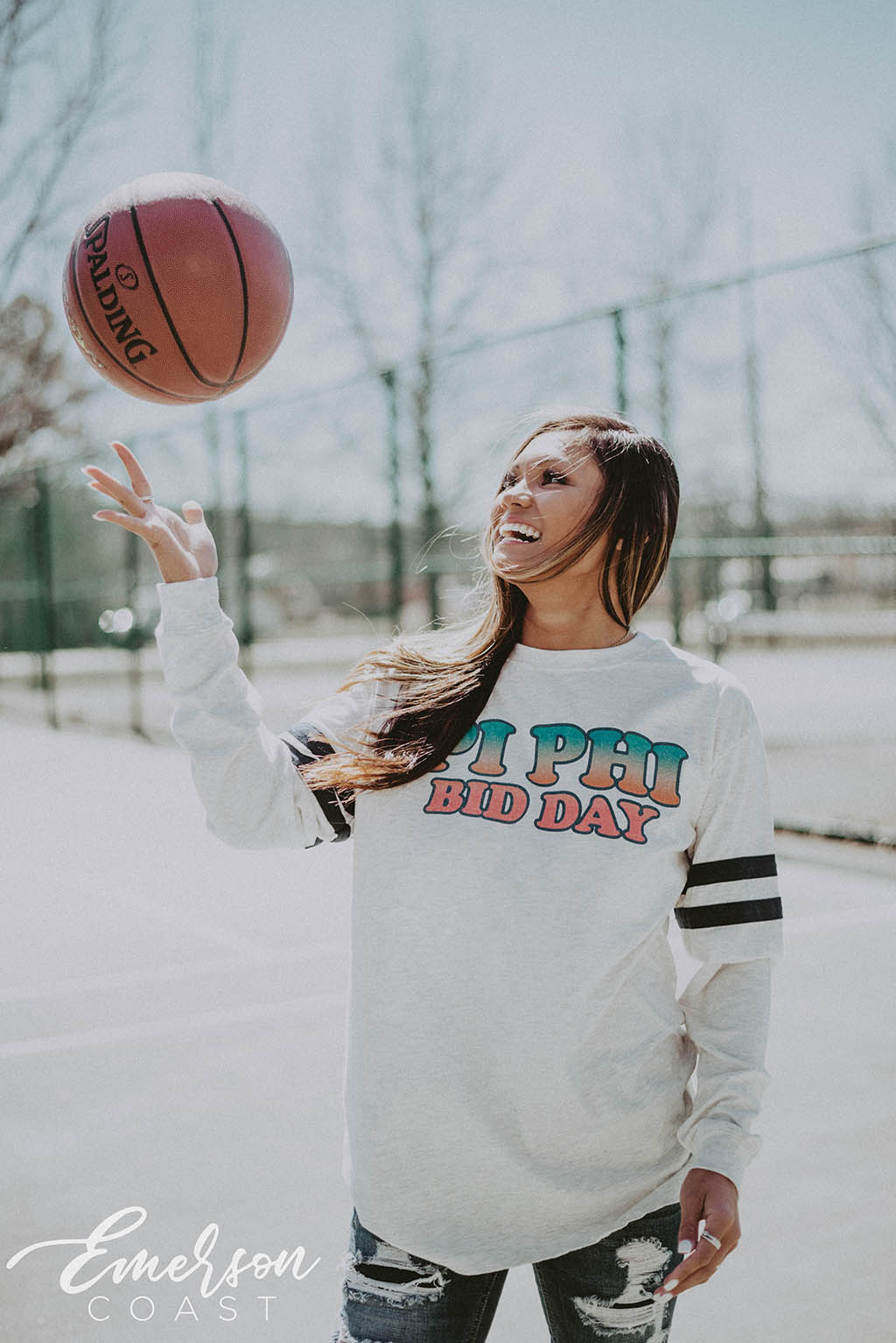 Gamma Phi at Oklahoma State floated into Bid Day with the dreamiest hot air balloon theme and the cutest pink colorblock ringer tees! Featuring soft pastel Greek letters, these tops added a fun pop of retro charm to an already magical day.