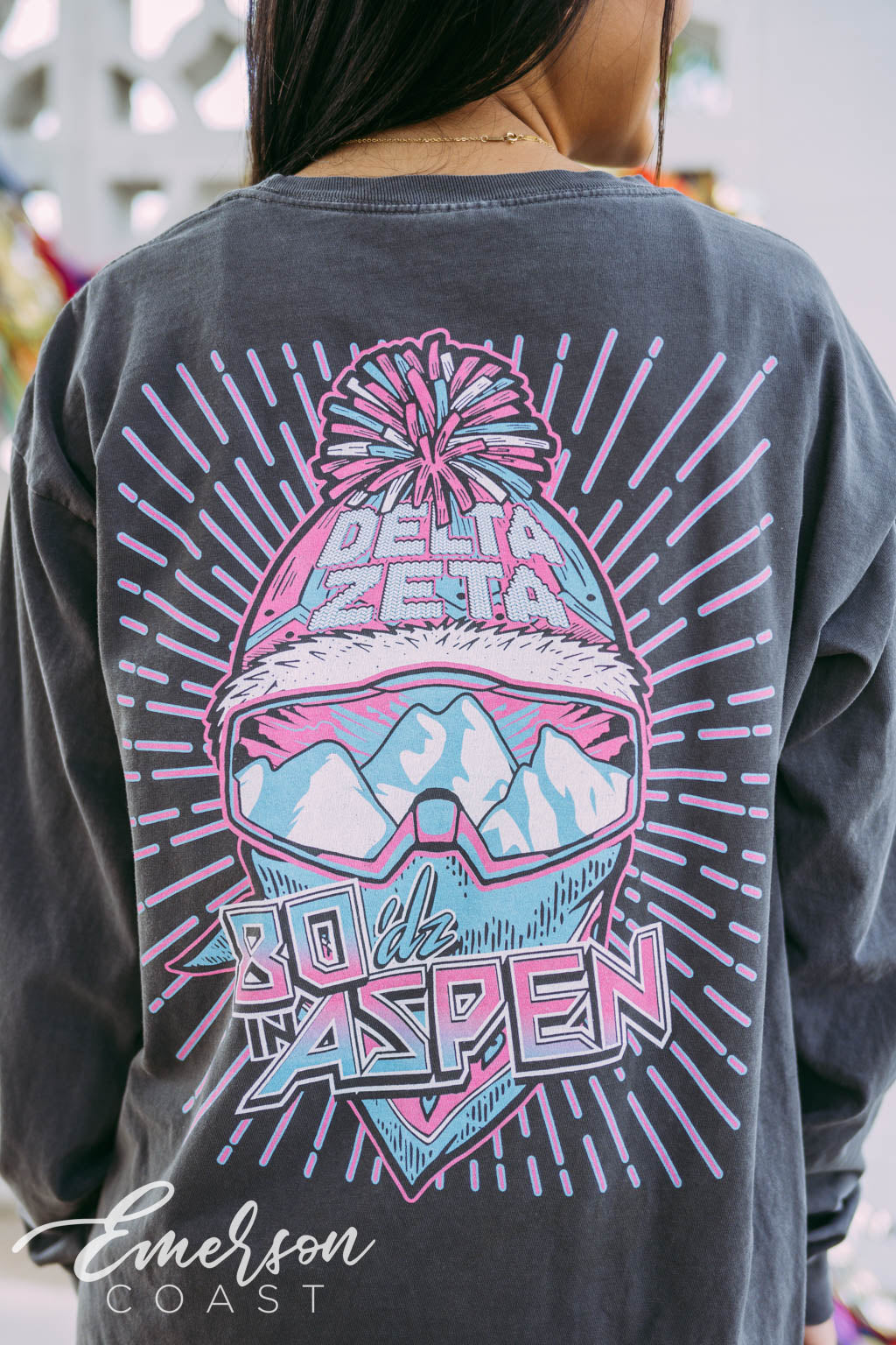 Gamma Phi at Oklahoma State floated into Bid Day with the dreamiest hot air balloon theme and the cutest pink colorblock ringer tees! Featuring soft pastel Greek letters, these tops added a fun pop of retro charm to an already magical day.