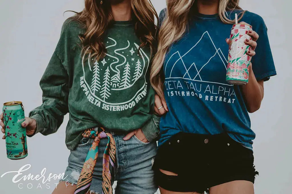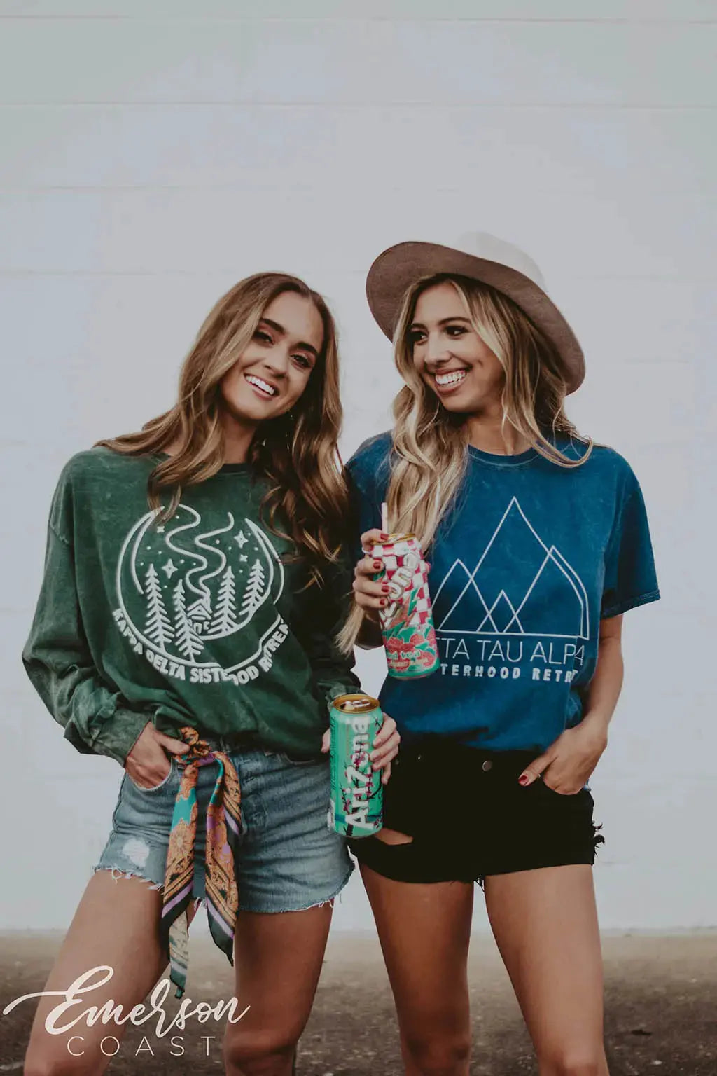 The Mineral Wash Long Sleeve is perfect for the fall. It comes in 3 different colors: black, gray and navy. This long sleeve fits mainly true to size with a little extra room. Its perfect for chillier months of the year to wear to class or it can be layered for a cold night at your sorority sisterhood event. Retro typography designs or outdoors designs look great on this style. Simply scroll through this page to get more inspiration on design, style, and event for your chapters next Mineral Wash Long Sleeve. The Mineral Wash Long Sleeve comes in sizes S-3XL.