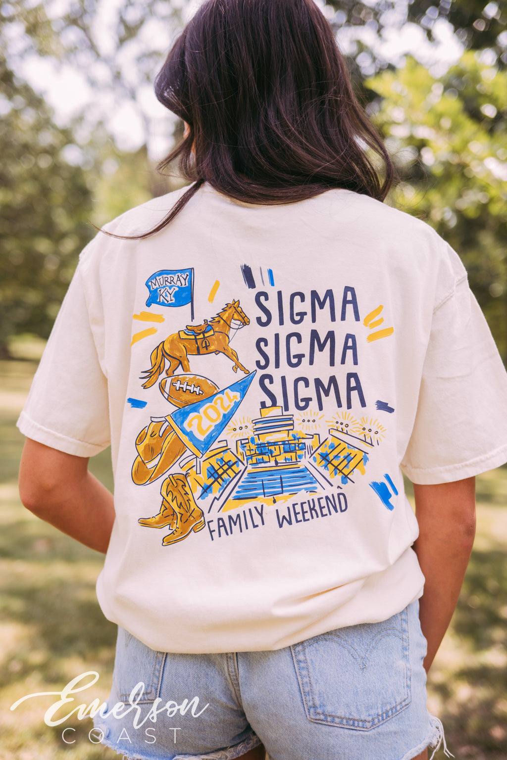 Usually held in the Fall, Parent’s Weekend is a multi-day event all about your family. You can center the event around a home football game, going all out with a sorority tailgate, barbecue, and yard games! No football, no problem! Rent out a local event space, hire a DJ, and let your folks relive their glory days. There is no better way to mark this weekend than with custom sorority parents weekend shirts. These custom designs won’t end up in the back of the closet like the sweatshirt they gave you when you were 13. Your custom parents weekend shirts will have you and your family sharing a treasured memory for years and years. However you choose to celebrate, Emerson Coast is ready to be a part of your special weekend. Sorority T-shirts the Whole Family Will Love Parent’s Weekend isn’t just for those that raised you! Invite your whole family, aunts & uncles, grandparents, hometown friends, whoever! You can call it Family Weekend, Dudes Day, Family Day, whatever you want. The only requirement? Make sorority parents weekend shirts everyone will love! Since you’re inviting the whole fam, it’s best to keep parent family weekend shirt styles simple. A classic pocket tee is always a fan favorite, giving you endless design options on the front and back. Go a little more stylish with a mineral wash tee or fitted style.These parents weekend shirts make it super easy to style for a night out with the parents or game day! Family and friends will love to have this parents weekend sorority shirt as a keepsake, so customize your parent family weekend shirts to your university! If you’re hosting your Parent’s Weekend over a game, highlight the football stadium, jerseys, or mascot. Stick with your college colors, adding your sorority Greek letters where you can. Show off your campus with hand drawn landmarkson a sorority sweatshirt, especially for a Winter Parents Weekend! Ordering Sorority Apparel Has Never Been Easier When designing parents weekend shirts, it can be hard to please everyone. Especially when it comes to large events like Family Weekend! Your job is hard enough, so why should we make it more stressful? At Emerson Coast, we keep the process as easy and quick as possible. See Parents Weekend sorority shirts or sweatshirts you’re in love with? Let’s get a proof started today! Want something completely different? Even better! Our artists have a crazy fast turnaround time, making sure you get your parent family weekend shirts in time. We usually get an order to you in two weeks, but we can usually accommodate if you have a last-minute job. Our passion is working with sororities to create unique apparel that works for everyone. Design your next sorority parents weekend shirts with us today!