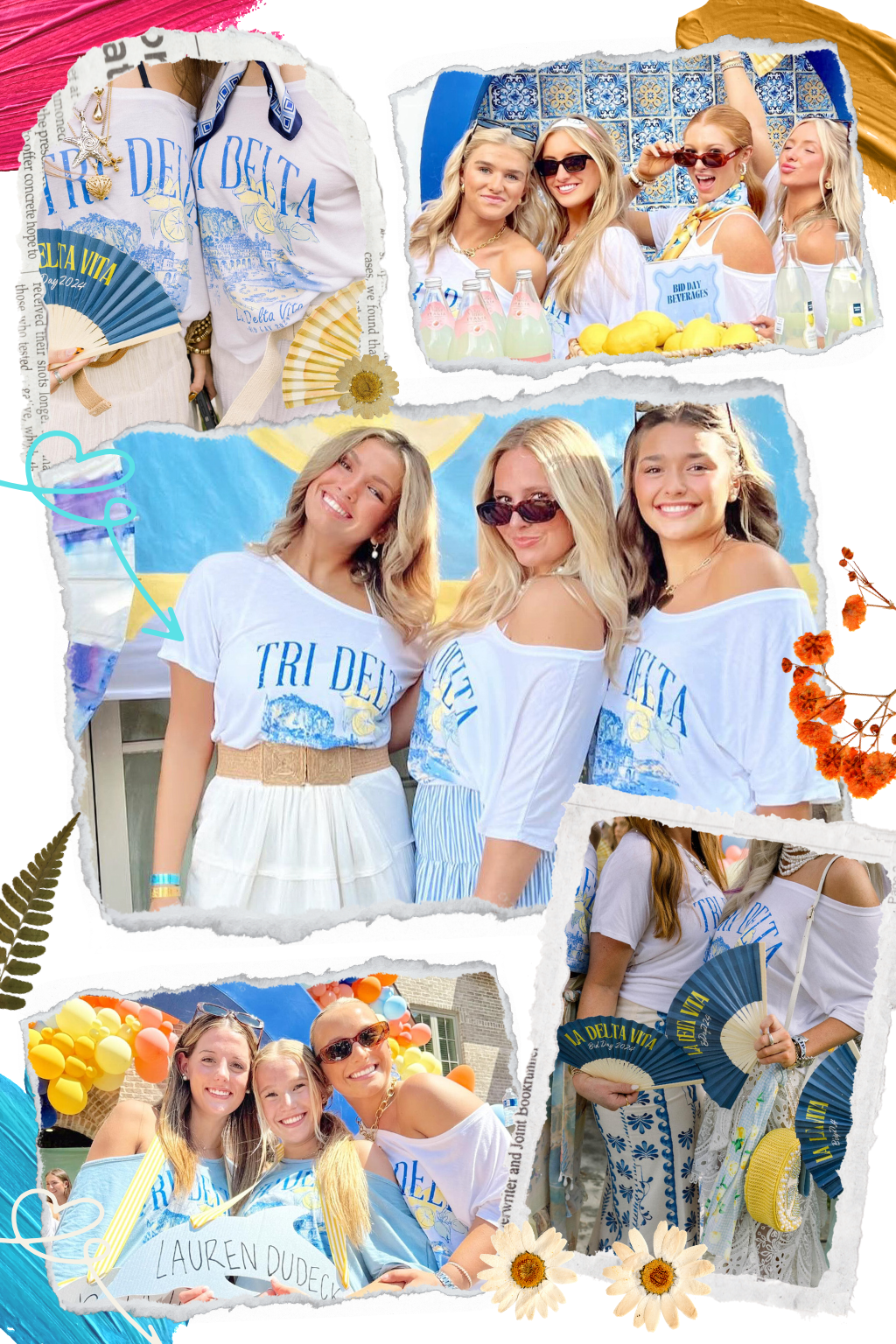 Tri Delta at Arkansas captured the magic of the Amalfi Coast for Bid Day with custom slouchy tees — white for members, cloud blue for new girls. Styled with flowy skirts and neck scarves, the whole vibe was straight out of a summer postcard.