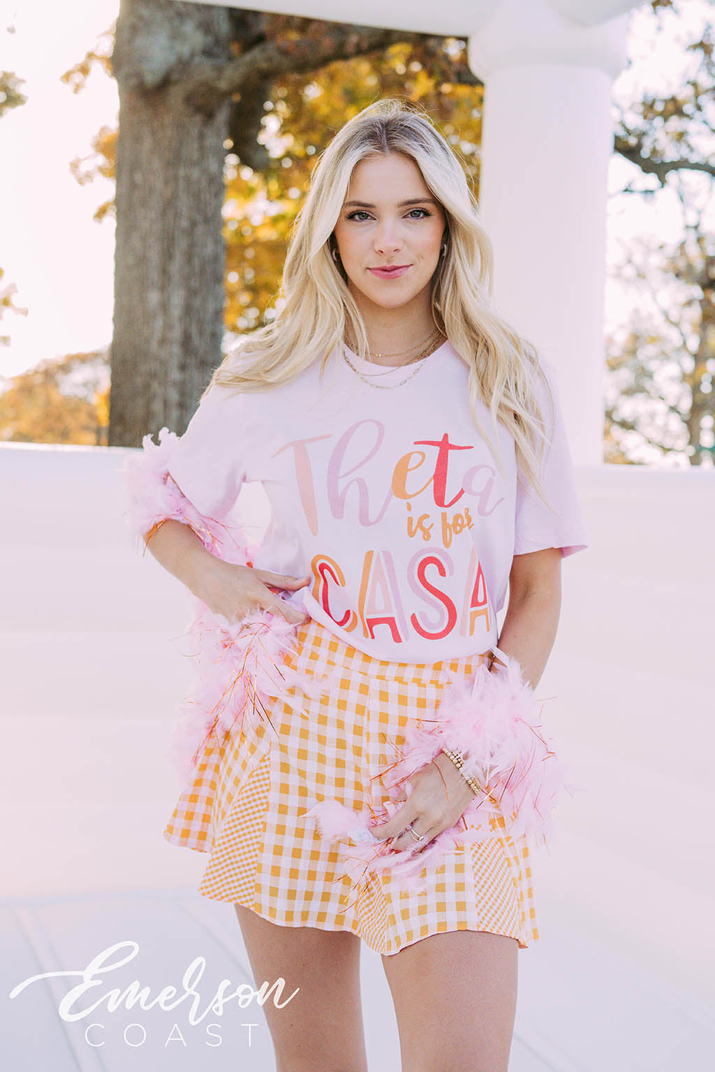 Tri Delta at Arkansas captured the magic of the Amalfi Coast for Bid Day with custom slouchy tees — white for members, cloud blue for new girls. Styled with flowy skirts and neck scarves, the whole vibe was straight out of a summer postcard.