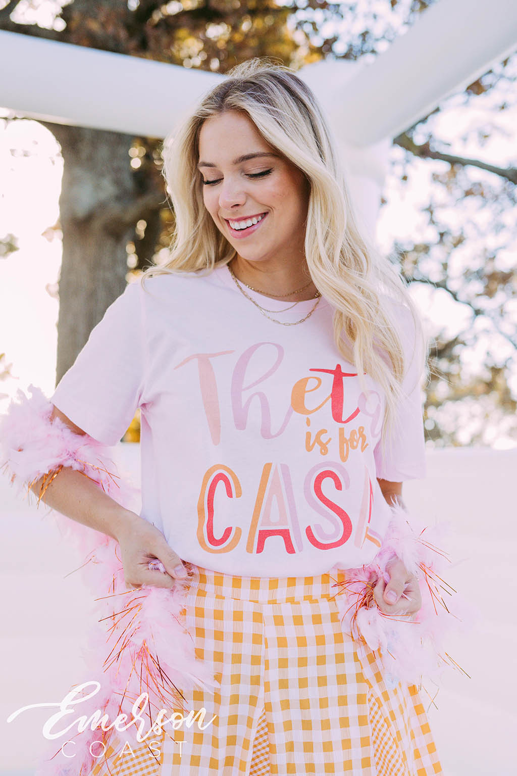 Gamma Phi at Oklahoma State floated into Bid Day with the dreamiest hot air balloon theme and the cutest pink colorblock ringer tees! Featuring soft pastel Greek letters, these tops added a fun pop of retro charm to an already magical day.