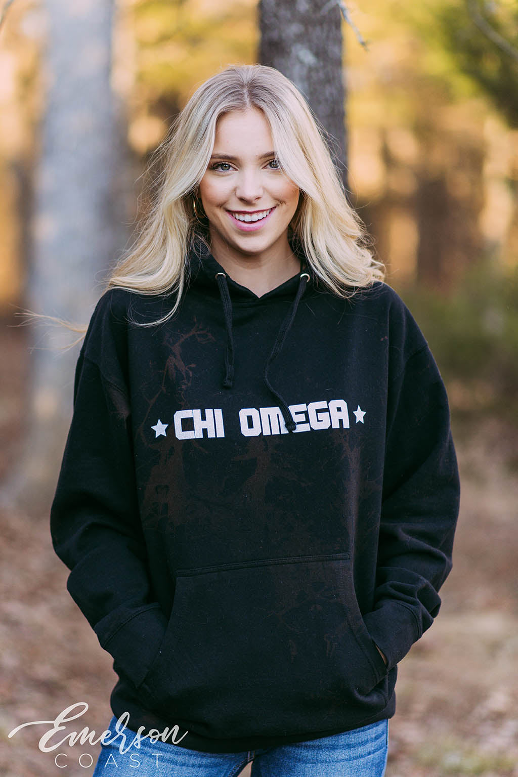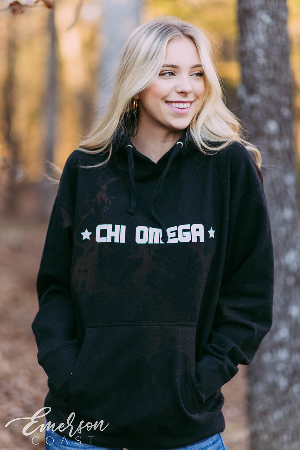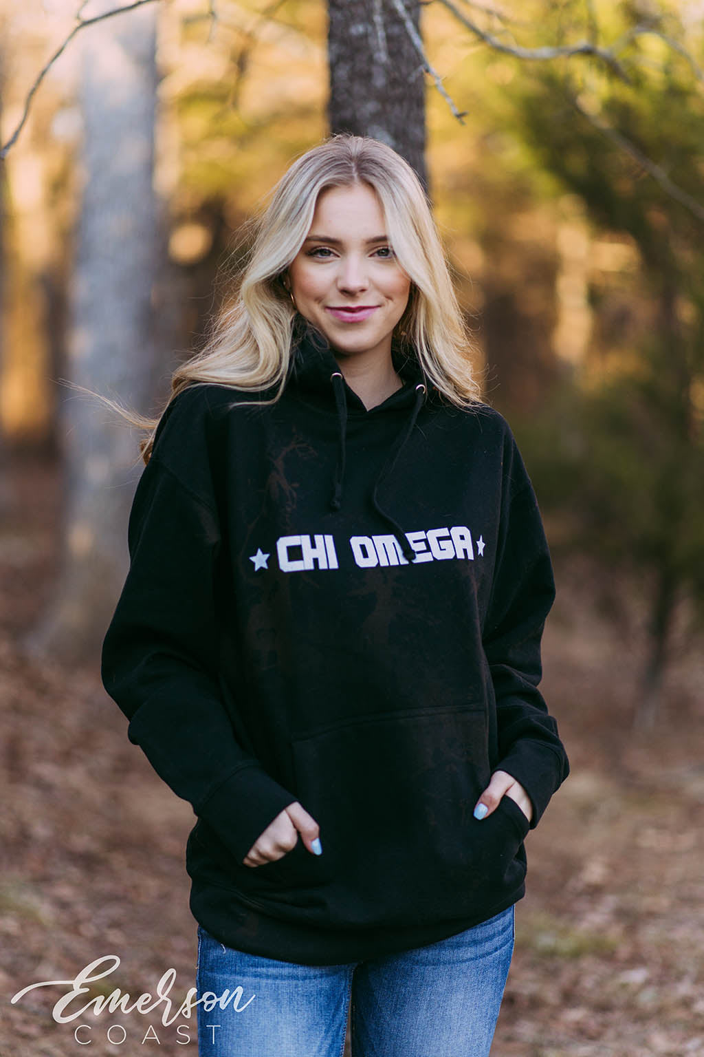 Chi O will be loving this simple design that features their name across the front with stars on either side.