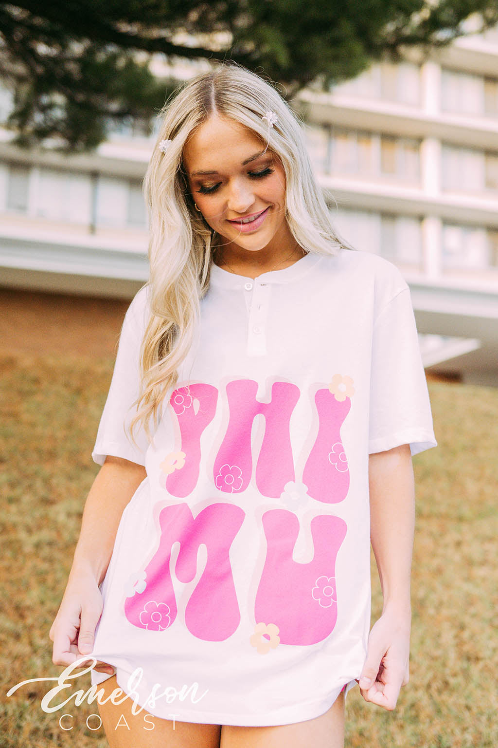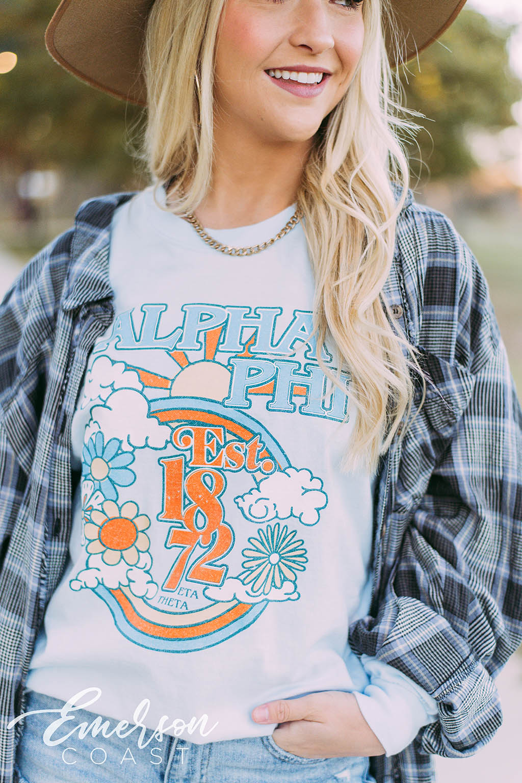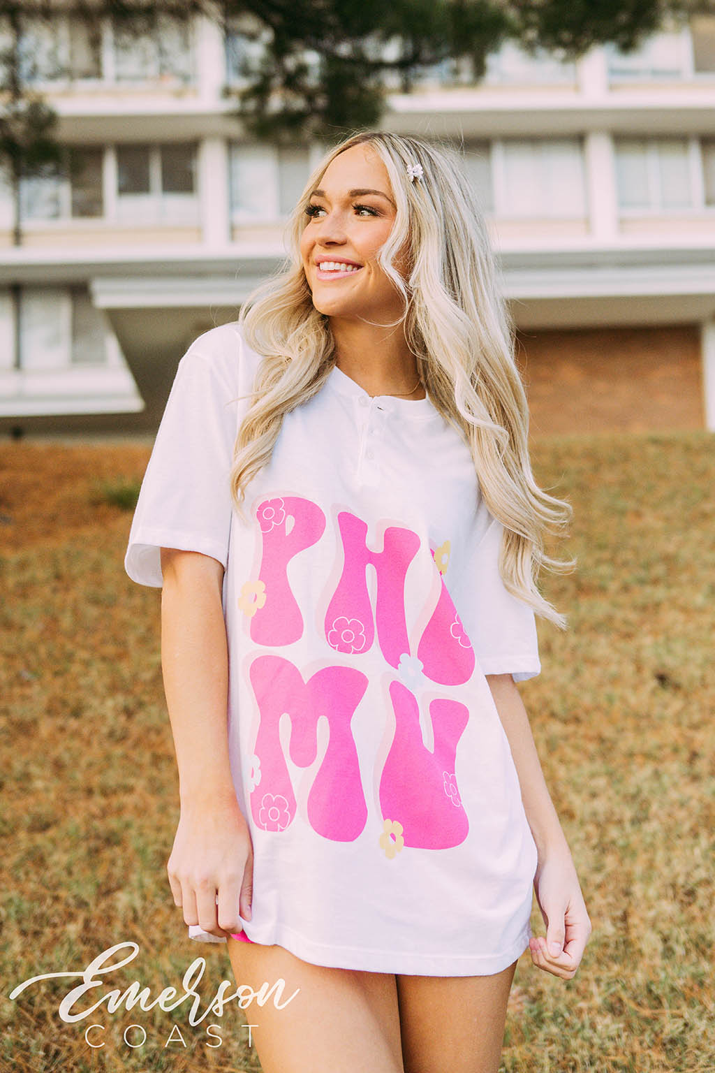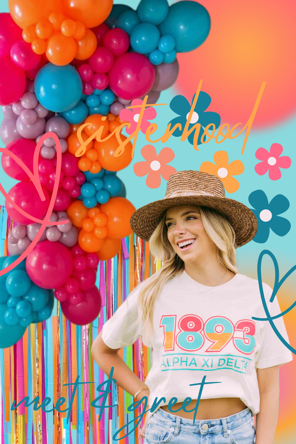 Gamma Phi at Oklahoma State floated into Bid Day with the dreamiest hot air balloon theme and the cutest pink colorblock ringer tees! Featuring soft pastel Greek letters, these tops added a fun pop of retro charm to an already magical day.