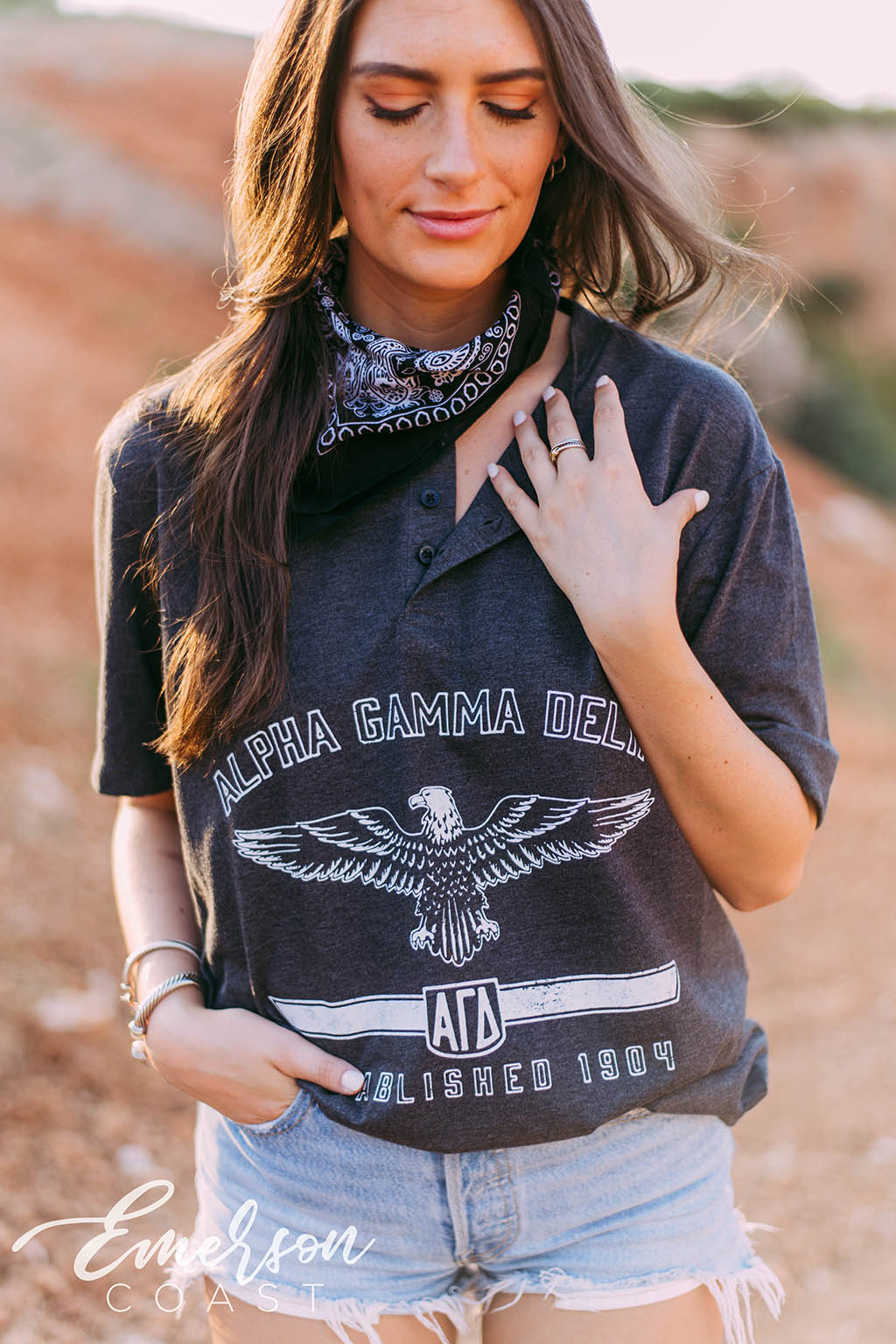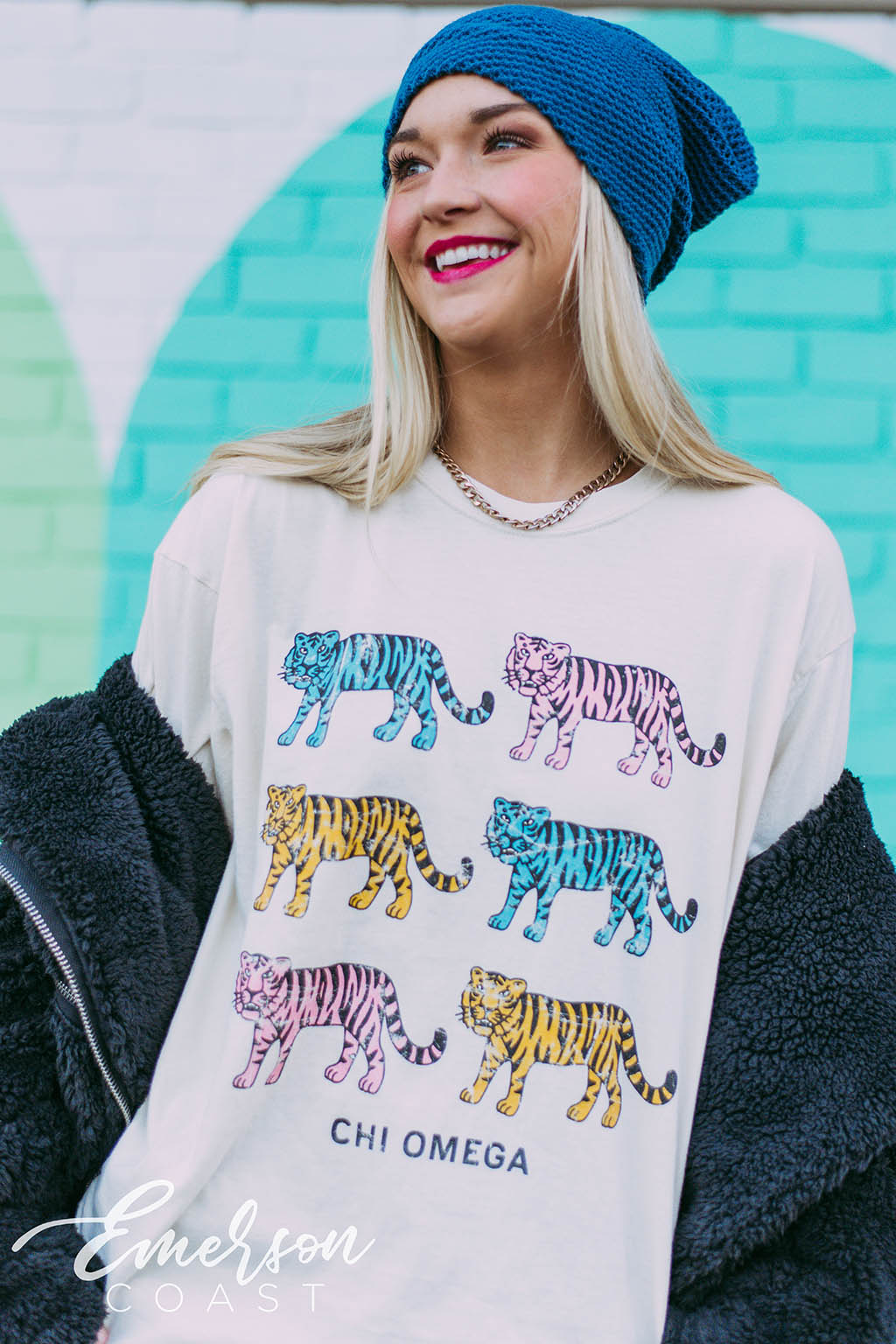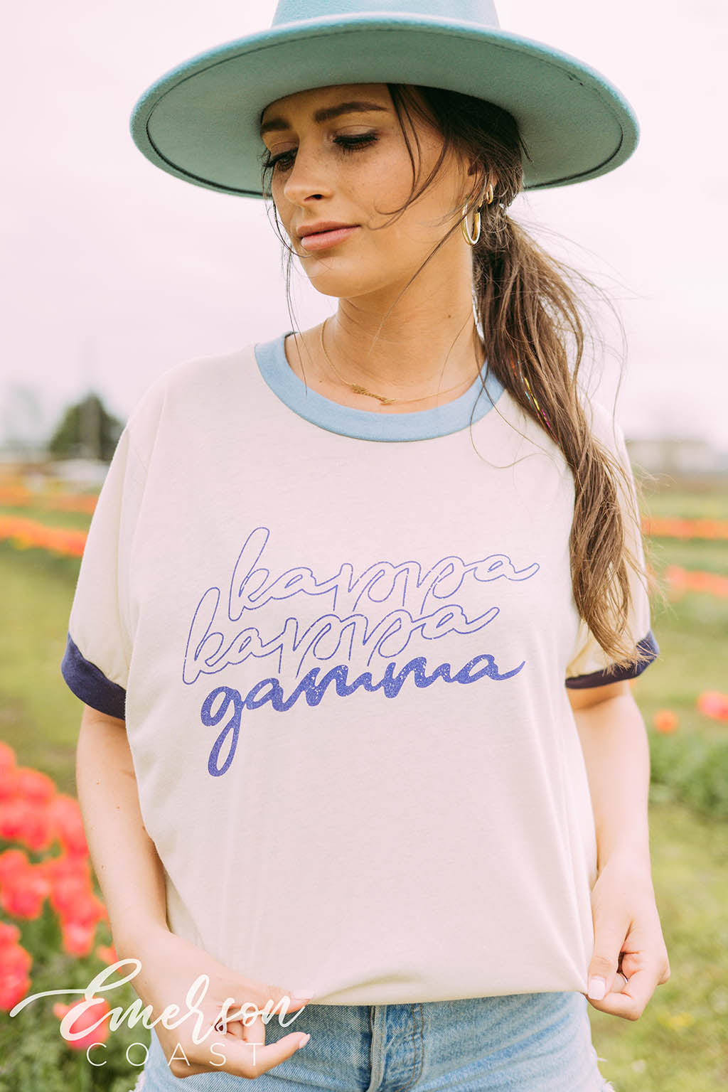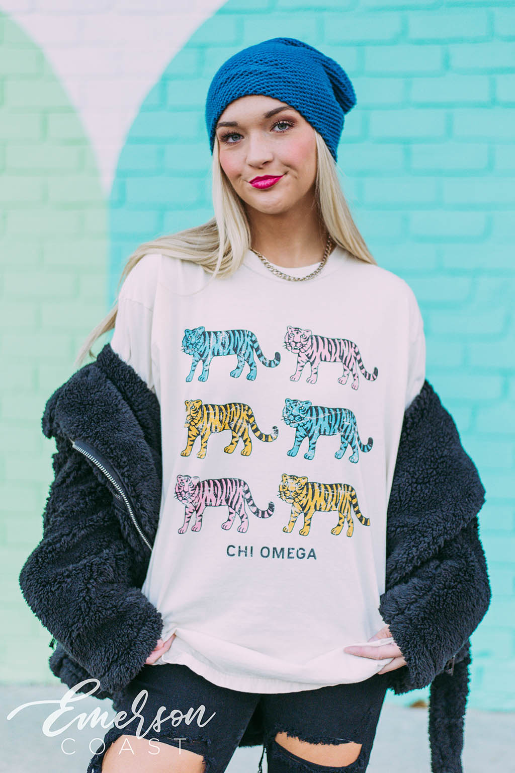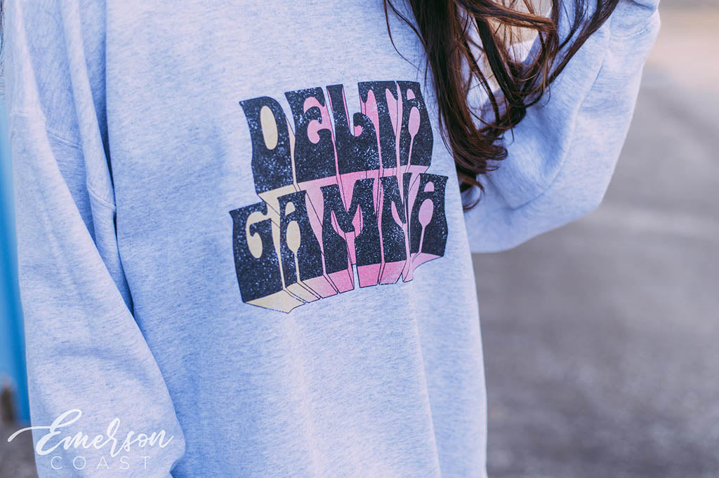 Gamma Phi at Oklahoma State floated into Bid Day with the dreamiest hot air balloon theme and the cutest pink colorblock ringer tees! Featuring soft pastel Greek letters, these tops added a fun pop of retro charm to an already magical day.