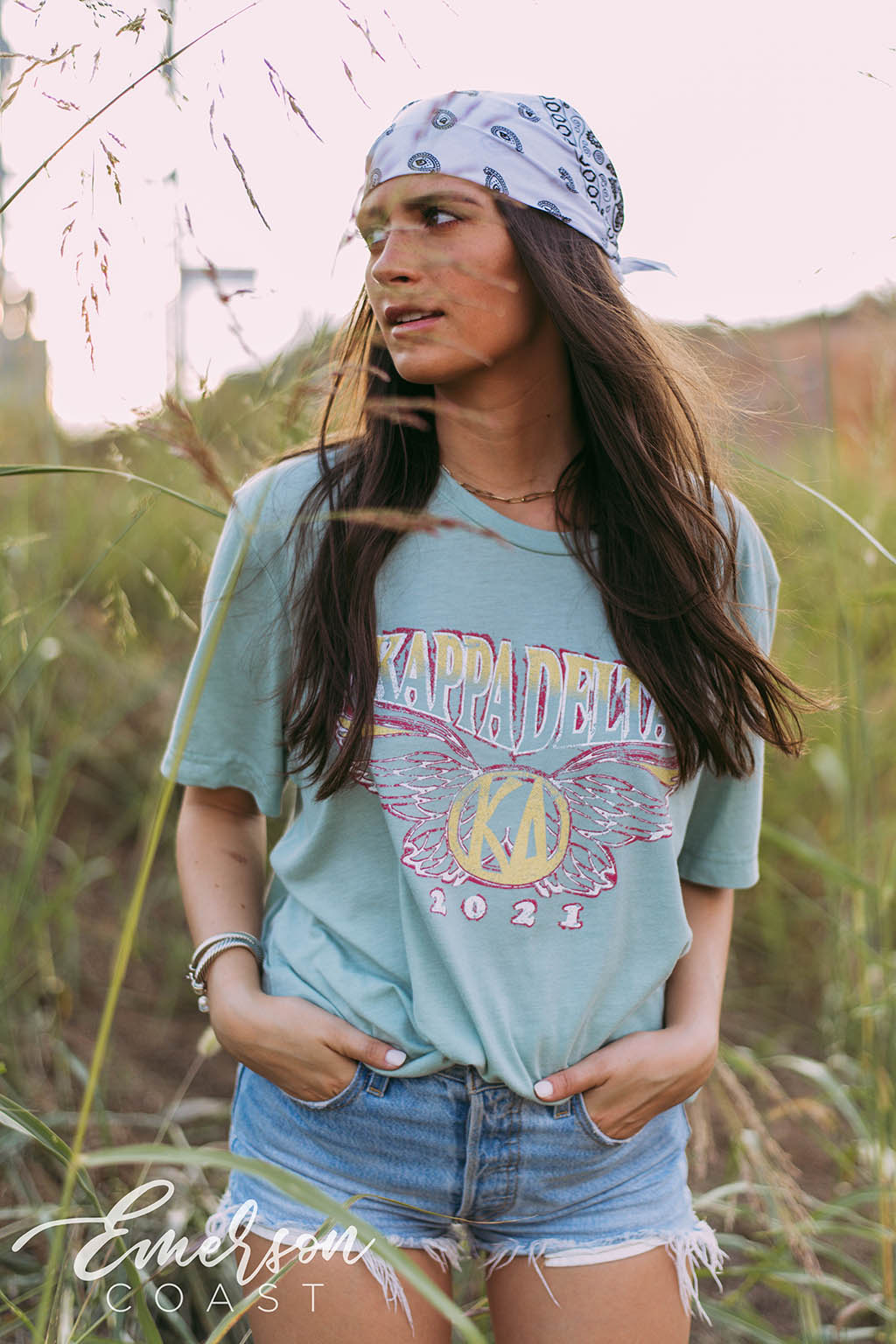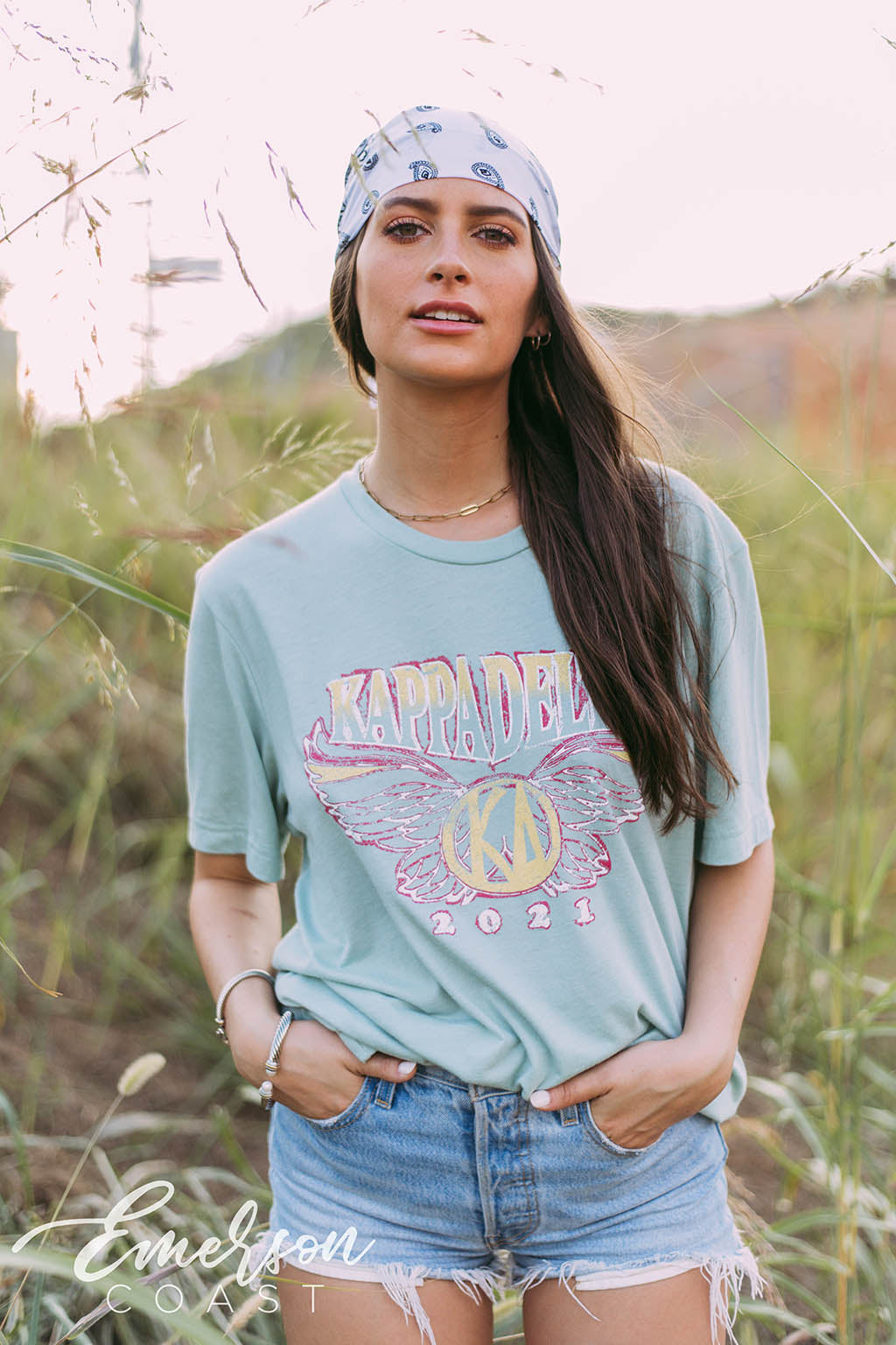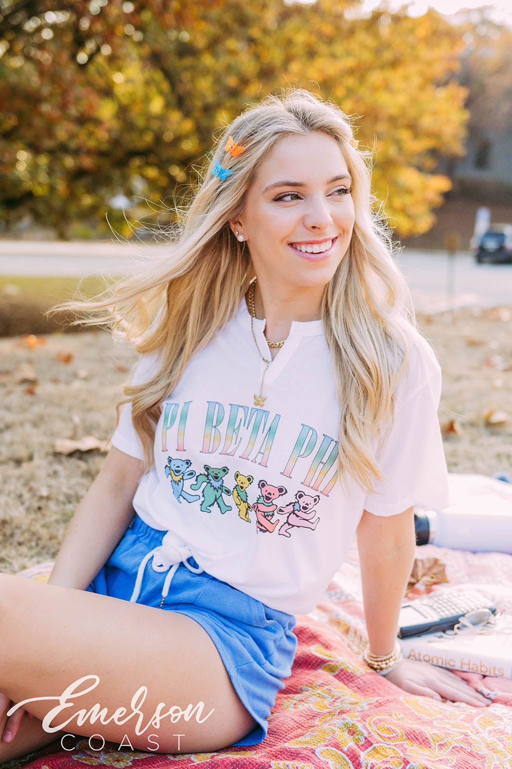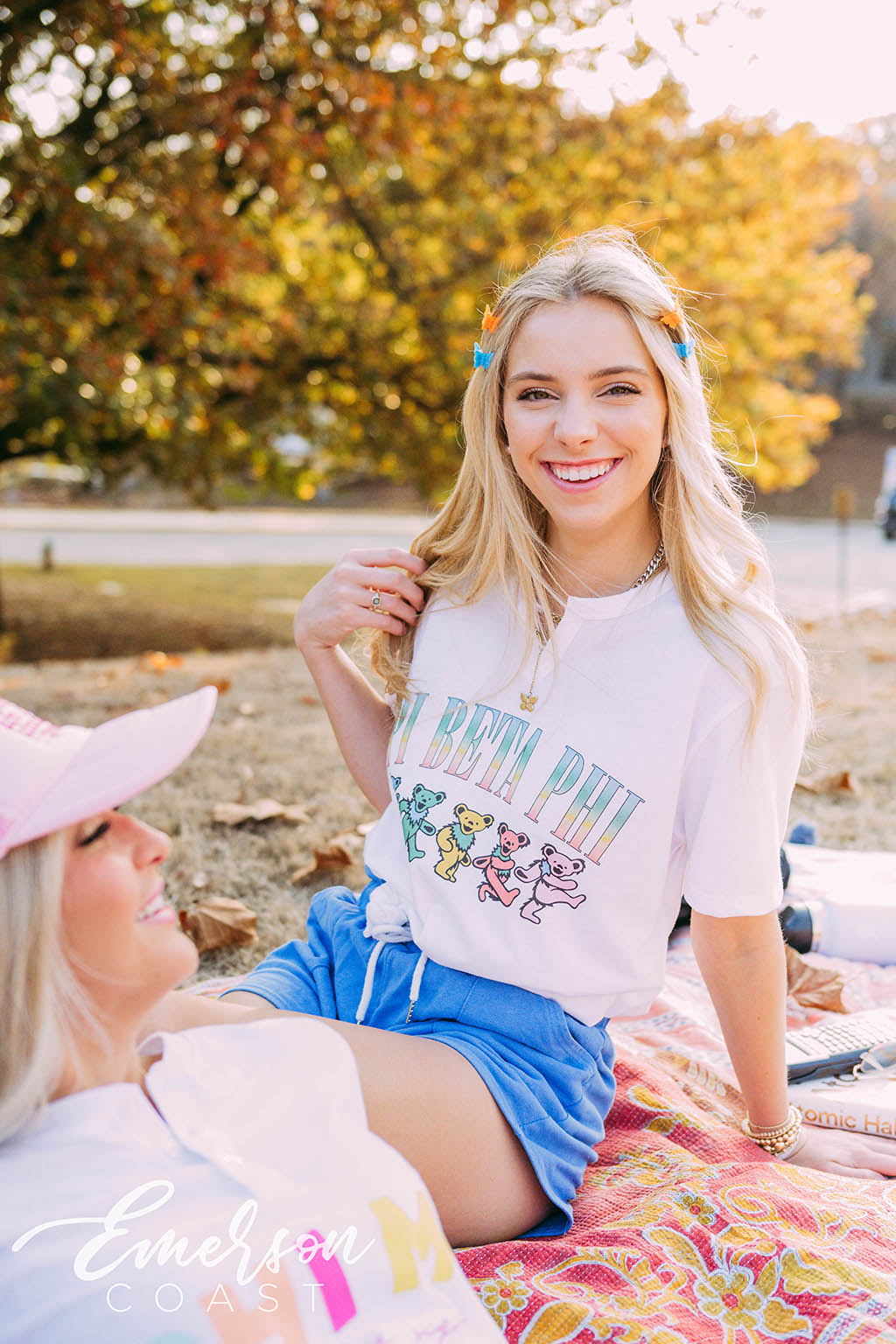 Tri Delta at Arkansas captured the magic of the Amalfi Coast for Bid Day with custom slouchy tees — white for members, cloud blue for new girls. Styled with flowy skirts and neck scarves, the whole vibe was straight out of a summer postcard.