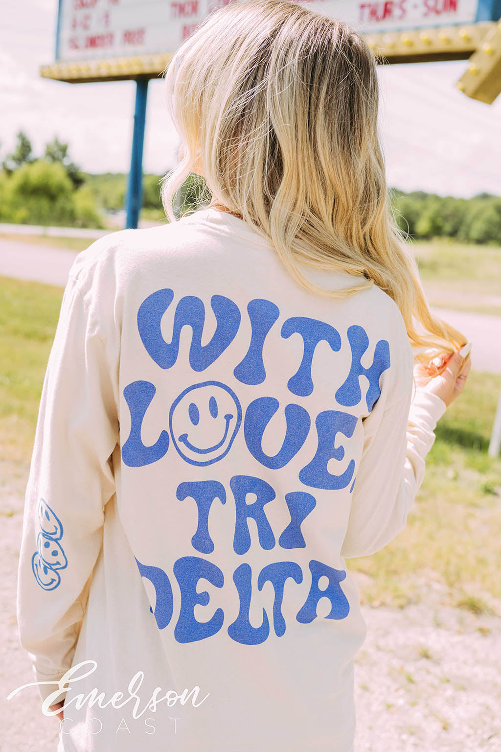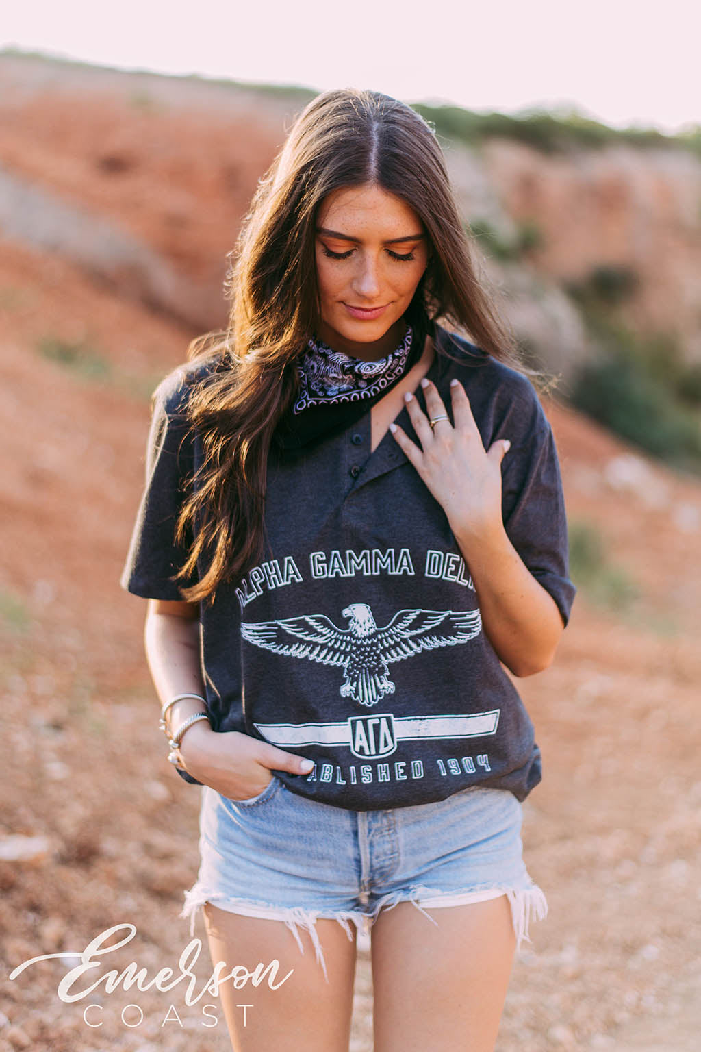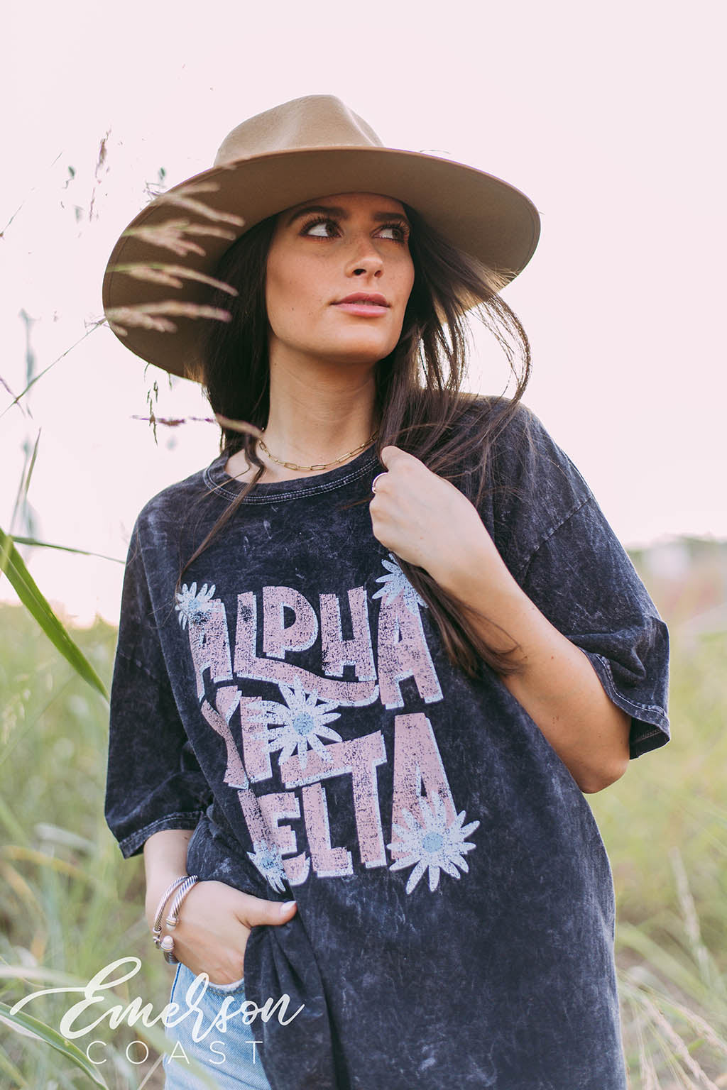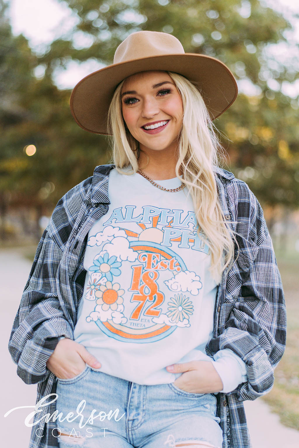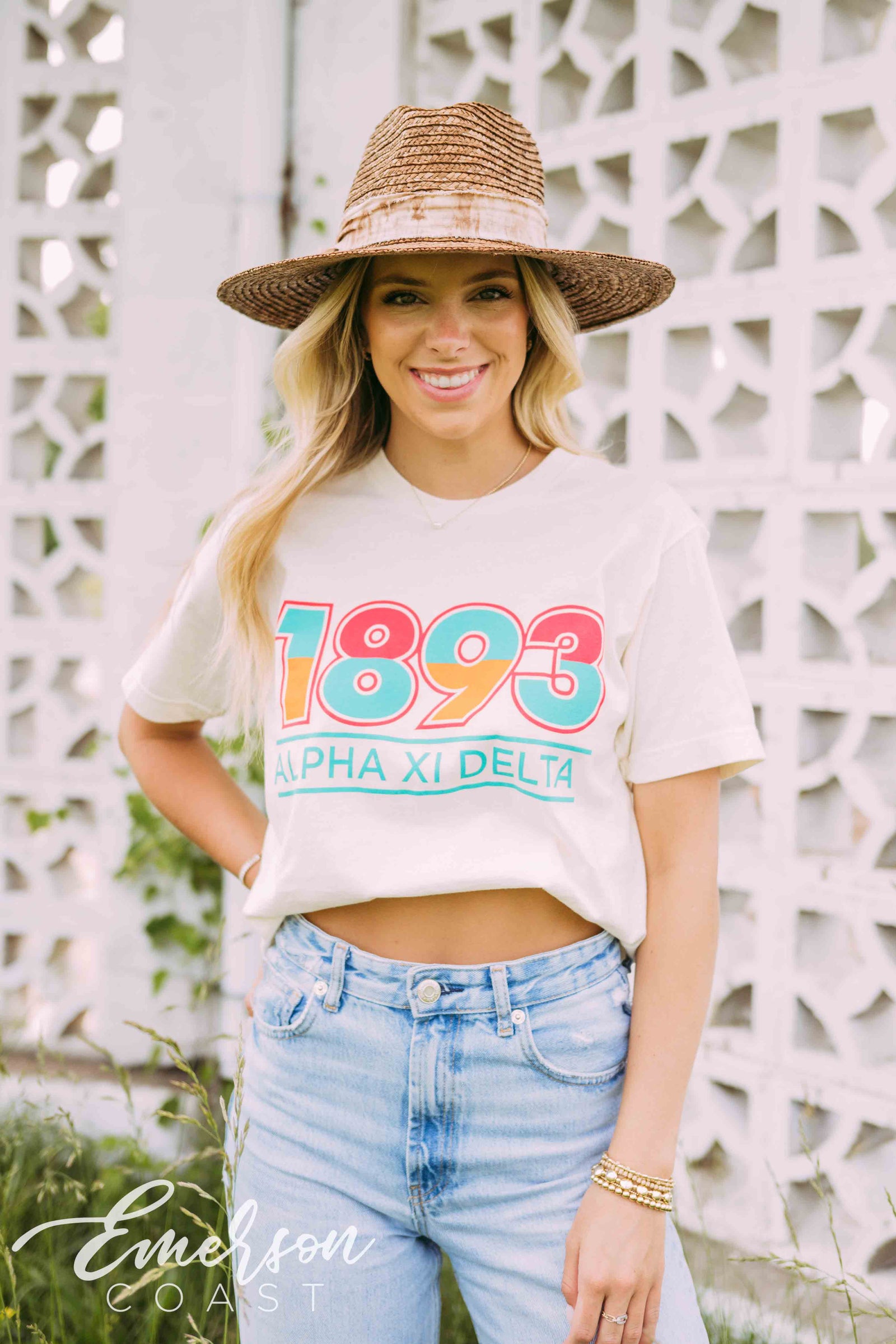 Tri Delta at Arkansas captured the magic of the Amalfi Coast for Bid Day with custom slouchy tees — white for members, cloud blue for new girls. Styled with flowy skirts and neck scarves, the whole vibe was straight out of a summer postcard.