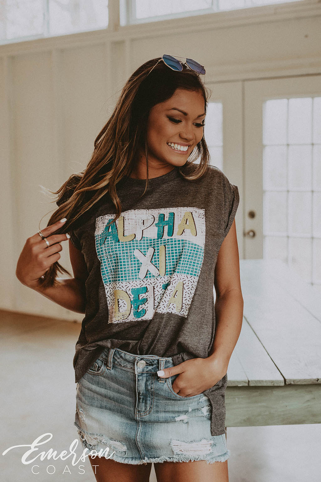 Tri Delta at Arkansas captured the magic of the Amalfi Coast for Bid Day with custom slouchy tees — white for members, cloud blue for new girls. Styled with flowy skirts and neck scarves, the whole vibe was straight out of a summer postcard.