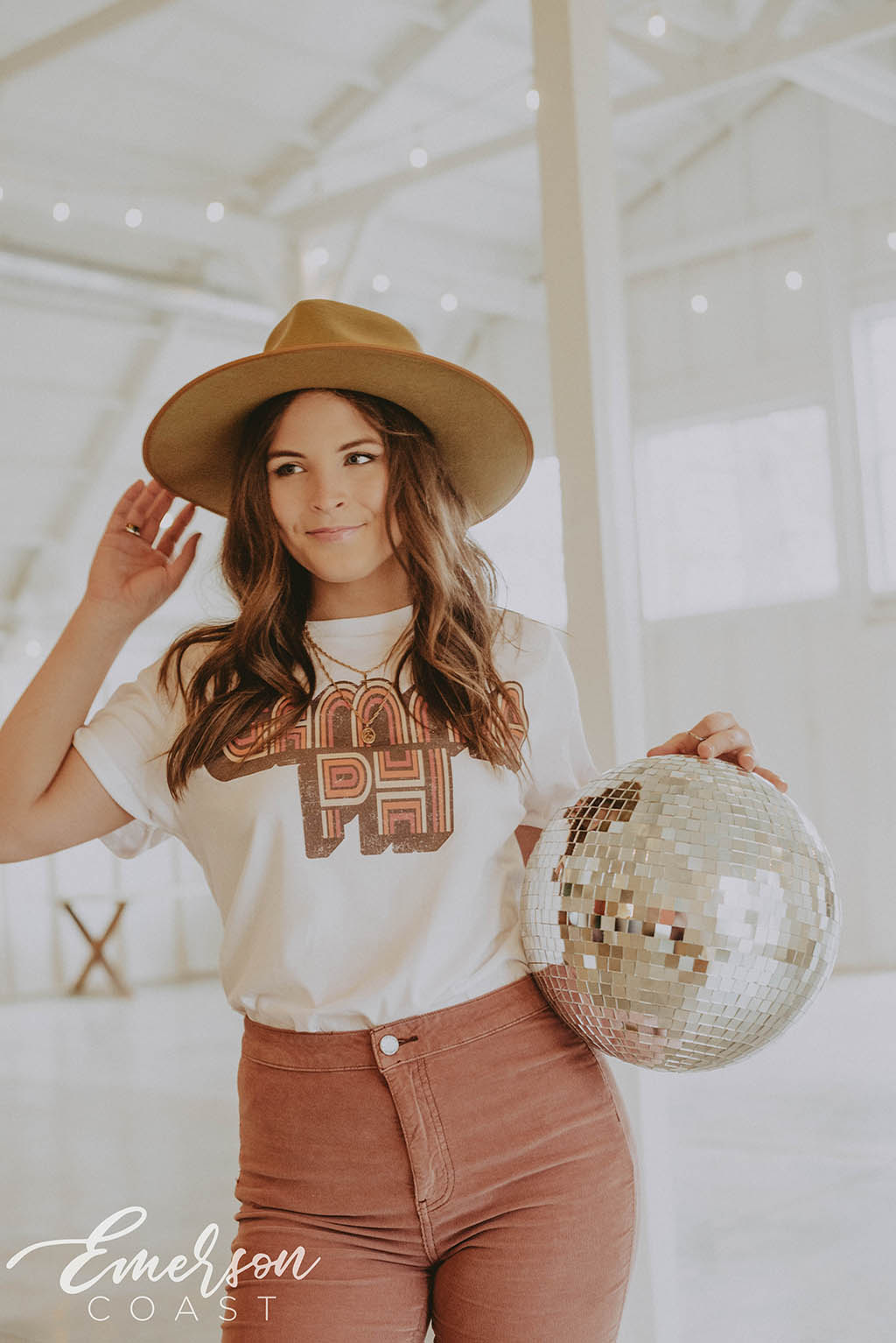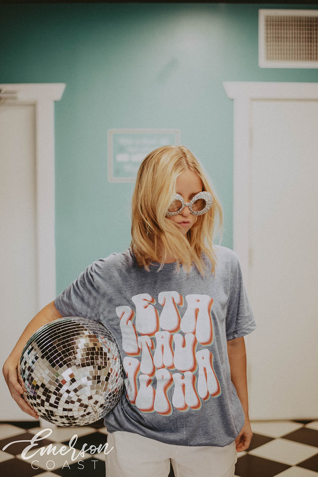 Gamma Phi at Oklahoma State floated into Bid Day with the dreamiest hot air balloon theme and the cutest pink colorblock ringer tees! Featuring soft pastel Greek letters, these tops added a fun pop of retro charm to an already magical day.