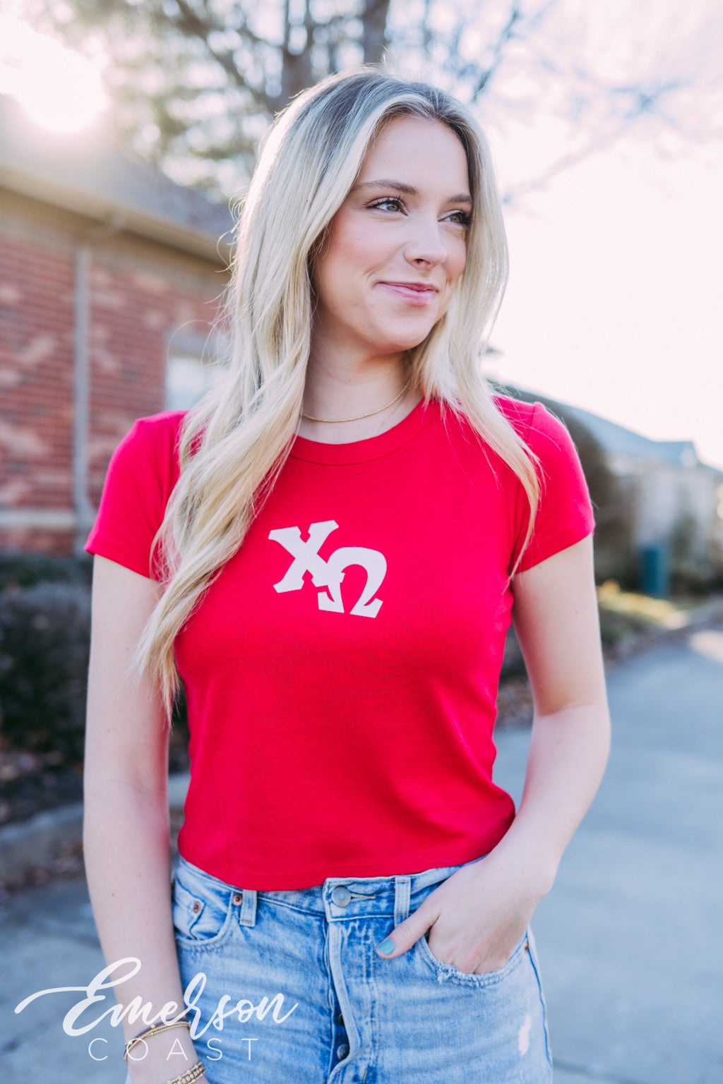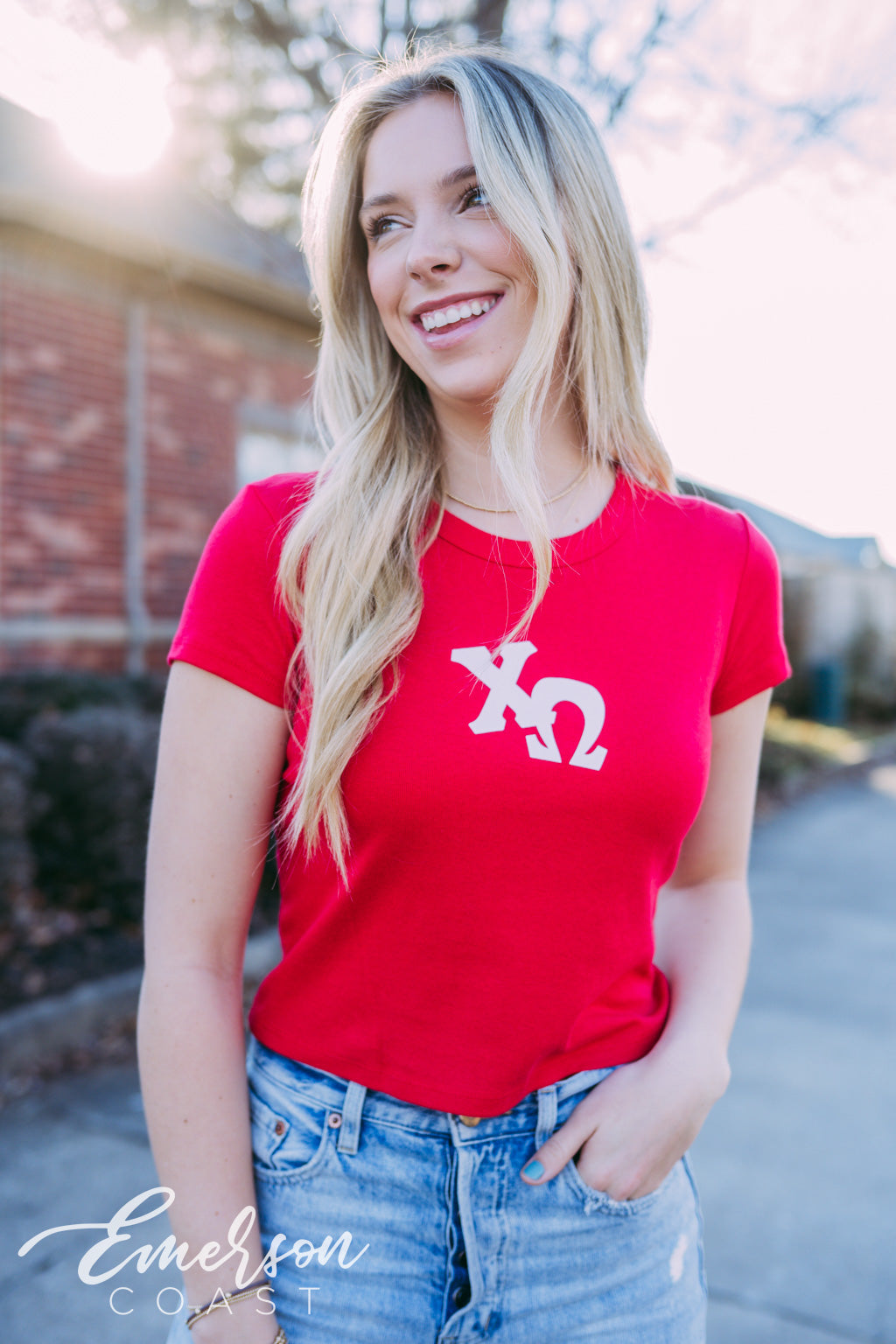 Pi Phi at Auburn made hearts melt with their white baby tees for Bid Day, featuring a sweet red heart and the phrase “I’m so happy we met.” A perfect, feel-good look to kick off sisterhood with major charm.