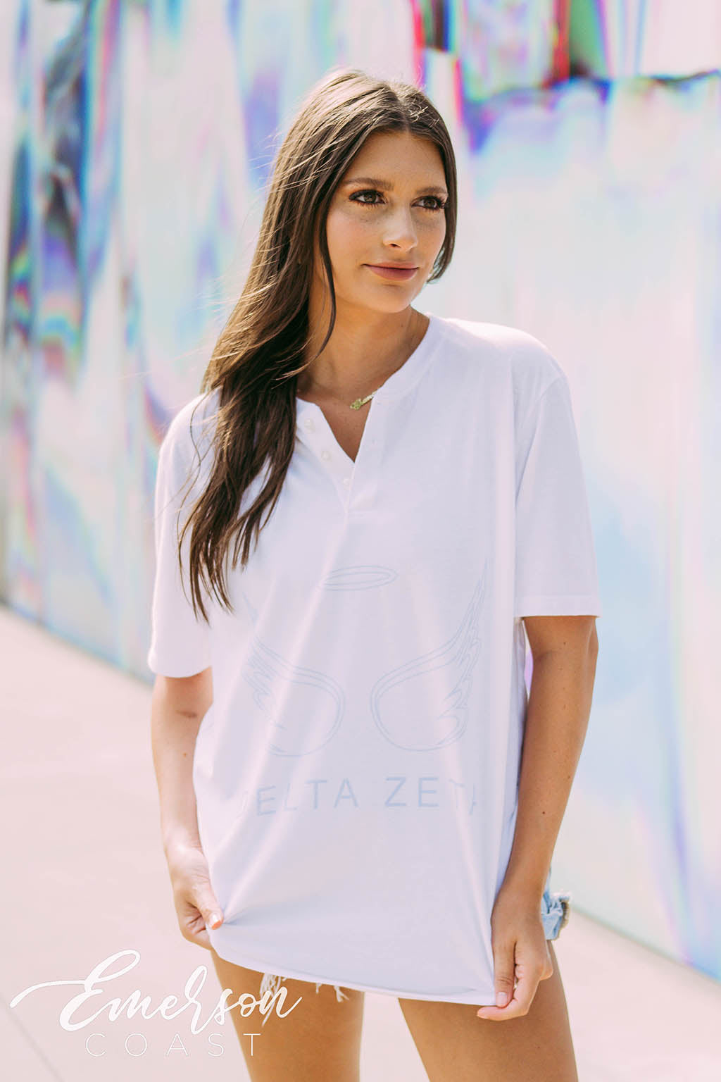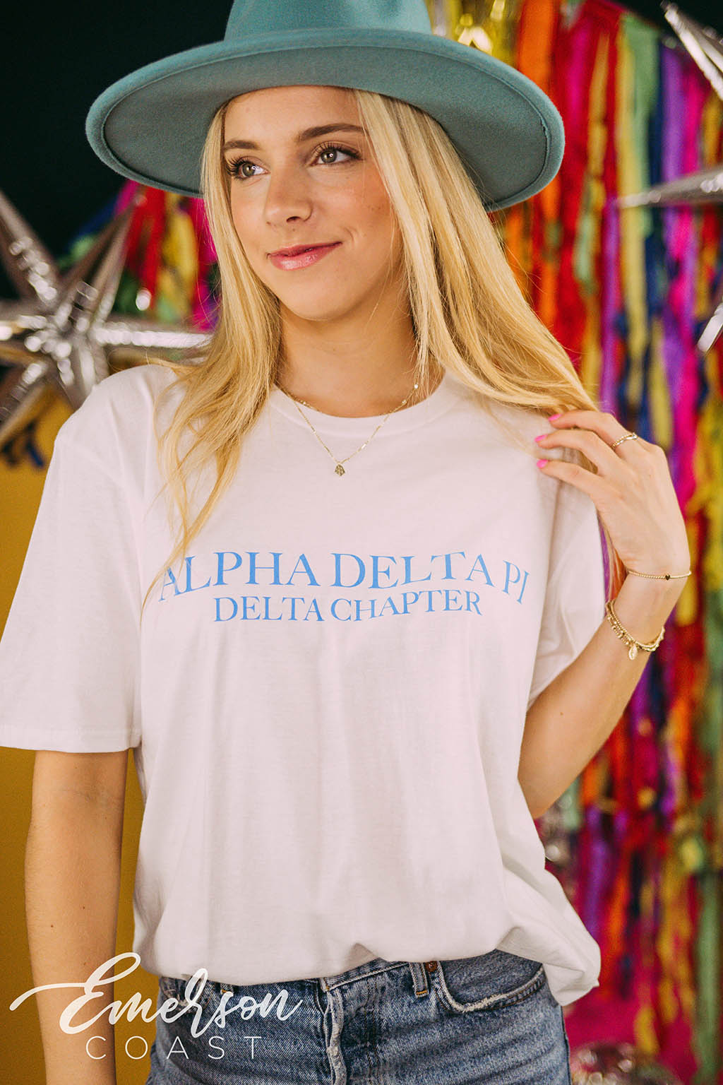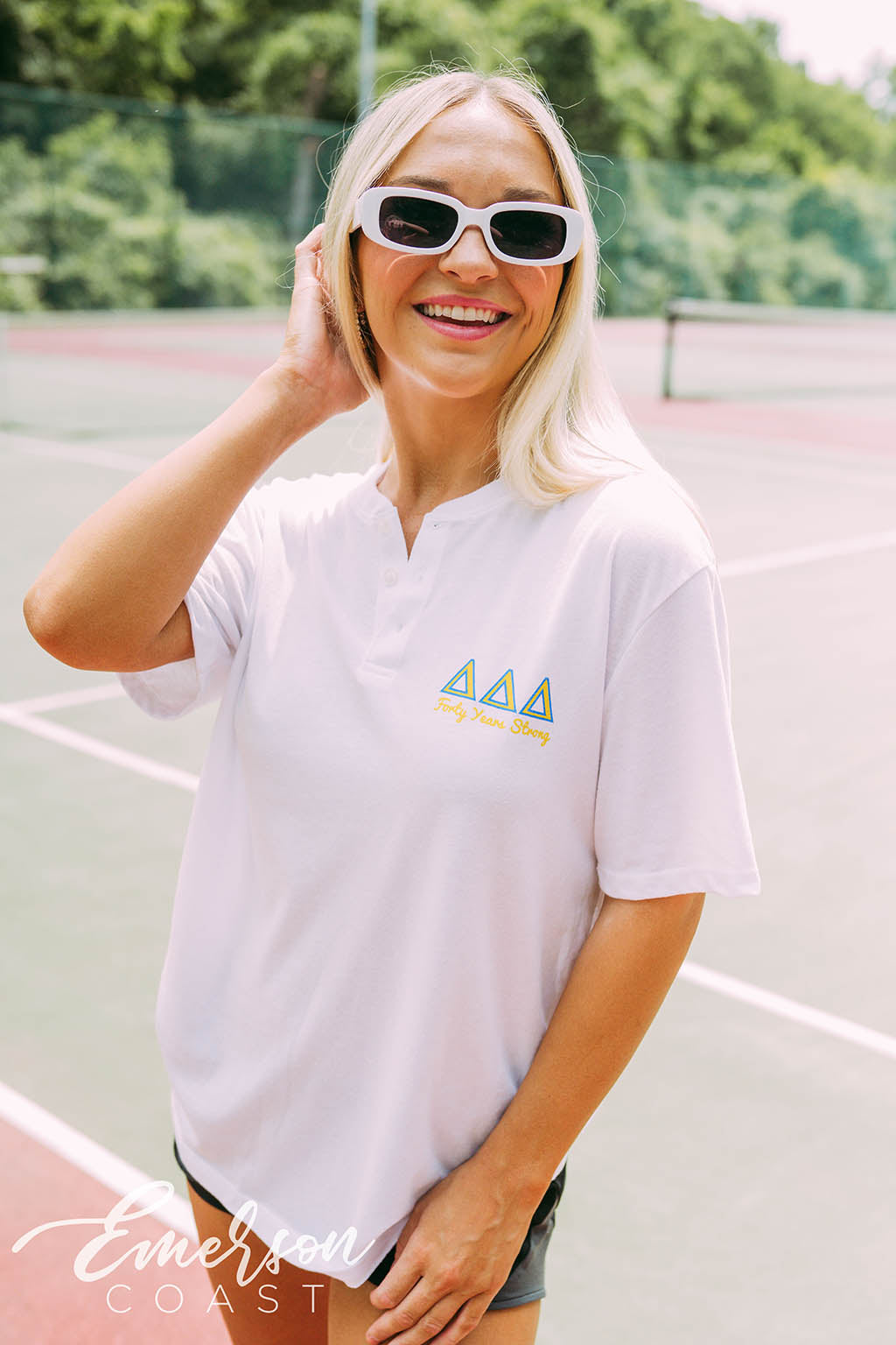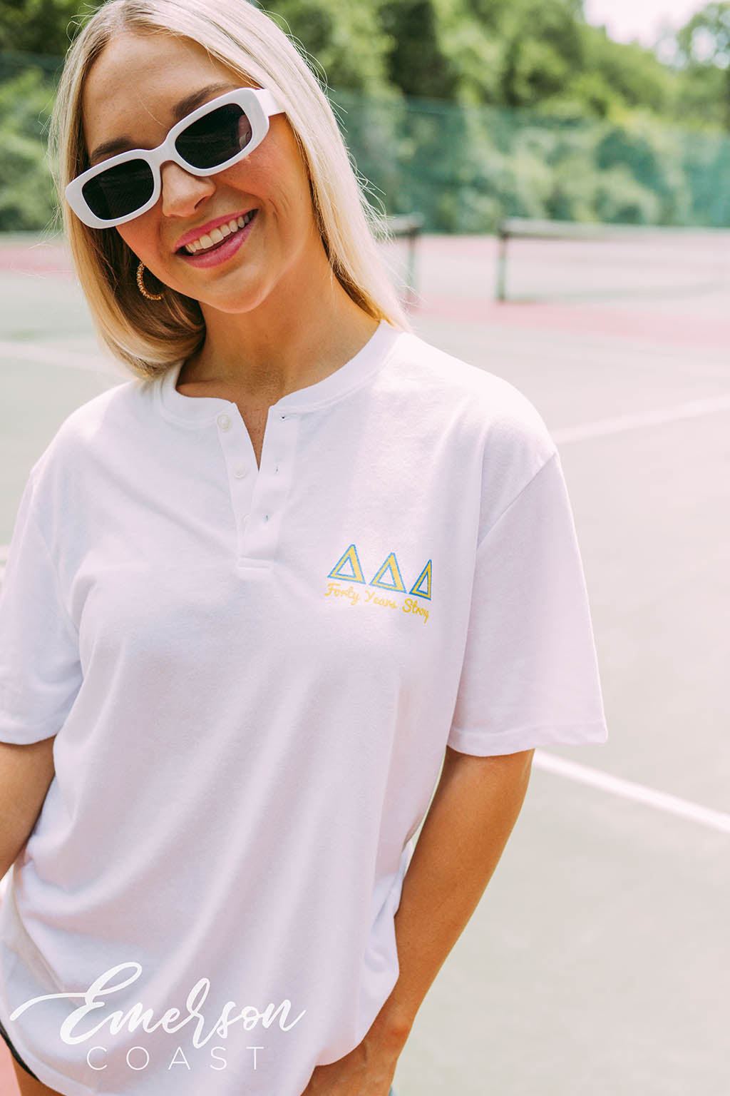 Delta Gamma at Texas A&M kept things timeless with custom white letter jerseys featuring bold Greek letters, paired with crisp white tanks for Bid Day. Clean, elevated, and full of spirit — their new members definitely felt the love in style!