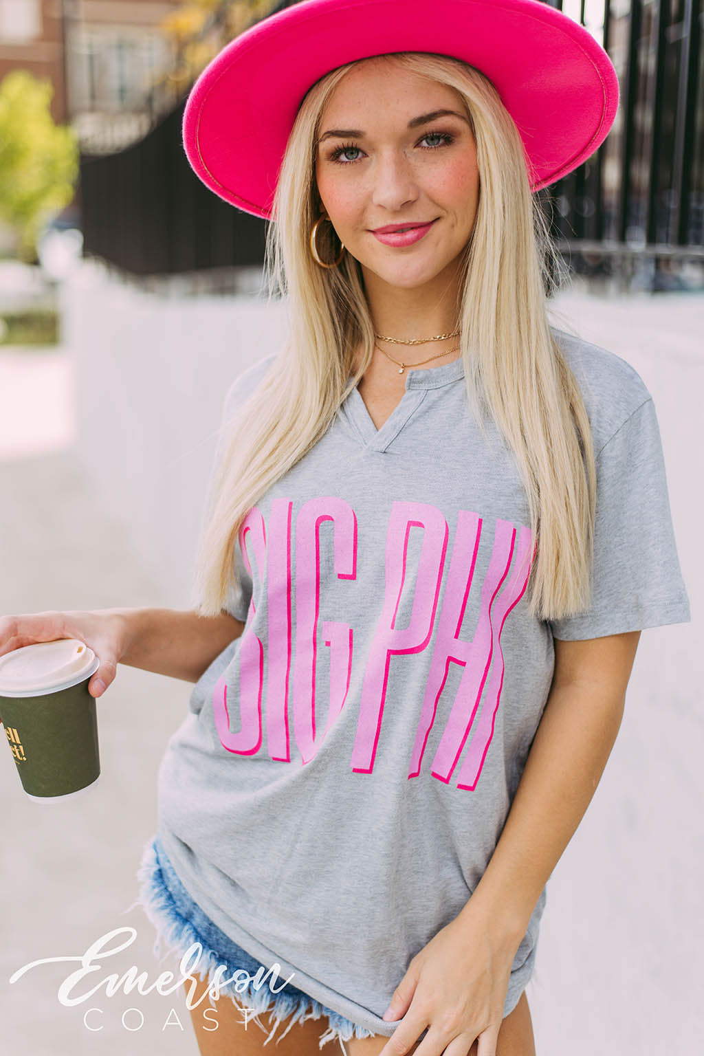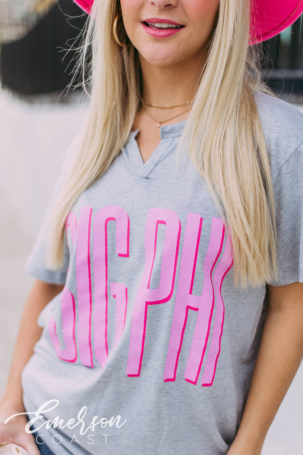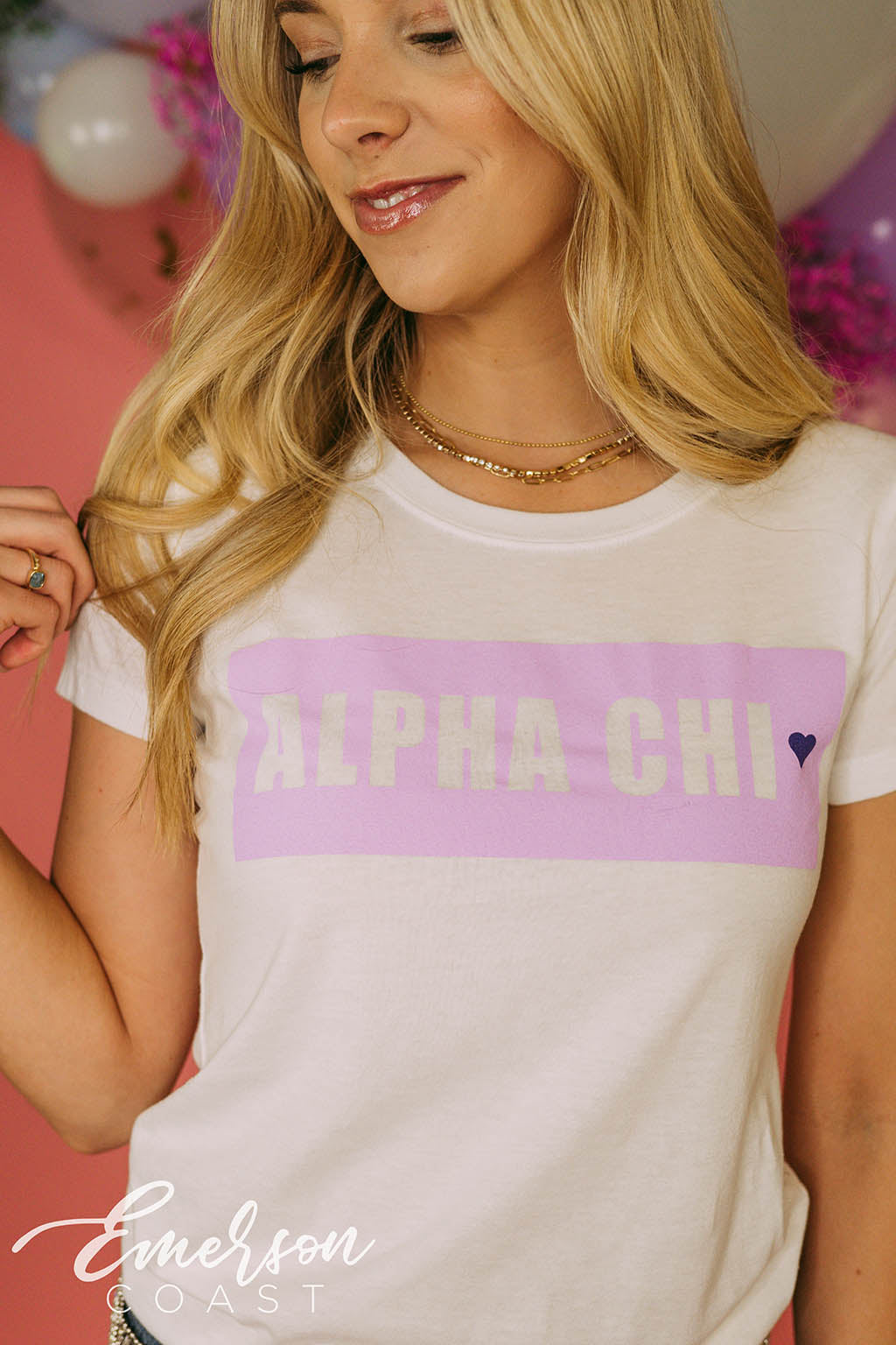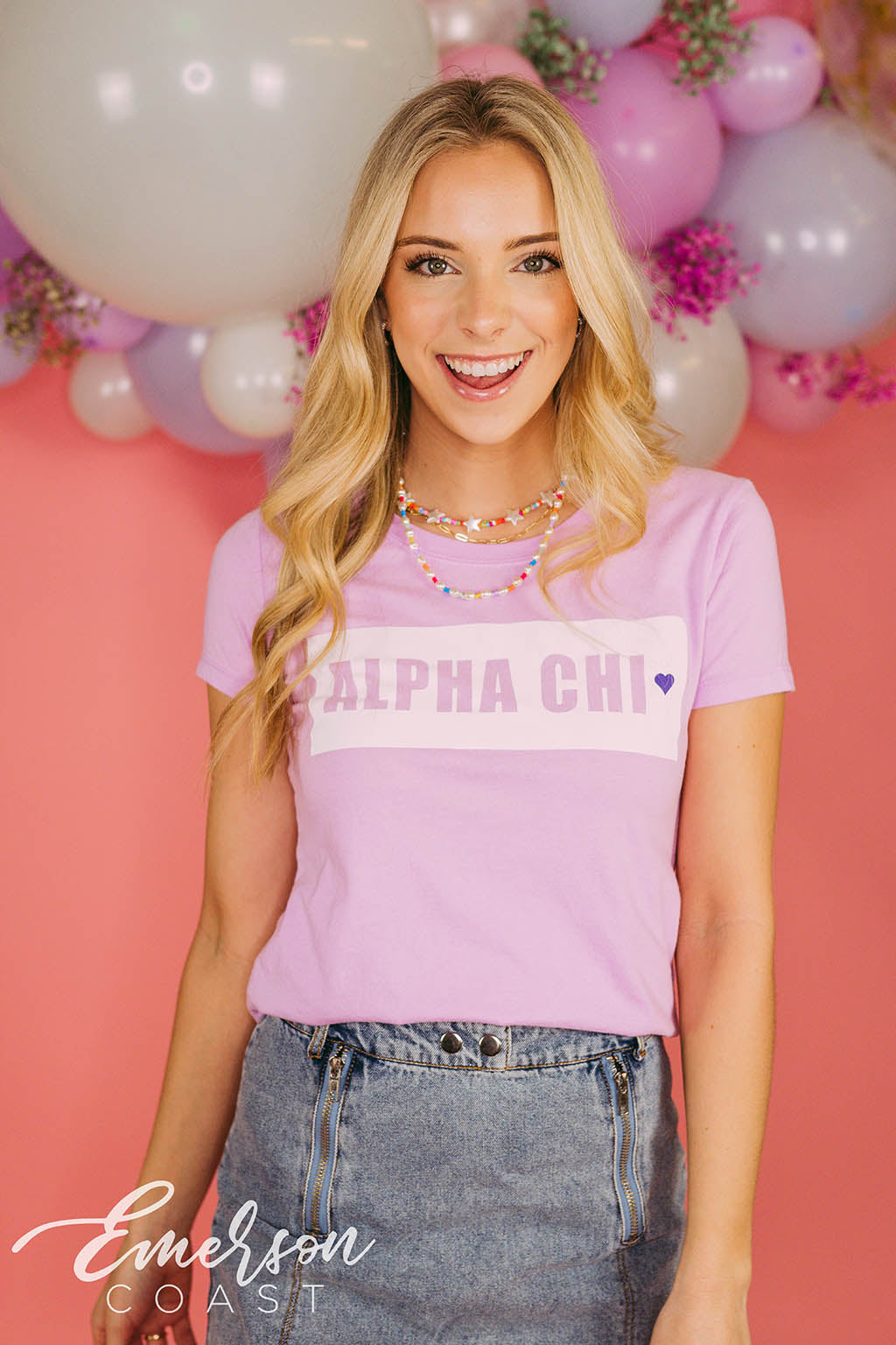 Pi Phi at Auburn made hearts melt with their white baby tees for Bid Day, featuring a sweet red heart and the phrase “I’m so happy we met.” A perfect, feel-good look to kick off sisterhood with major charm.