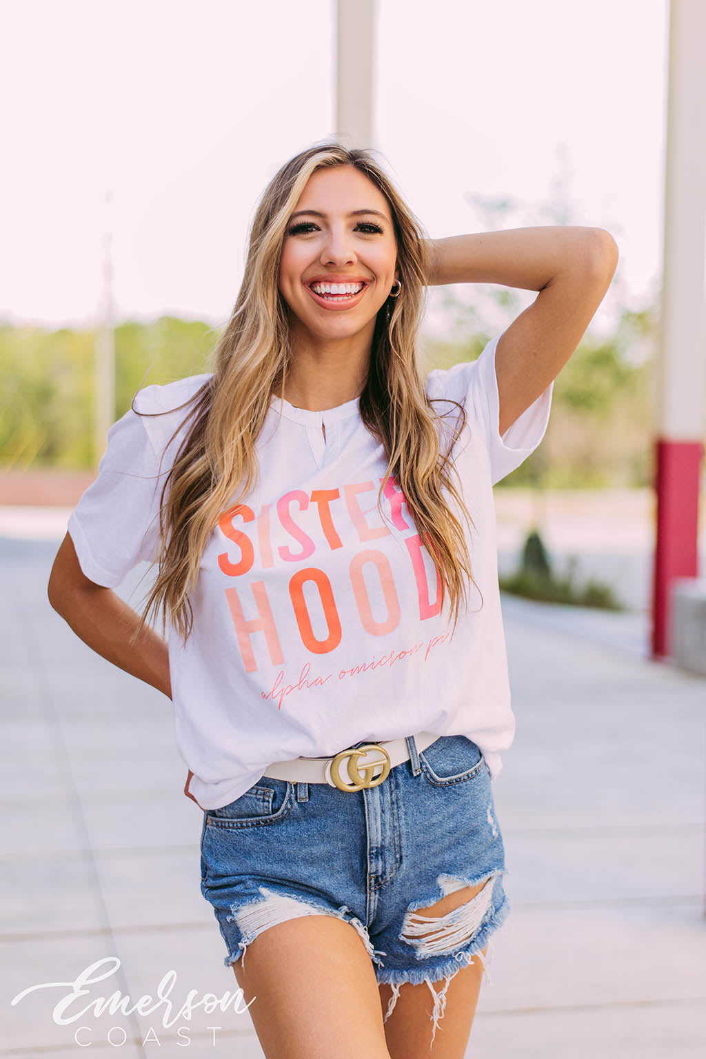 Alpha O will be loving this simple design that features "Sisterhood" across the front in alternating colors.