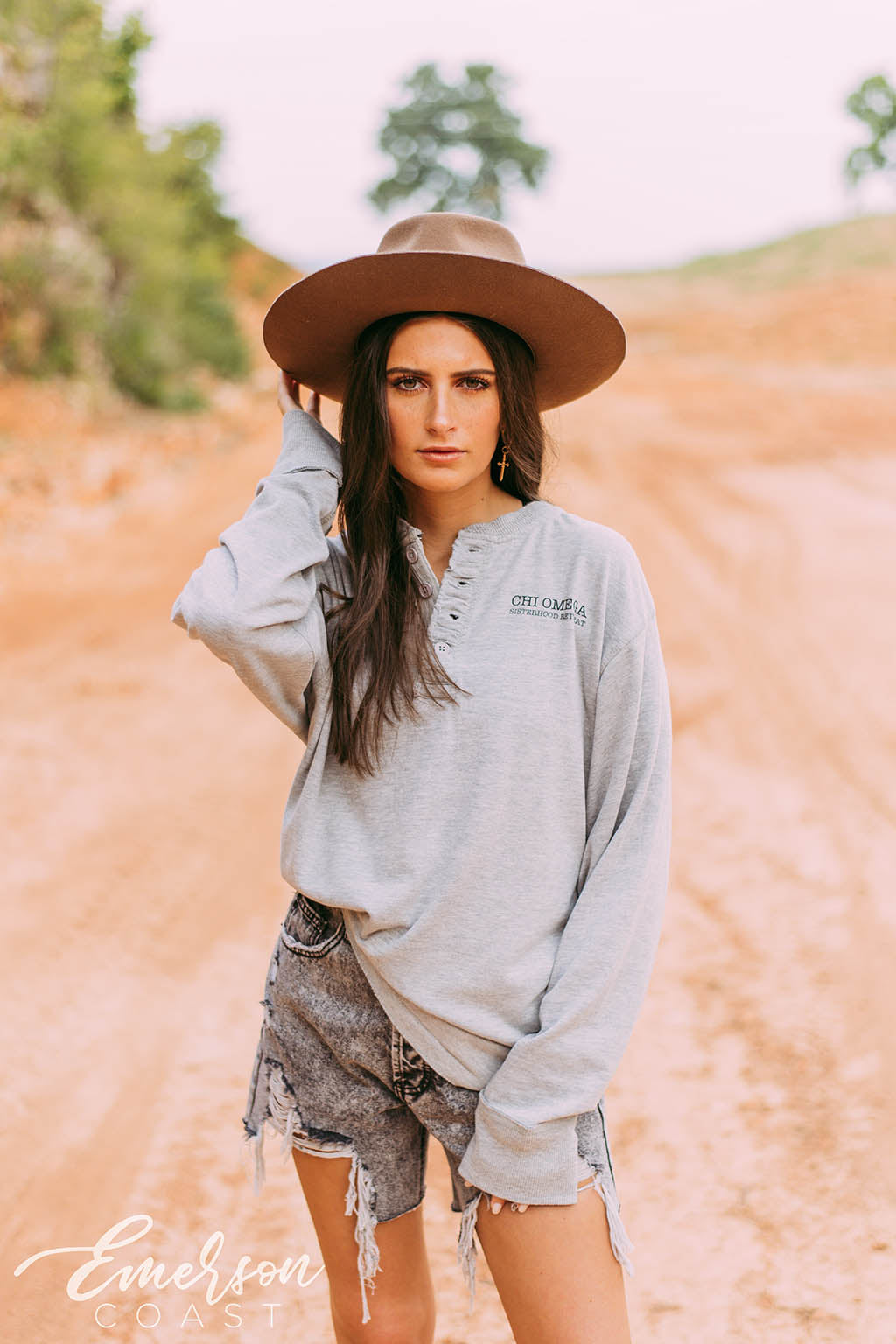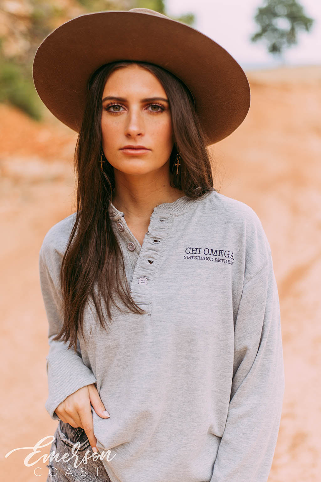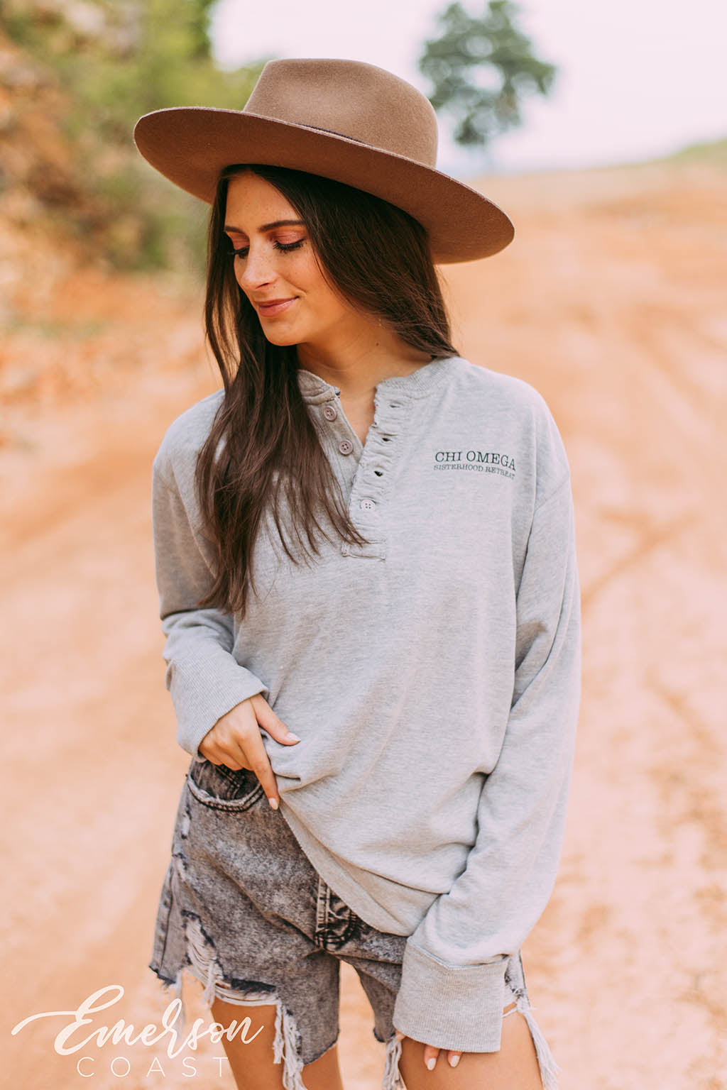 Stay soft with the Chi Omega Sisterhood Retreat Long Sleeve Henley!