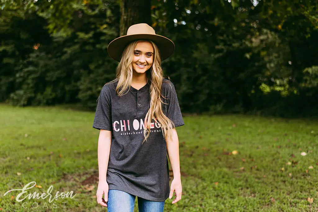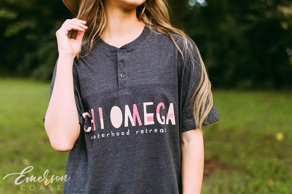 Be different with the Chi Omega sisterhood Retreat Short Sleeve Henley!