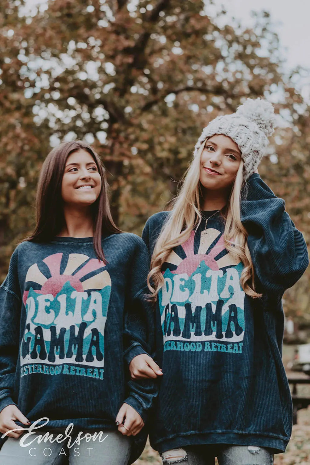 Get groovy with the Delta Gamma Sisterhood Retreat Corduroy Crewneck!