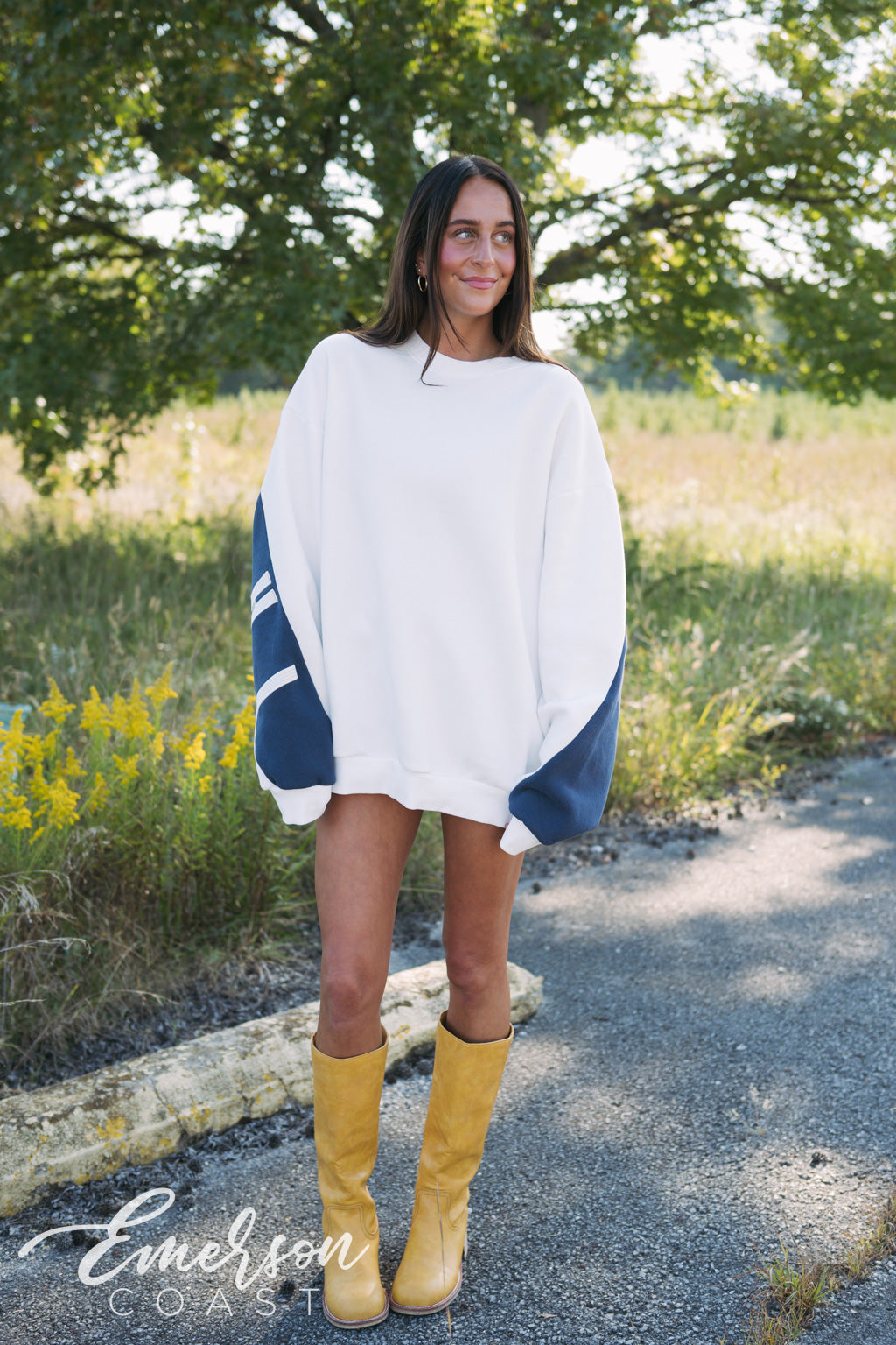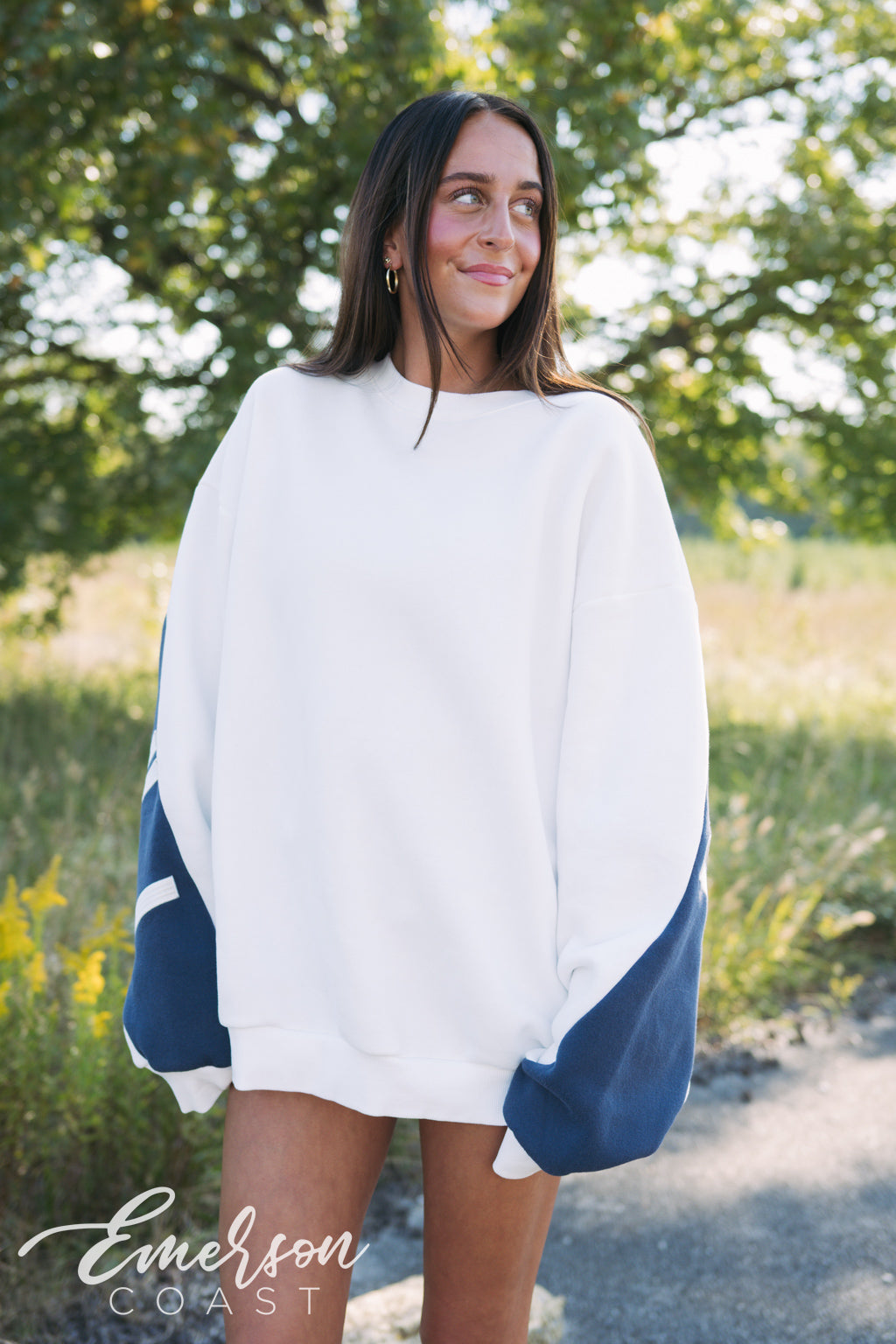 The Pi Beta Phi Embroidered Billboard Crew is a new, exclusive style from Emerson Coast ✨. Designed with an oversized, super-soft fit, this standout crew features a bold navy panel stretching across the back from sleeve to sleeve with Pi Beta Phi embroidered large across it. The front contrasts in crisp white fabric, creating a bold, elevated look that’s perfect for your chapter 💙🤍.