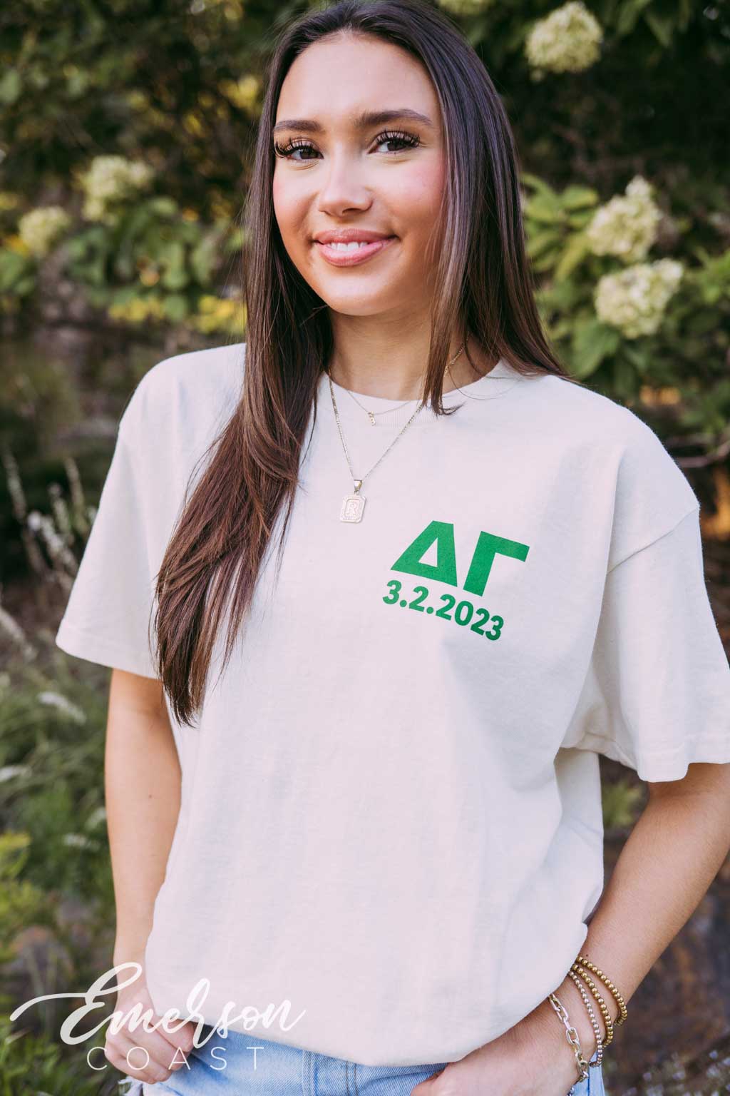 Delta Gamma at Texas A&M kept things timeless with custom white letter jerseys featuring bold Greek letters, paired with crisp white tanks for Bid Day. Clean, elevated, and full of spirit — their new members definitely felt the love in style!