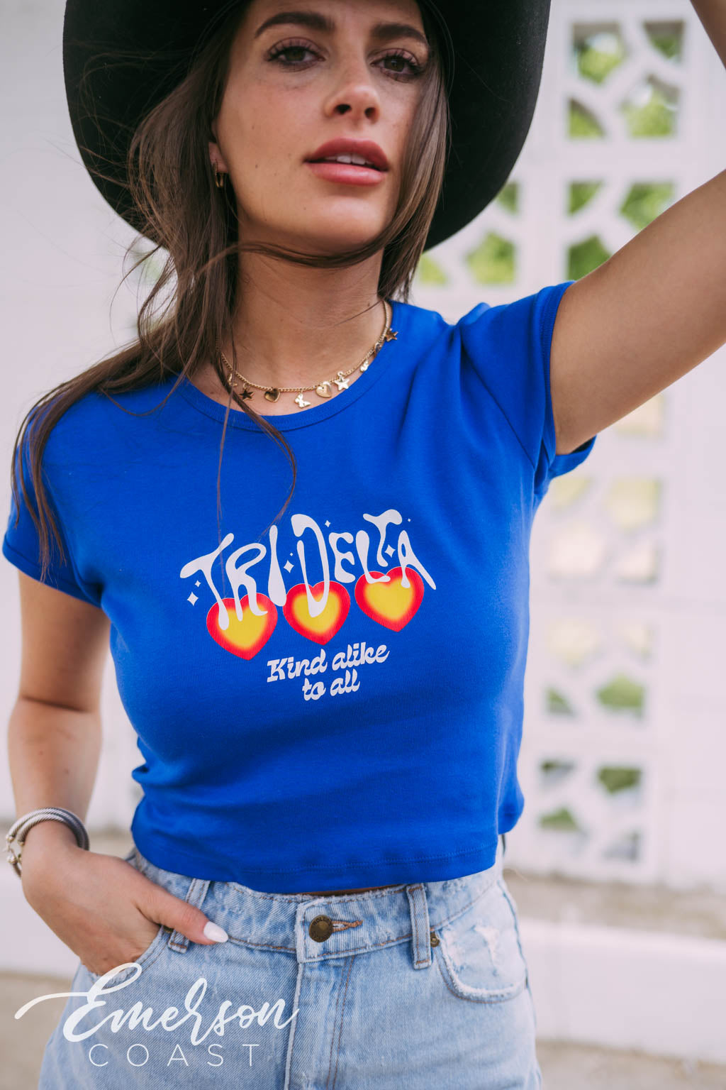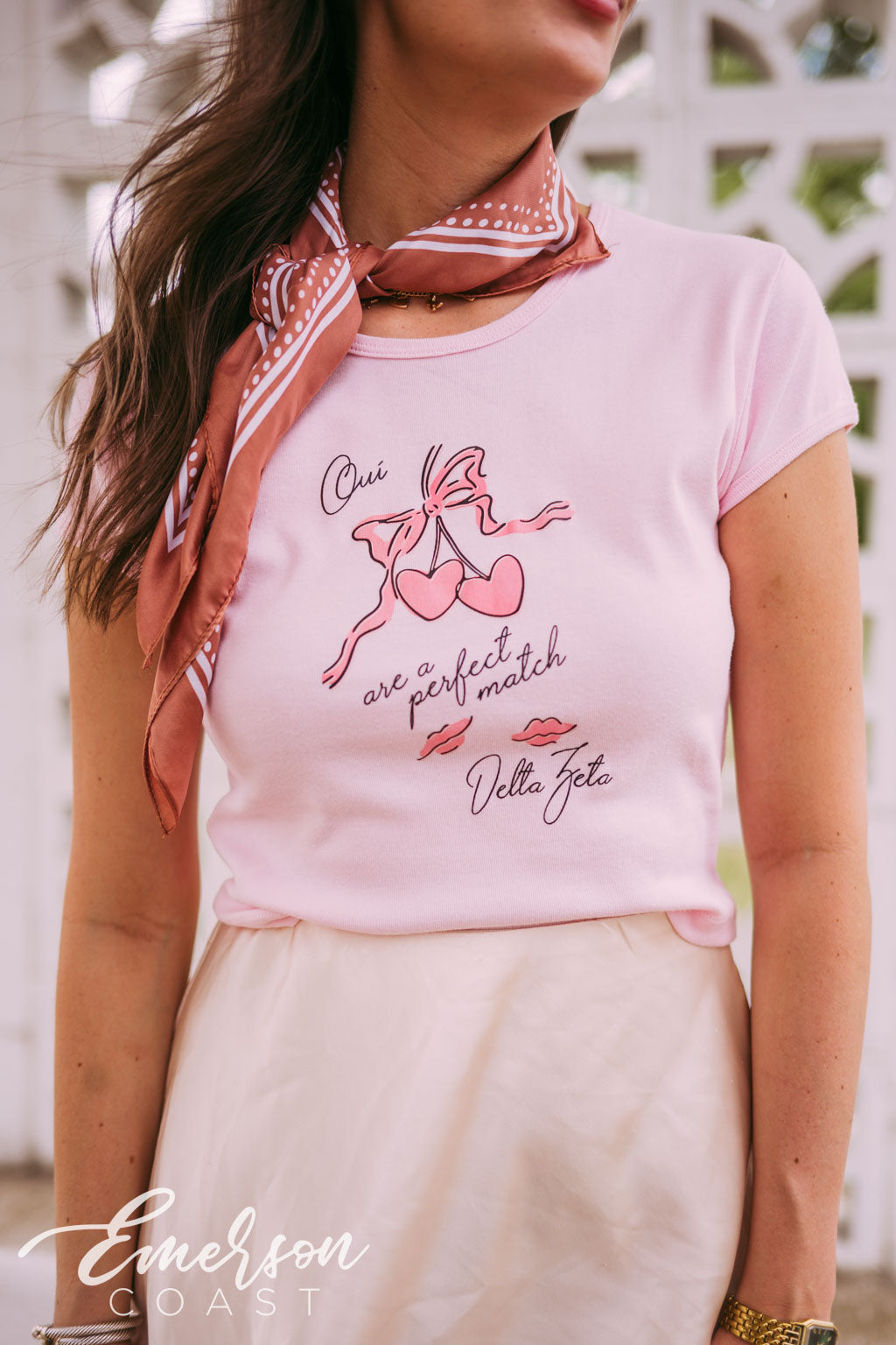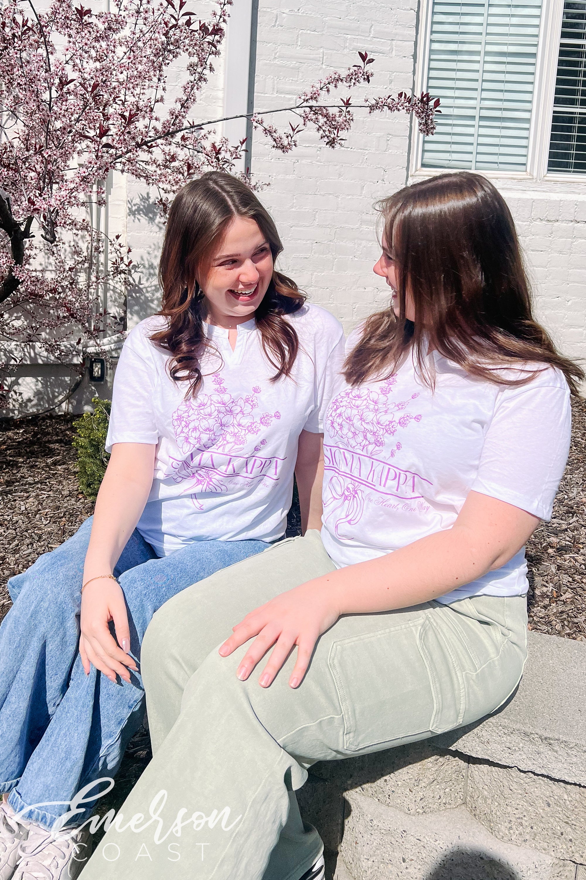 Pi Phi at Auburn made hearts melt with their white baby tees for Bid Day, featuring a sweet red heart and the phrase “I’m so happy we met.” A perfect, feel-good look to kick off sisterhood with major charm.