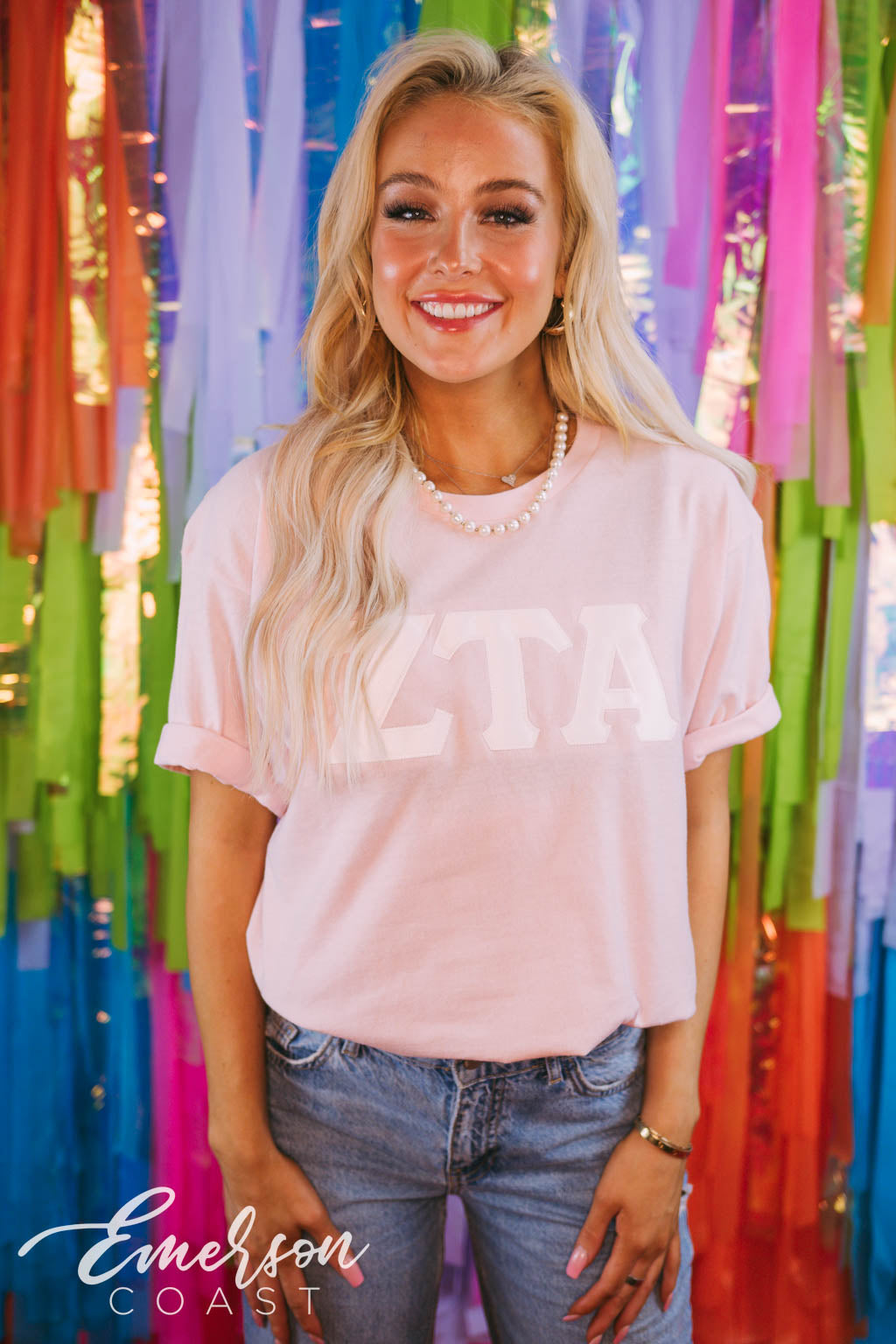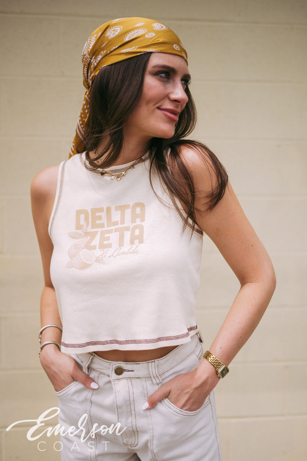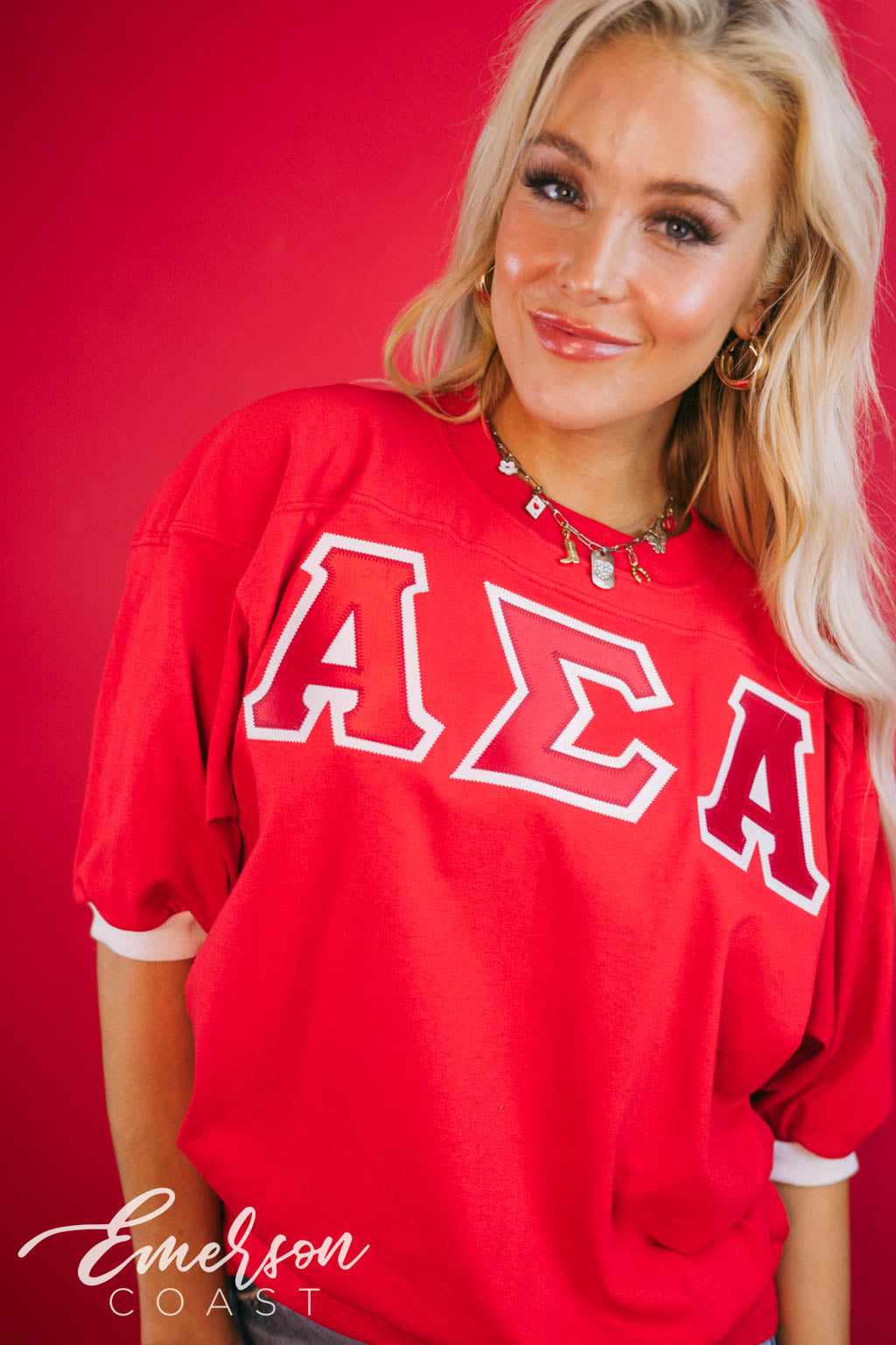 Delta Gamma at Texas A&M kept things timeless with custom white letter jerseys featuring bold Greek letters, paired with crisp white tanks for Bid Day. Clean, elevated, and full of spirit — their new members definitely felt the love in style!