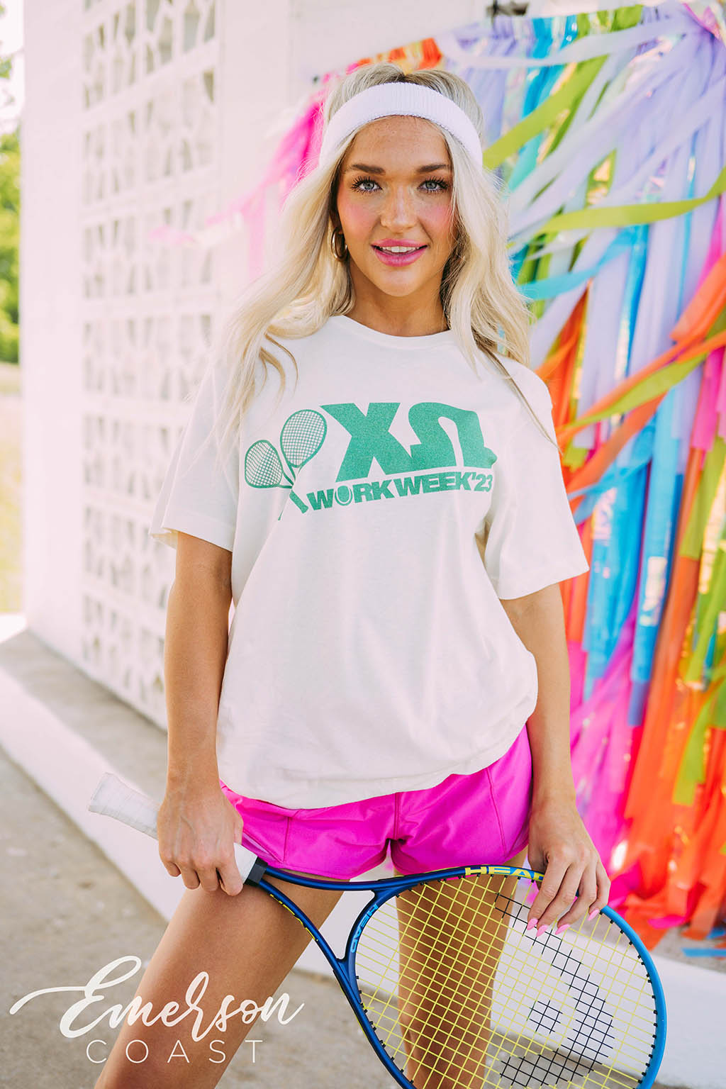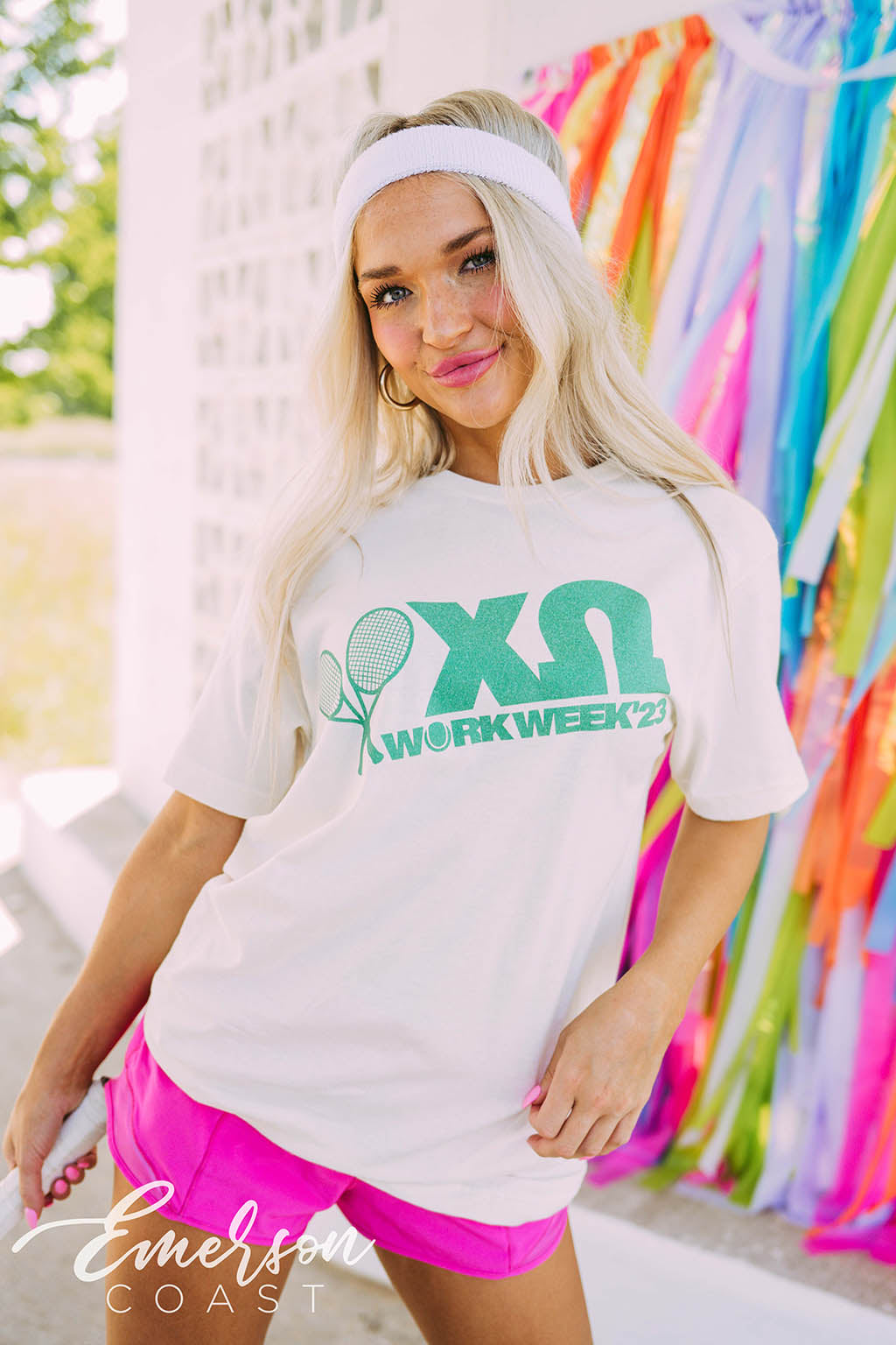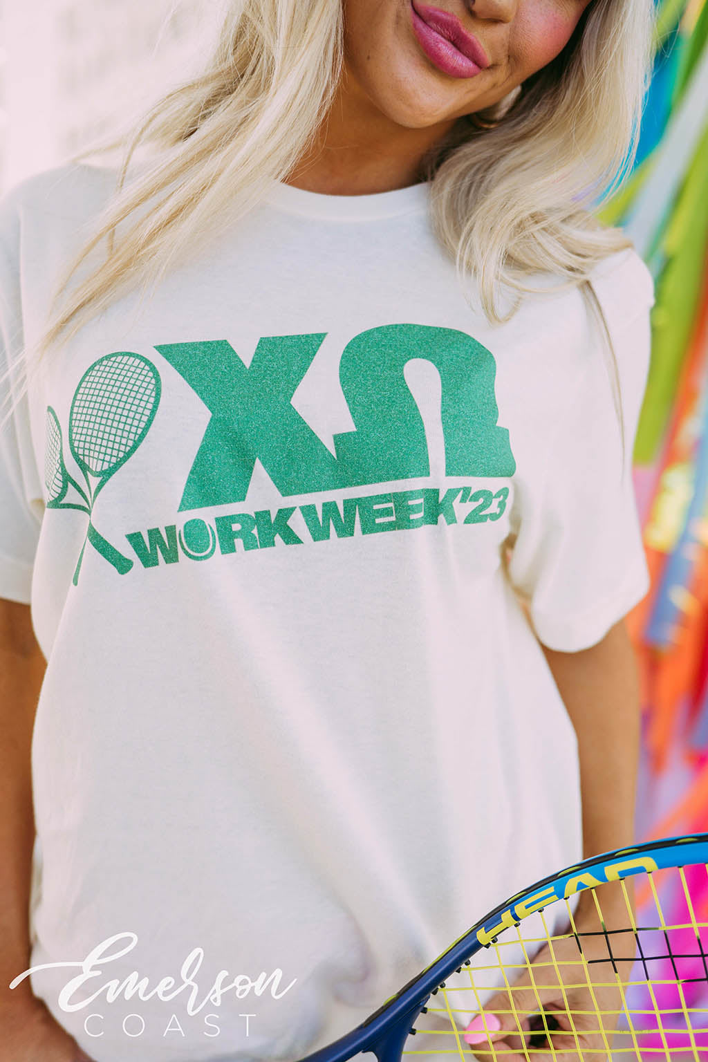 This classic white tee is stylish with a twist - a bold green block font featuring Chi Omega greek letters and Work Week 23 underneath. And two cute tennis rackets complete the look! Whether you want to make a statement of sisterhood or just add a sporty vibe to your group's wardrobe, this shirt is an ideal choice. Not only is it comfortable and flattering, but its trendy! So forget scouring the internet for work week wear – put the search on hold and go with this one-of-a-kind Chi O Tennis Work Week Shirt today!