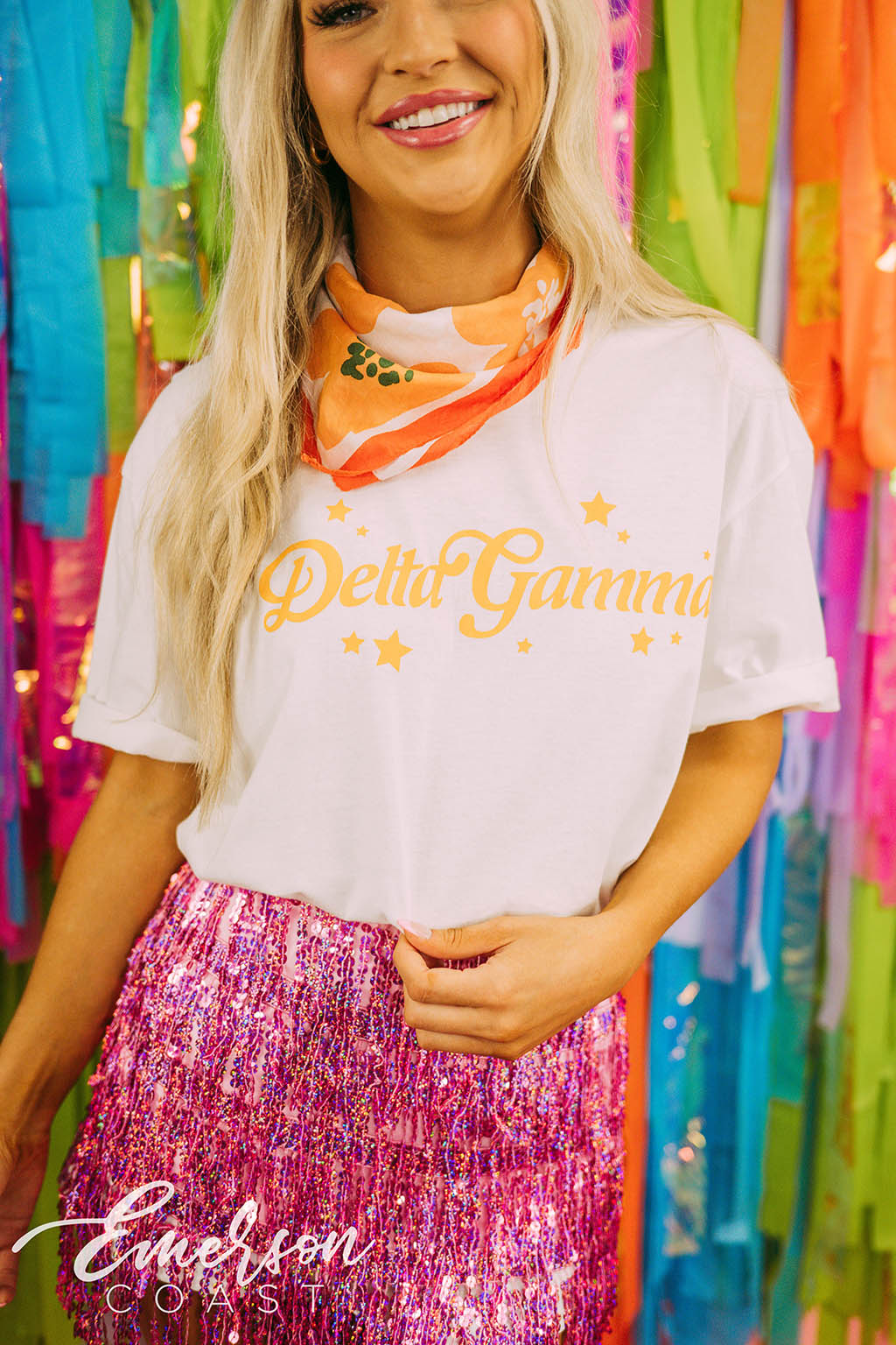 Delta Gamma at Texas A&M kept things timeless with custom white letter jerseys featuring bold Greek letters, paired with crisp white tanks for Bid Day. Clean, elevated, and full of spirit — their new members definitely felt the love in style!