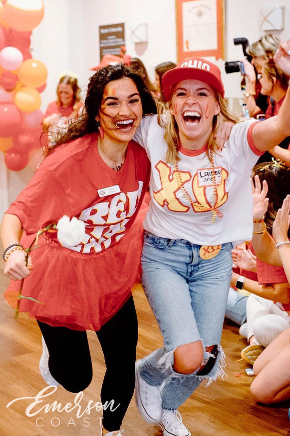 Pi Phi at Auburn made hearts melt with their white baby tees for Bid Day, featuring a sweet red heart and the phrase “I’m so happy we met.” A perfect, feel-good look to kick off sisterhood with major charm.