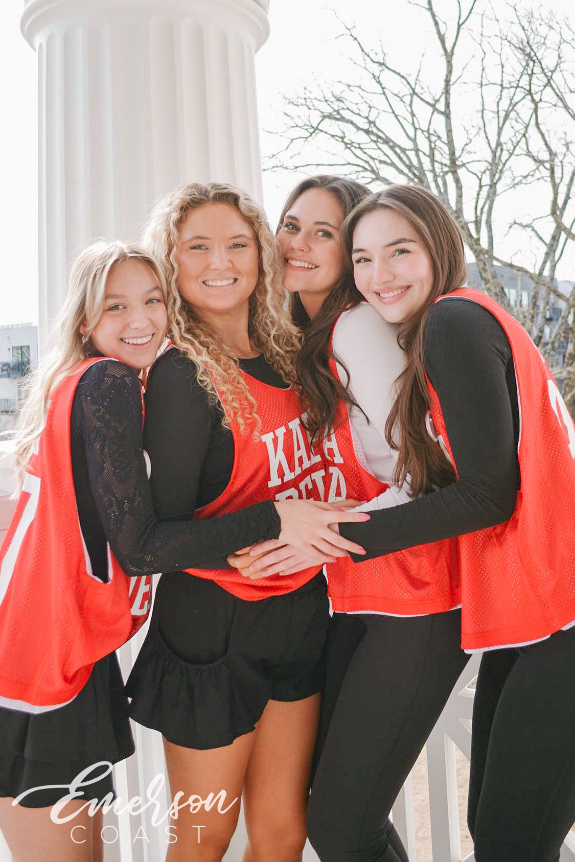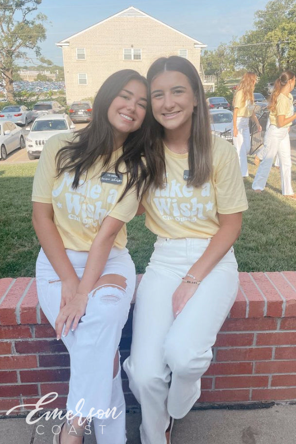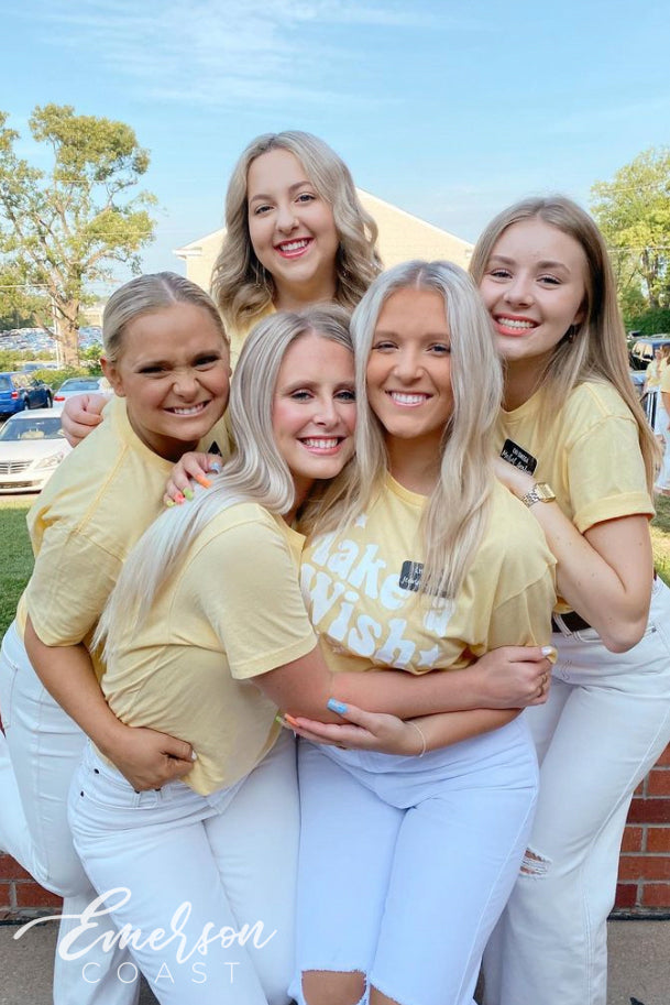 Delta Gamma at Texas A&M kept things timeless with custom white letter jerseys featuring bold Greek letters, paired with crisp white tanks for Bid Day. Clean, elevated, and full of spirit — their new members definitely felt the love in style!