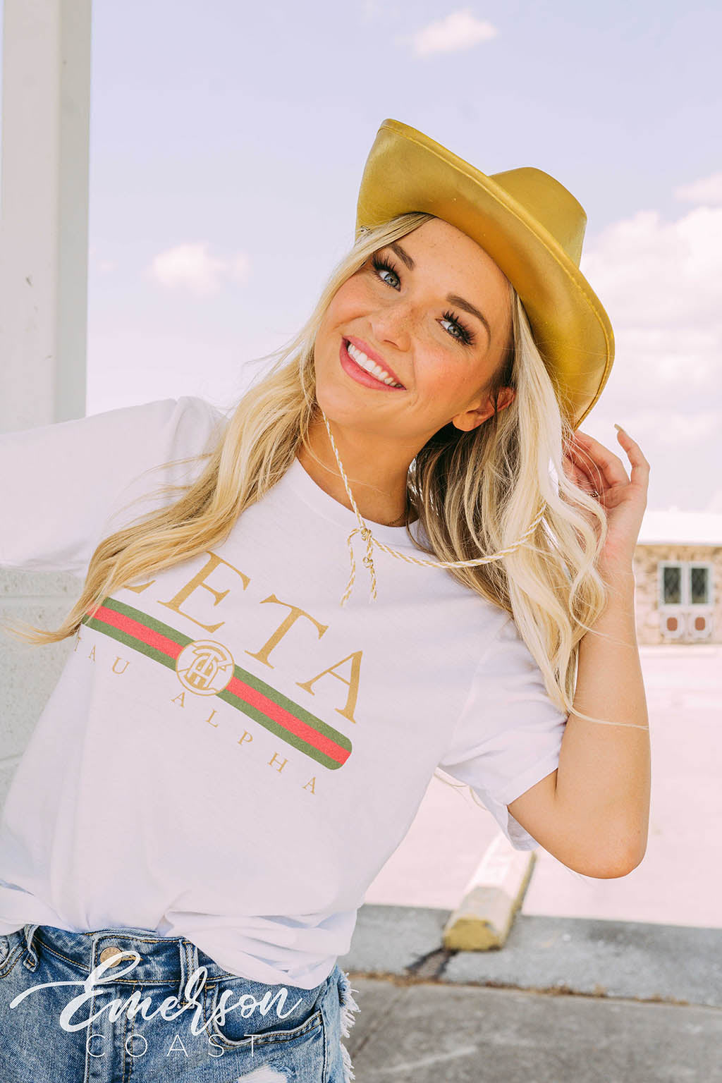 Delta Gamma at Texas A&M kept things timeless with custom white letter jerseys featuring bold Greek letters, paired with crisp white tanks for Bid Day. Clean, elevated, and full of spirit — their new members definitely felt the love in style!