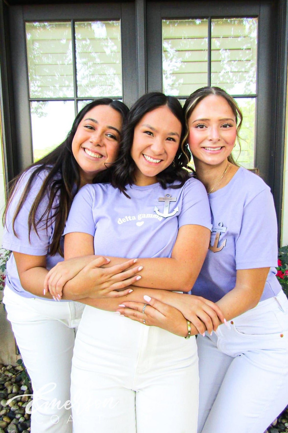 Delta Gamma at Texas A&M kept things timeless with custom white letter jerseys featuring bold Greek letters, paired with crisp white tanks for Bid Day. Clean, elevated, and full of spirit — their new members definitely felt the love in style!