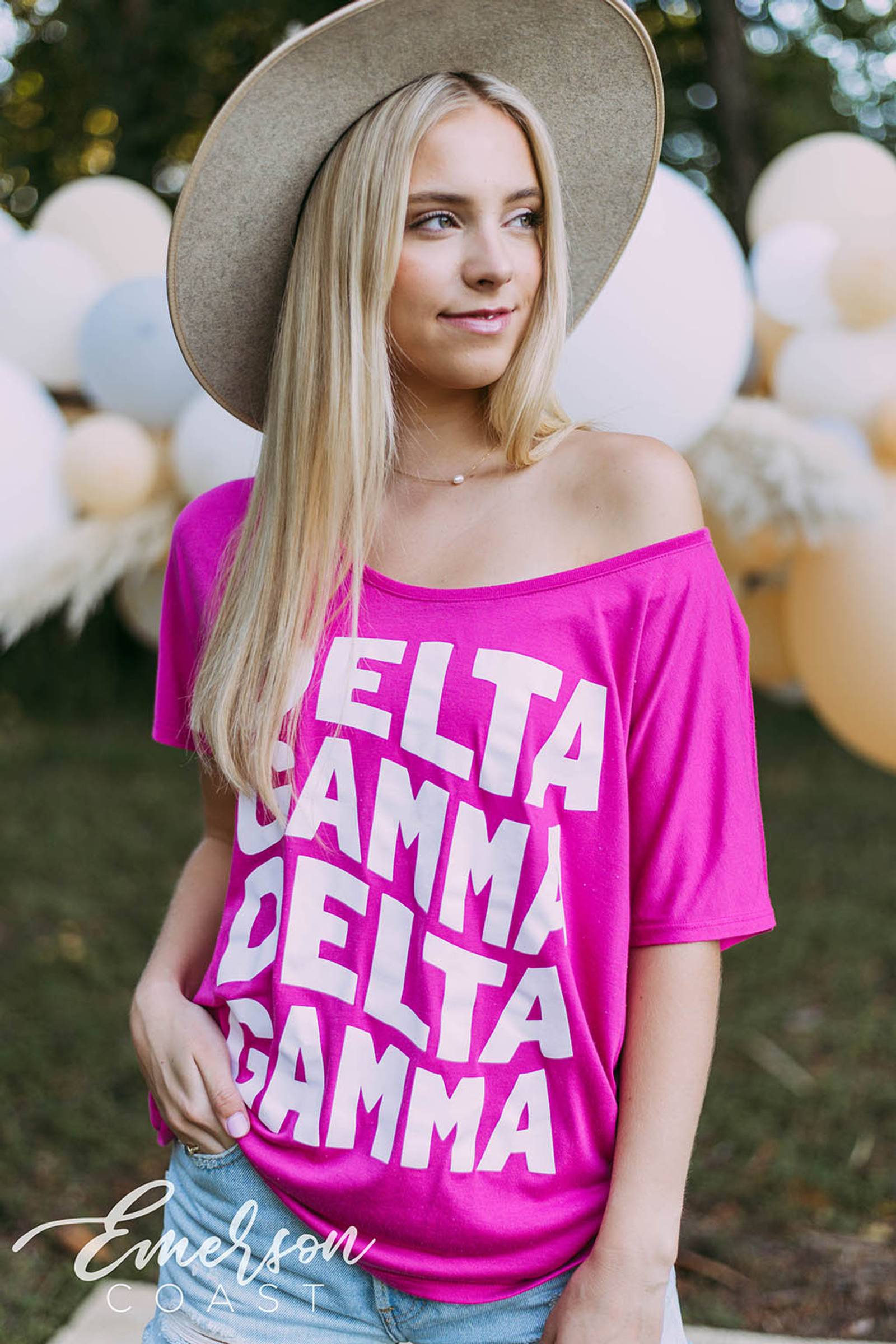 The slouchy neck is so comfortable, yet so stylish. This tee is perfect for any occasion and is versatile for any sorority event.