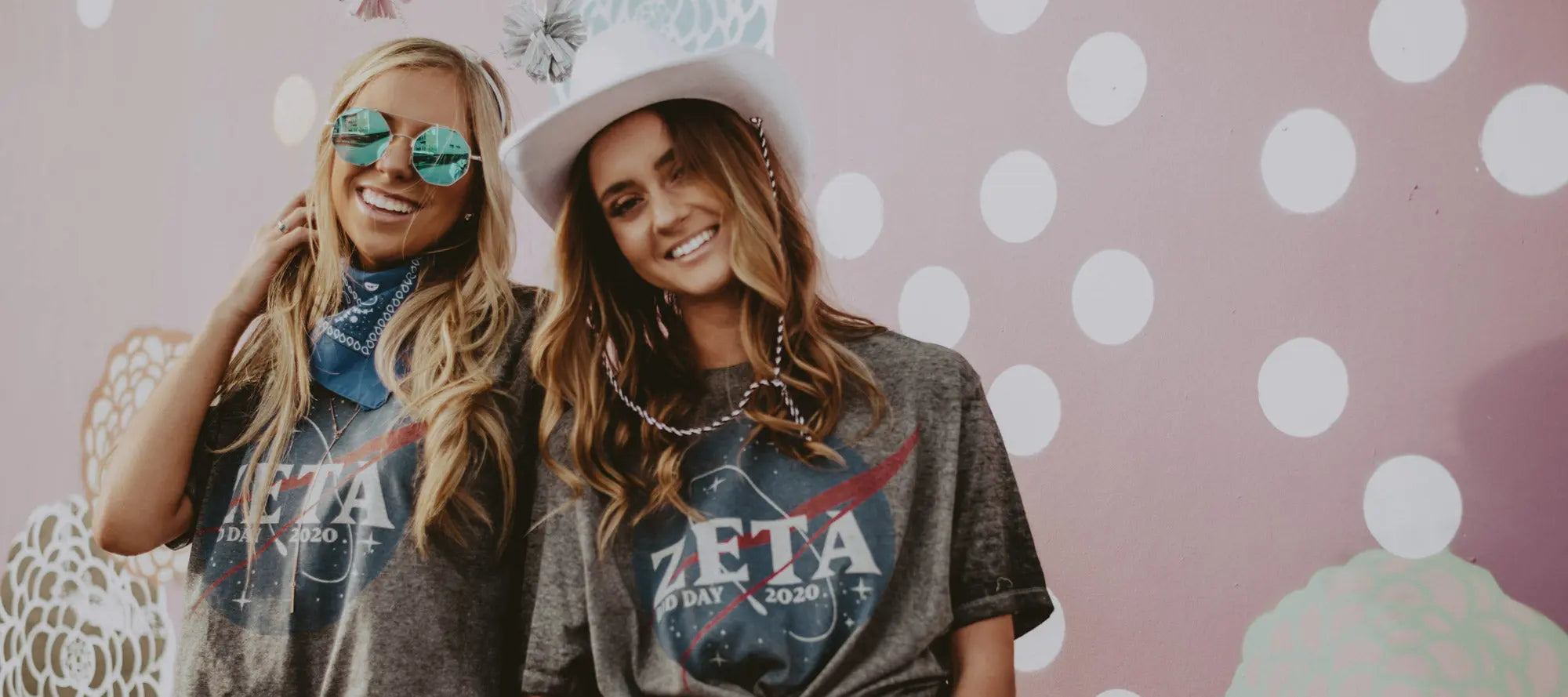 These designs are here for your inspiration so you can make t-shirts your chapter will LOVE. We can turn any of your ideas into a tee, all designs and styles are completely customizable to your sorority! Lovin all the Space Tees but want the words personalized for your chapter? EASY! All about the space theme, but want a different design? We'll make it happen! Just want something new but not quite sure what shirt style or design you'd like? We're here to help!
