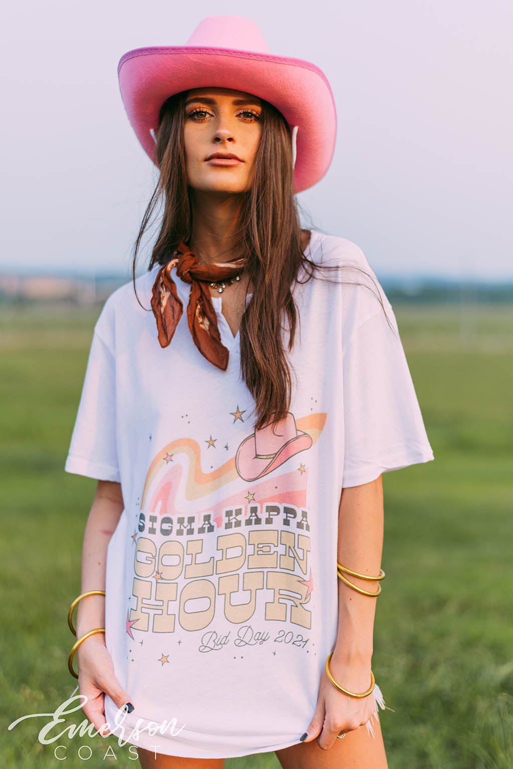 Tri Delta at Arkansas captured the magic of the Amalfi Coast for Bid Day with custom slouchy tees — white for members, cloud blue for new girls. Styled with flowy skirts and neck scarves, the whole vibe was straight out of a summer postcard.