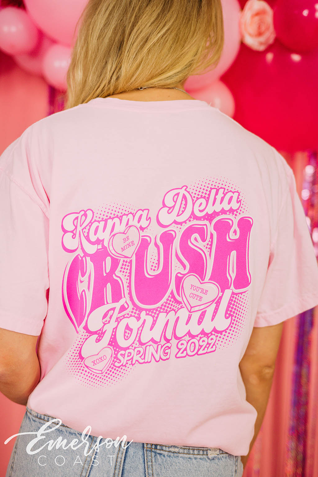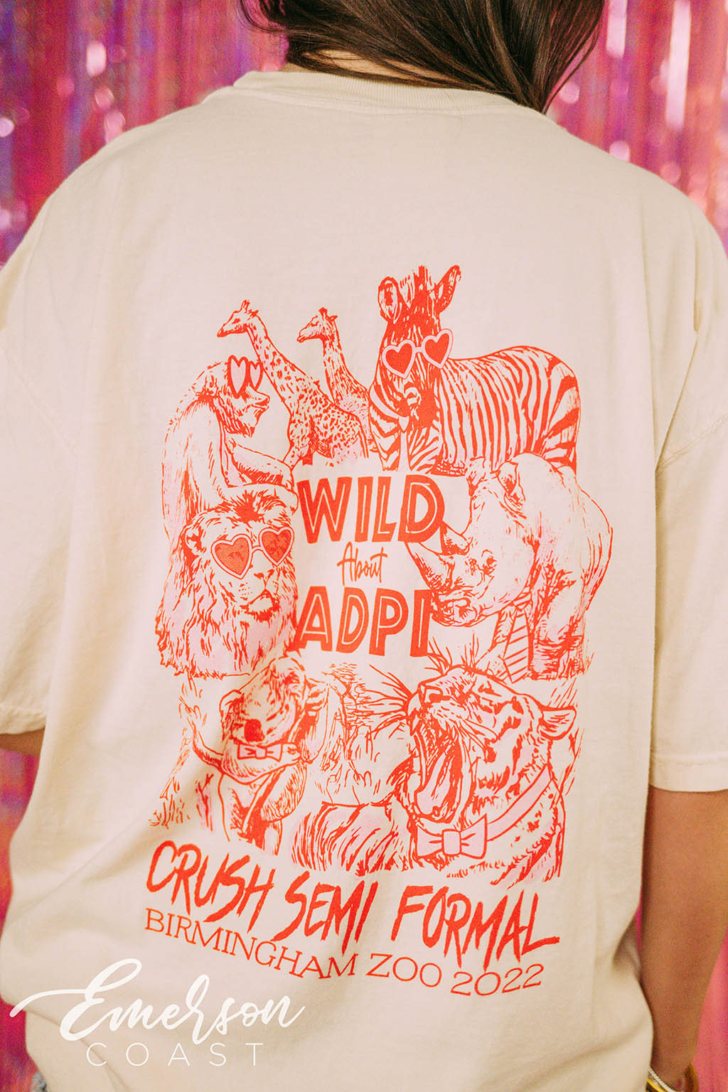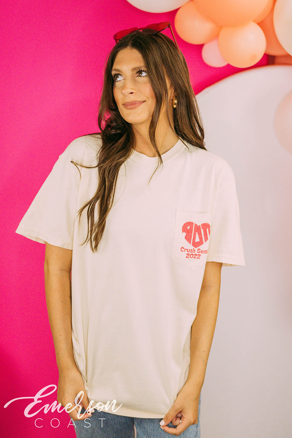 Pi Phi at Auburn made hearts melt with their white baby tees for Bid Day, featuring a sweet red heart and the phrase “I’m so happy we met.” A perfect, feel-good look to kick off sisterhood with major charm.