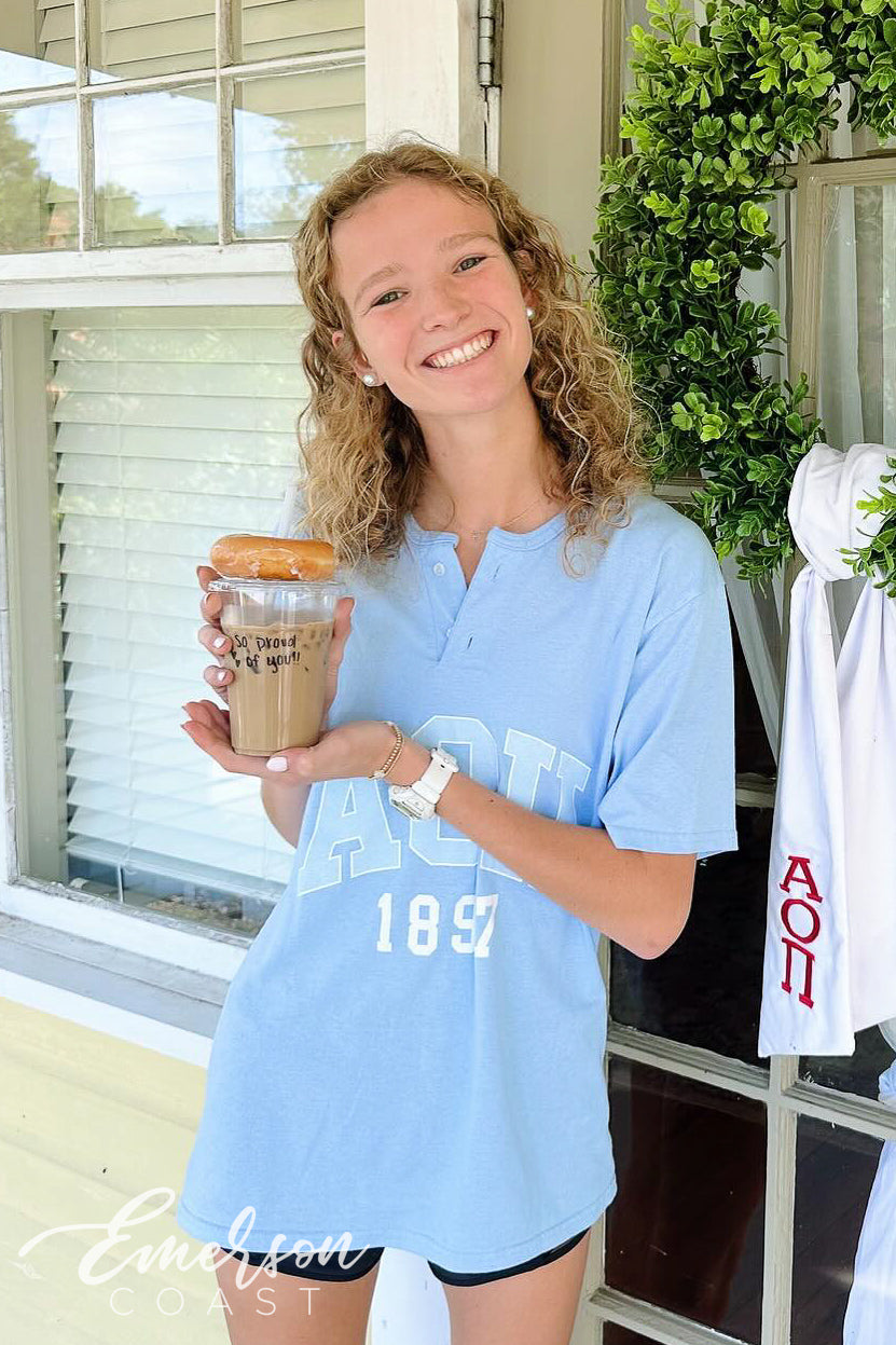 Embrace your sisterhood in style with the Alpha Omicron Pi Huntingdon College Light Blue Recruitment Henley. This charming henley showcases a stunning light blue hue, perfect for making a statement during recruitment events.